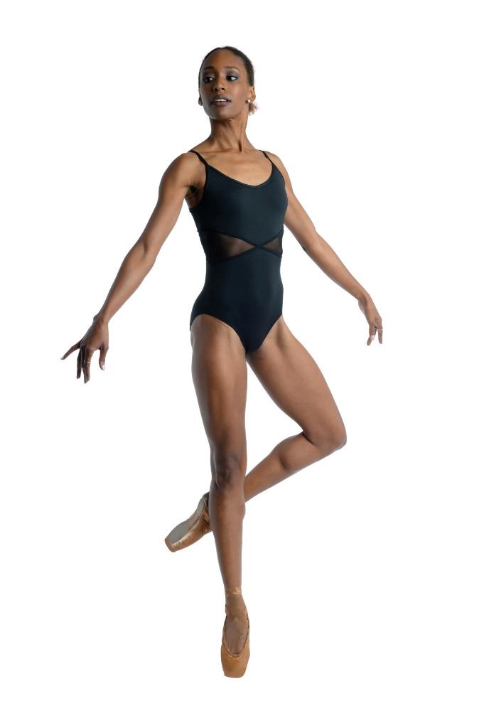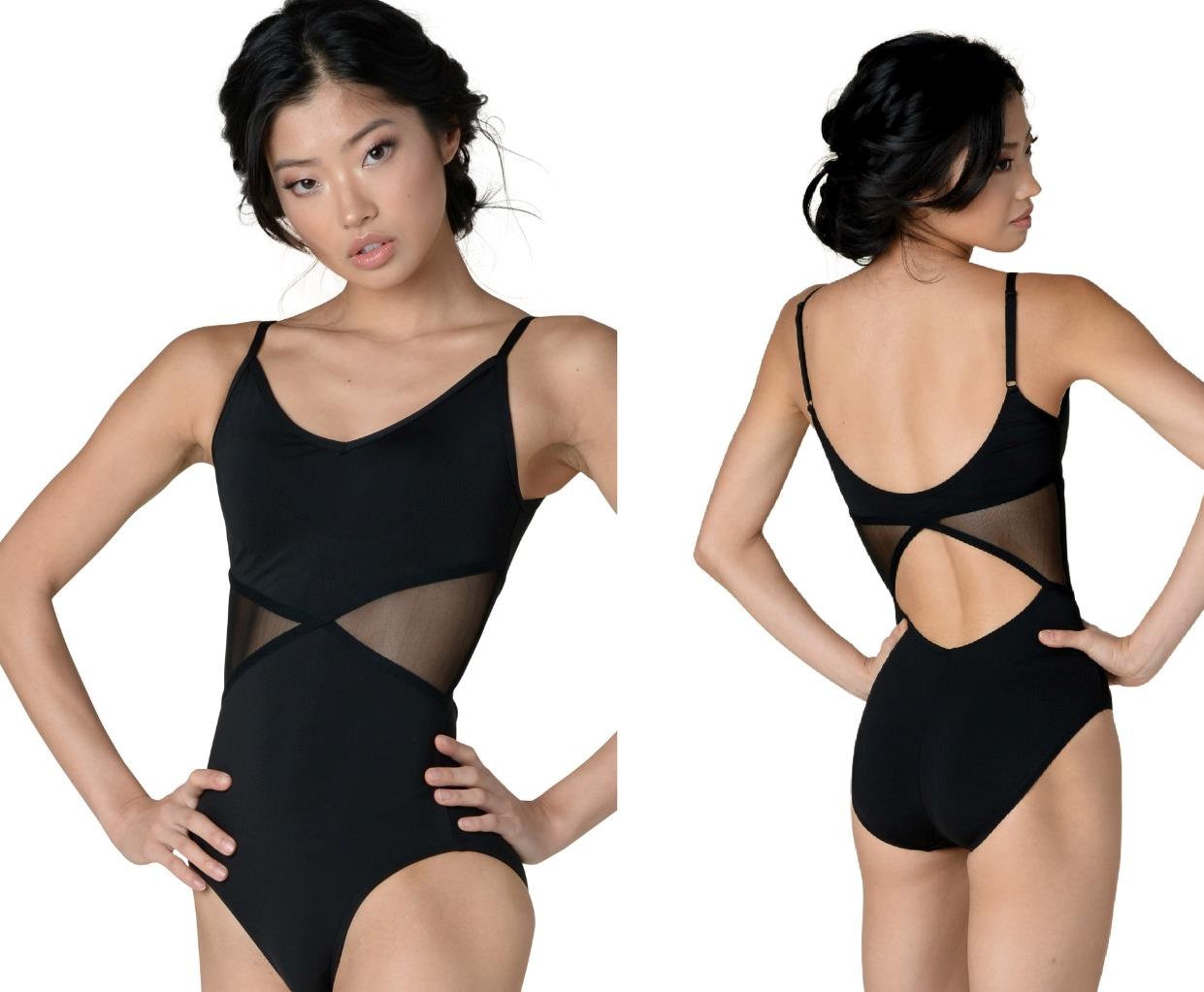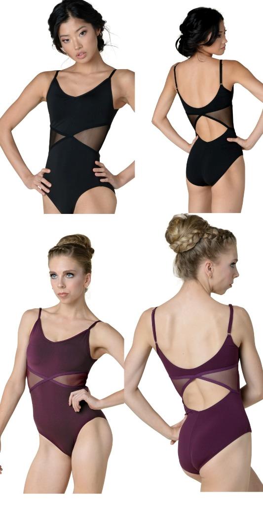 Our "Alexis" camisole leotard features adjustable straps and a mesh midriff insert that circles around the leotard. A flattering back with keyhole opening, completes this stunning performance-ready leotard! Shelf bra with removable cups. Polyester/Spandex