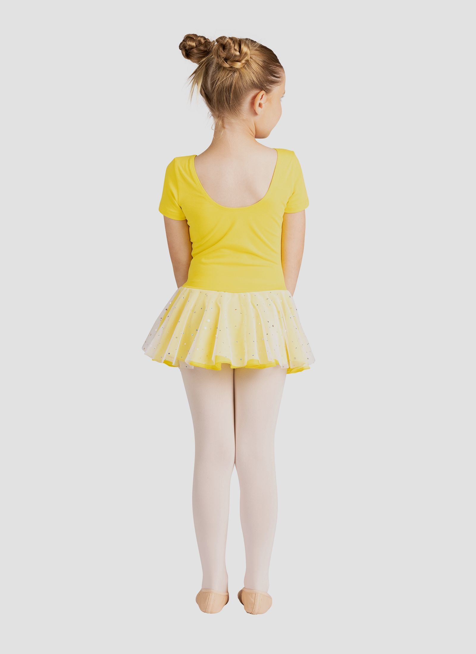 Short sleeve dress features a double layer skirt with sparkling hologram dots on mesh top layer and a solid georgette underlay. Fully front lined.