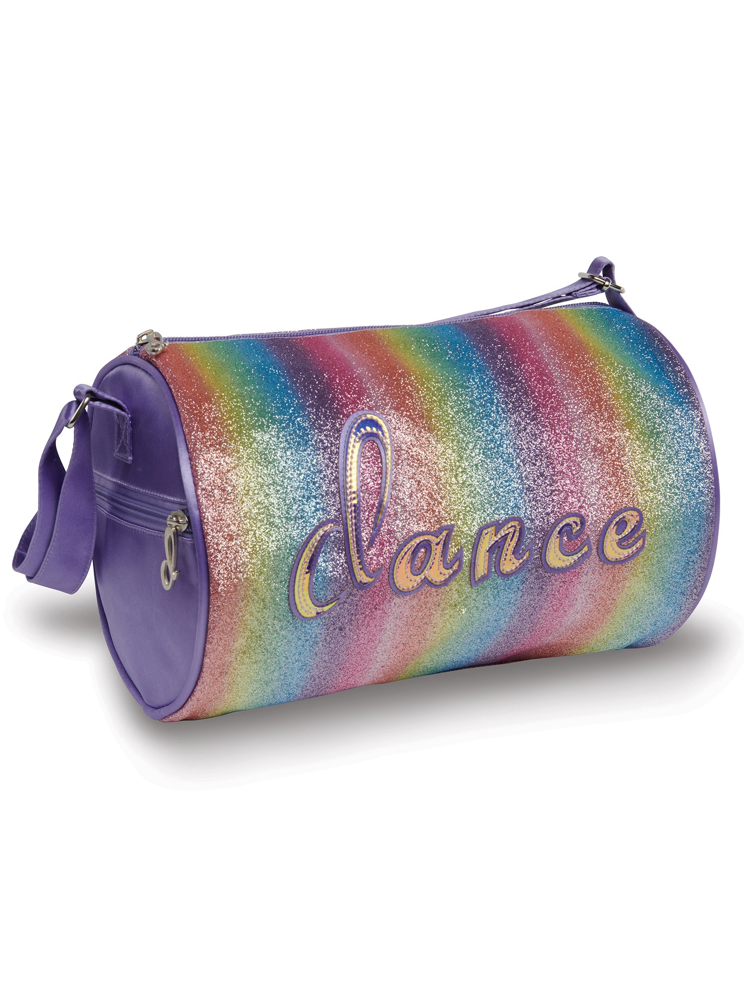 Glitter and colorful rainbow colors make this roll duffel bag stand out in a crowd! Features include a "dance" patch on front, full zippered compartment and side zipper pocket. Adjustable shoulder strap makes bag easy to carry. Full lined interior and water repellent exterior, makes for easy clean up. Lightweight and folds flat.