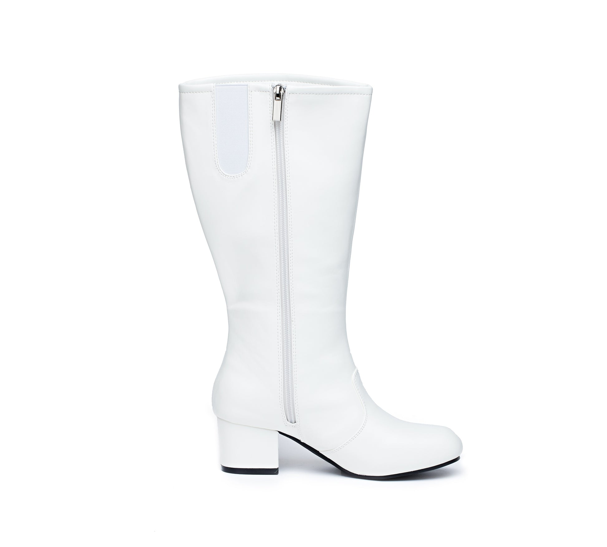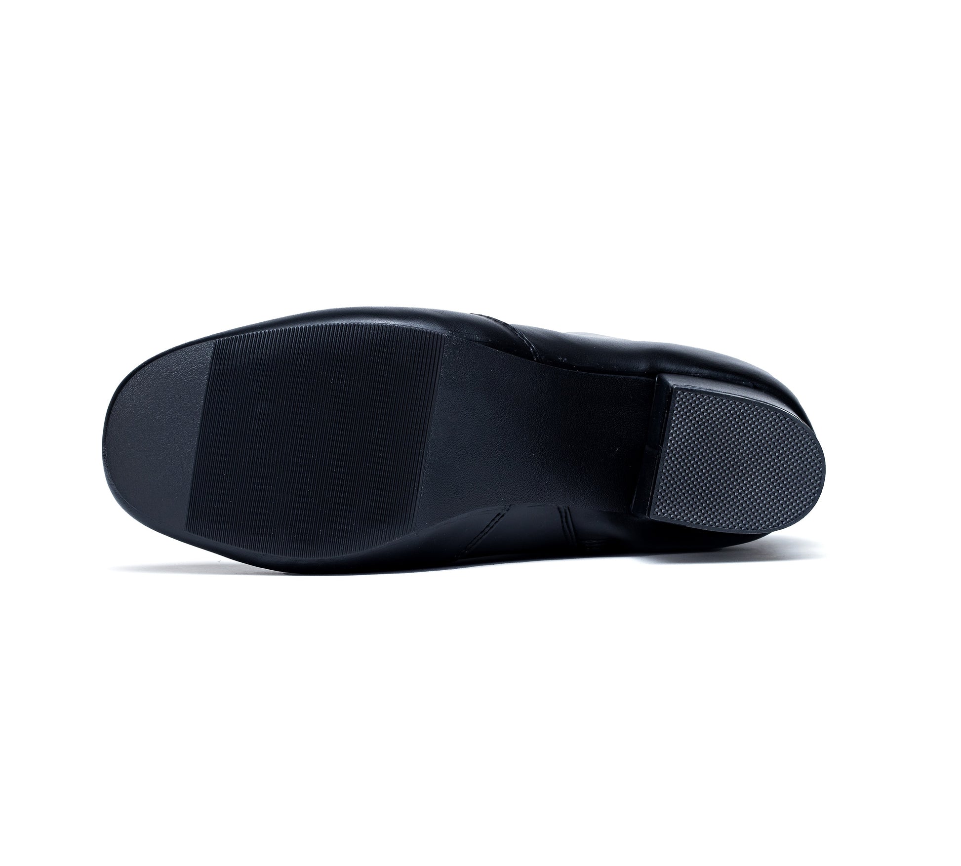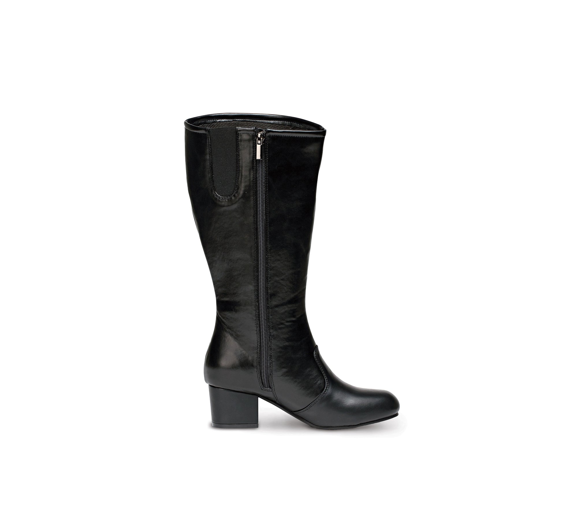 DOLLY 2" BOOT BLACK -Introducing our "Dolly", our new 2" heel knee high boot! Same characteristics as our Dallas knee high boot but with a 2" heel. The soft vinyl upper offers maximum comfort and a sleek appearance. The soles are especially designed for comfort, traction and durability and the cushioned footbed is shock absorbent which adds to the overall comfort of this boot. An elastic gore insert on top of boot stretches to accommodate most calf sizes. Boot is fully lined. Fitting: Same as street shoe to a half size larger.