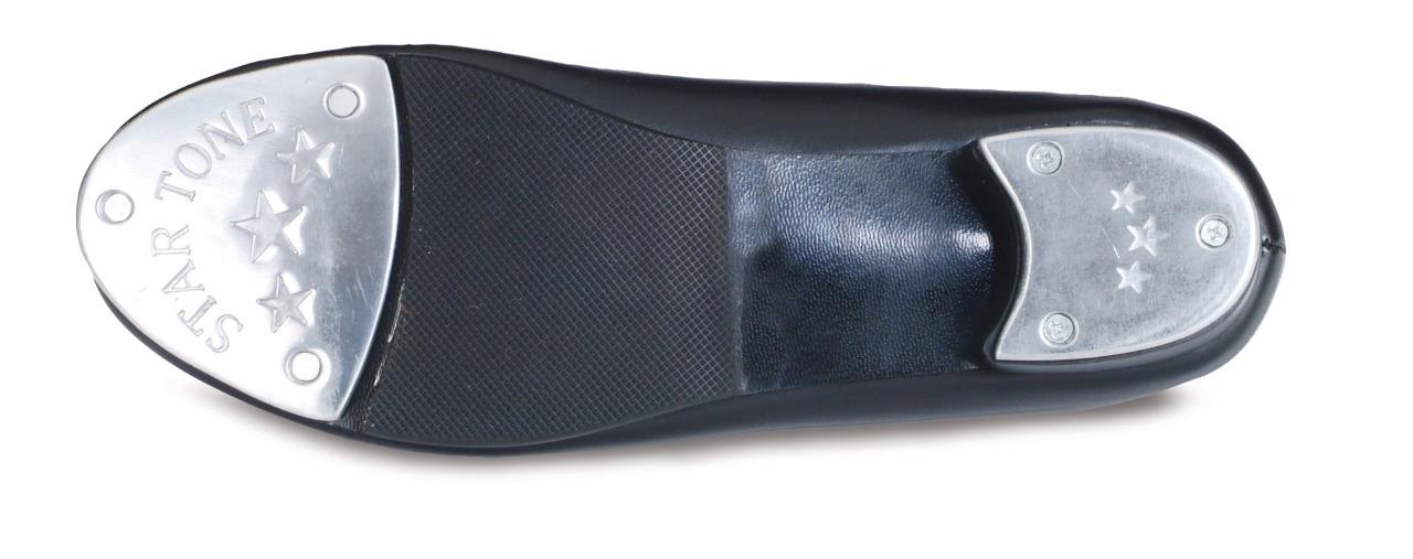 Features: Man made soft imitation leather upper. Padded sock liner and cushioned heel bed. Man made sole with nonskid traction pad. Star Tone toe and heel taps are secured with resonating boards.