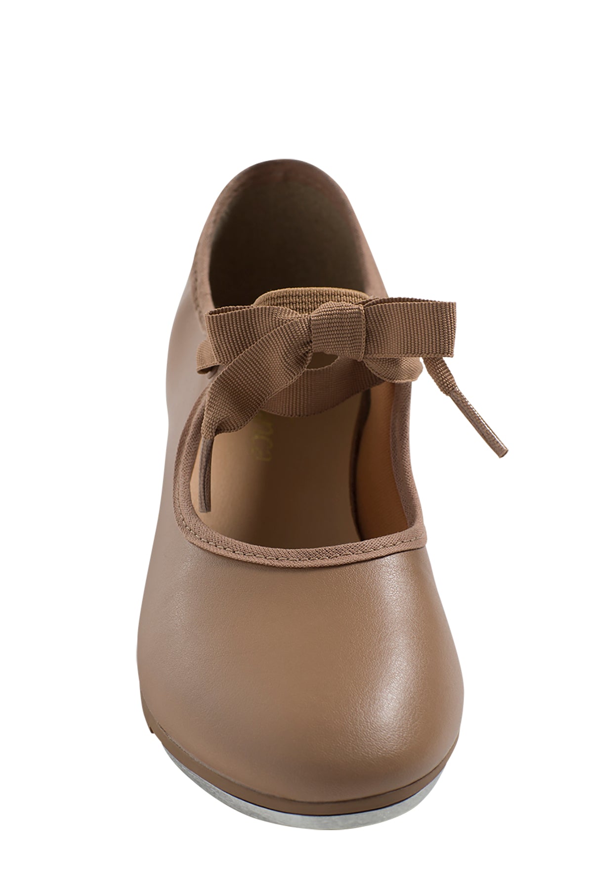 Man made upper and sole with sewn in elastic and grosgrain ribbon ties for a more secure fit. Full length padded plush sock lining. Cushioned heel counter for extra comfort. Nonskid traction pad. Star Tone toe and heel taps are secured with resonating boards.