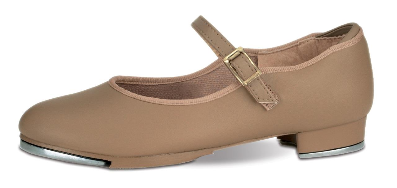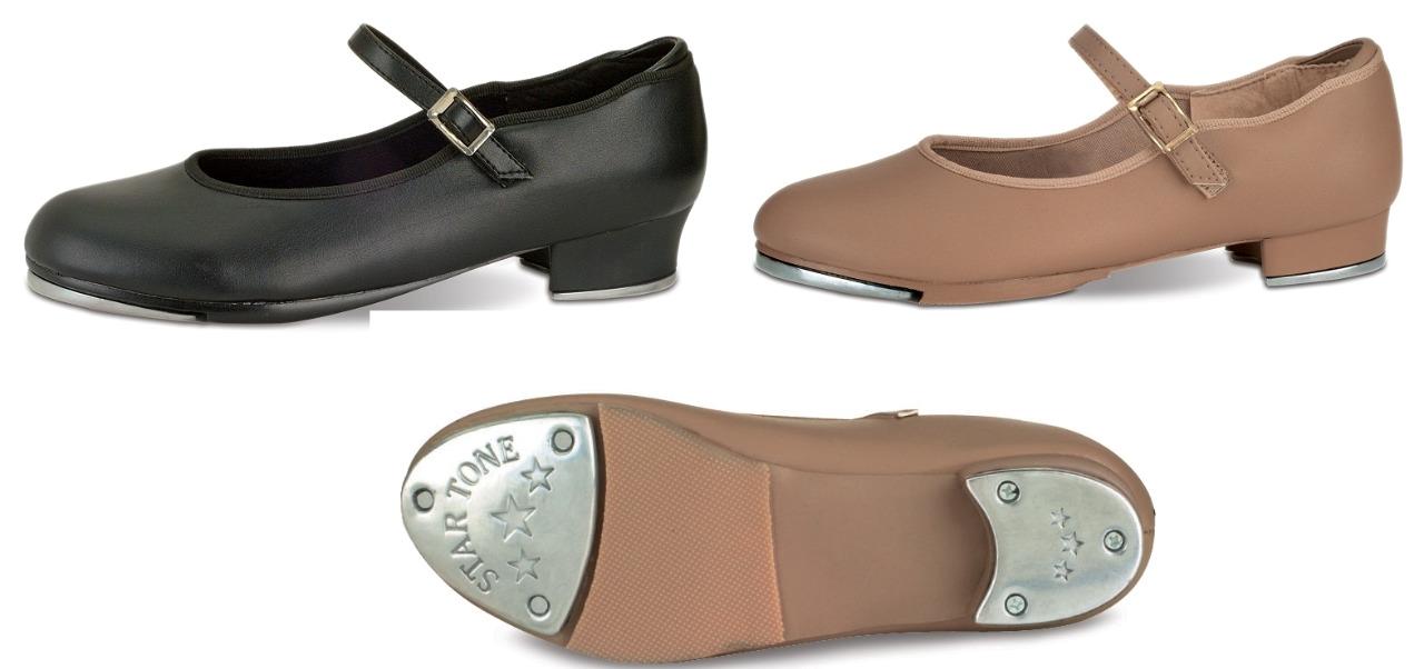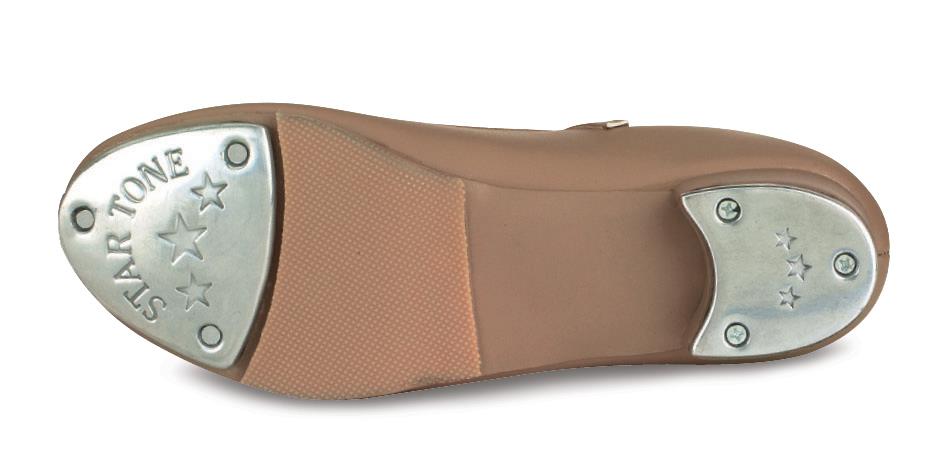 Man made uppers and sole with single strap buckle. Custioned heel counter and sock liner. Nonskid traction pad. Star Tone toe and heel taps are secured with resonating boards. Heel graduates from 1/2" in child to 1" in adults.