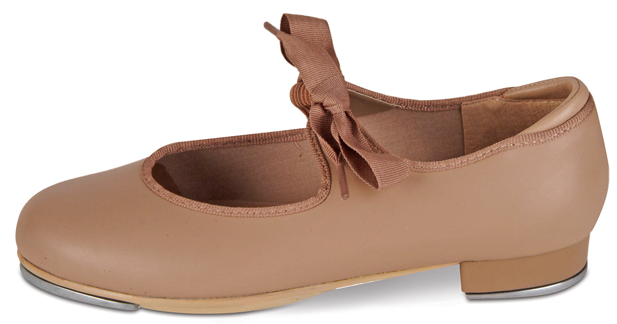 Man made upper and sole with sewn in elastic and grosgrain ribbon ties for a more secure fit. Full length padded plush sock lining. Cushioned heel counter for extra comfort. Nonskid traction pad. Star Tone toe and heel taps are secured with resonating boards.