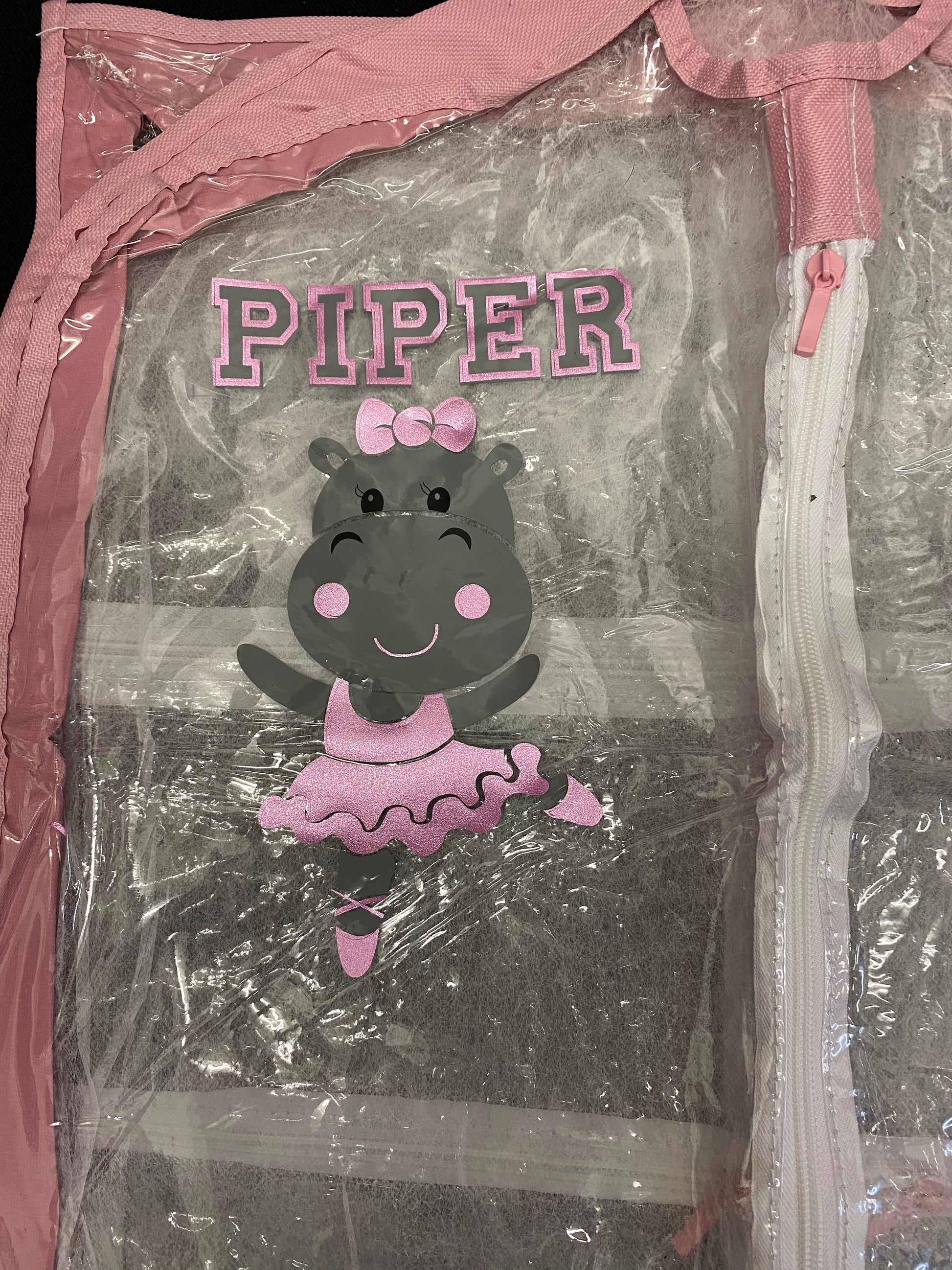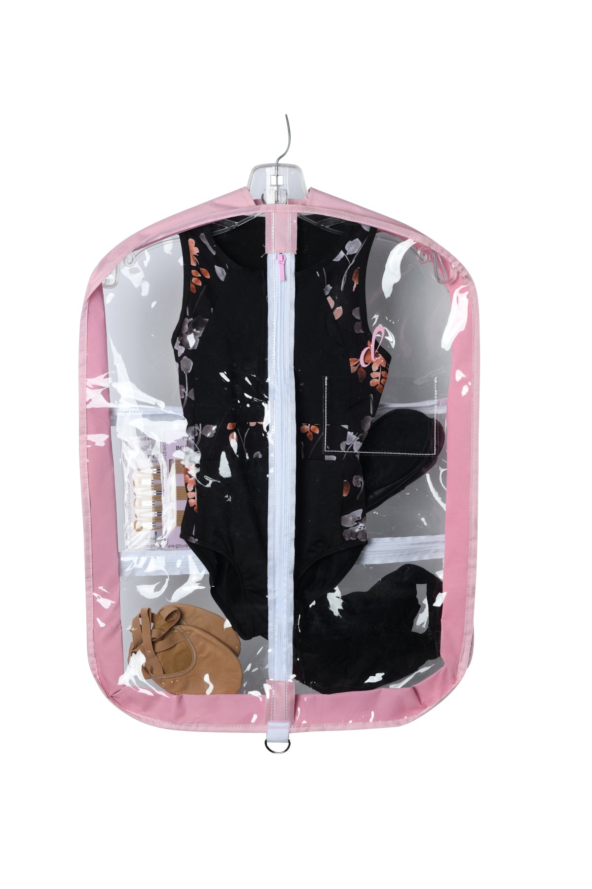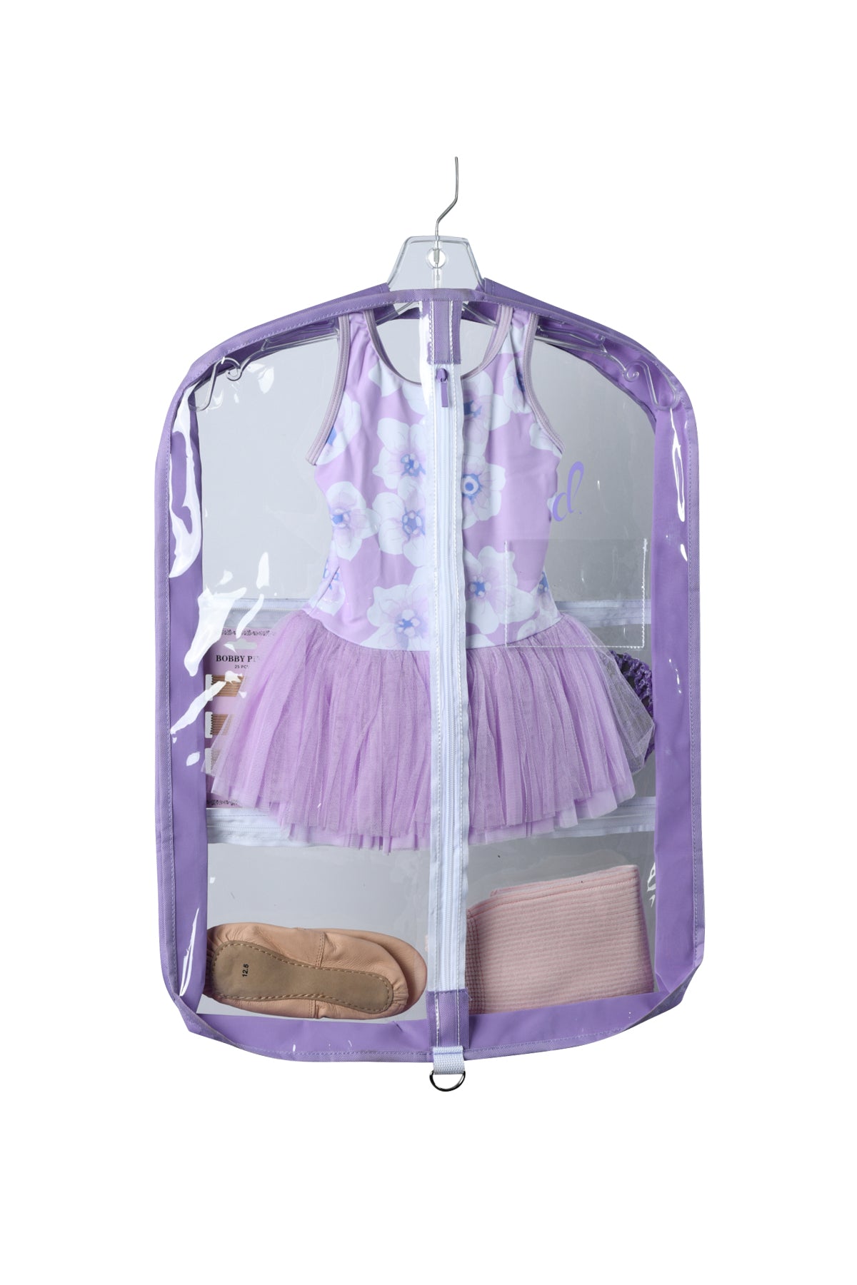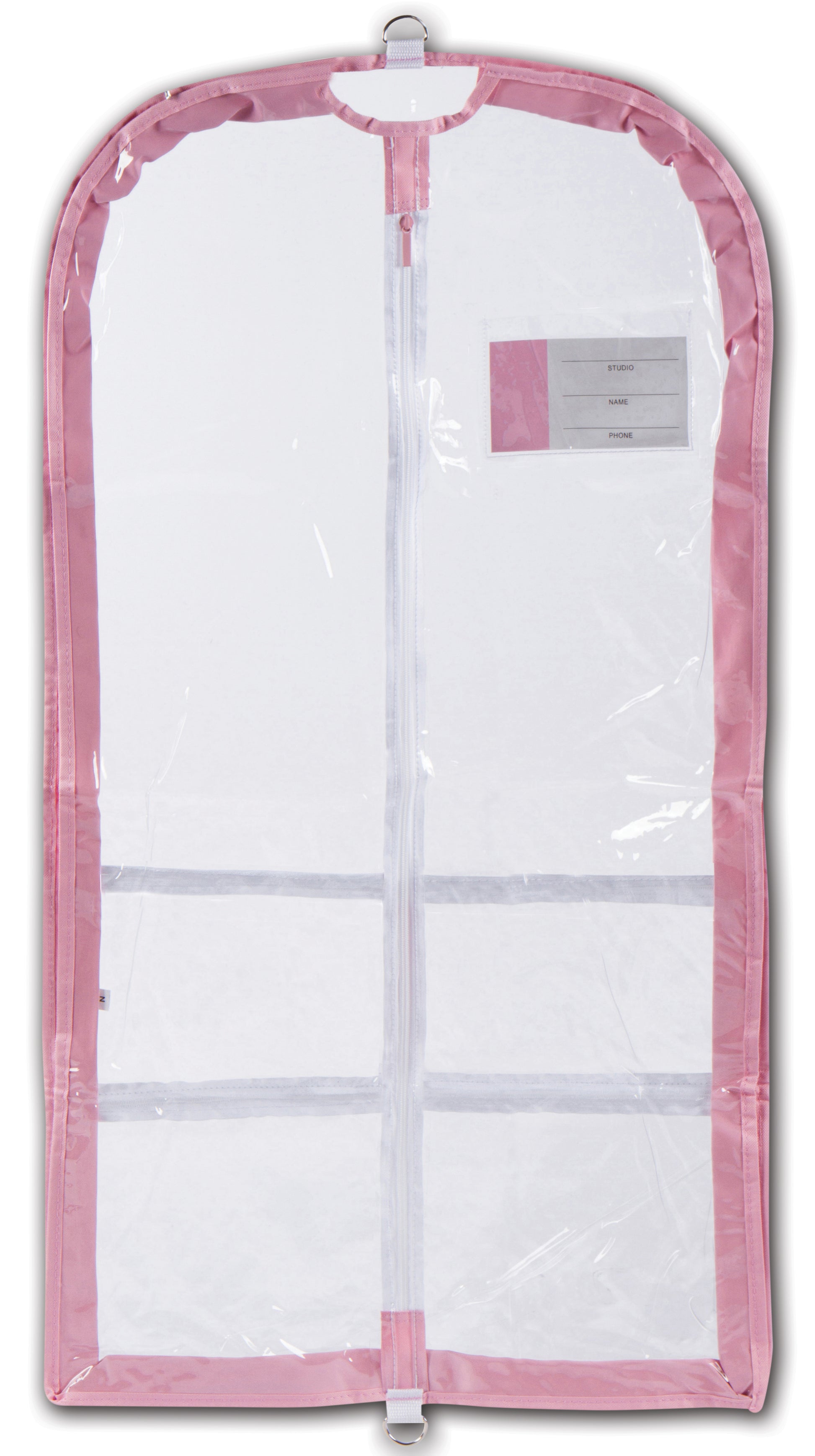 Pink and Lavender - Sturdy pliable PVC garment bag. Three inch expandable gusset accommodates bulky costumes or multiple small garments. Includes three outer pockets, one large and two small for shoes and accessory items.