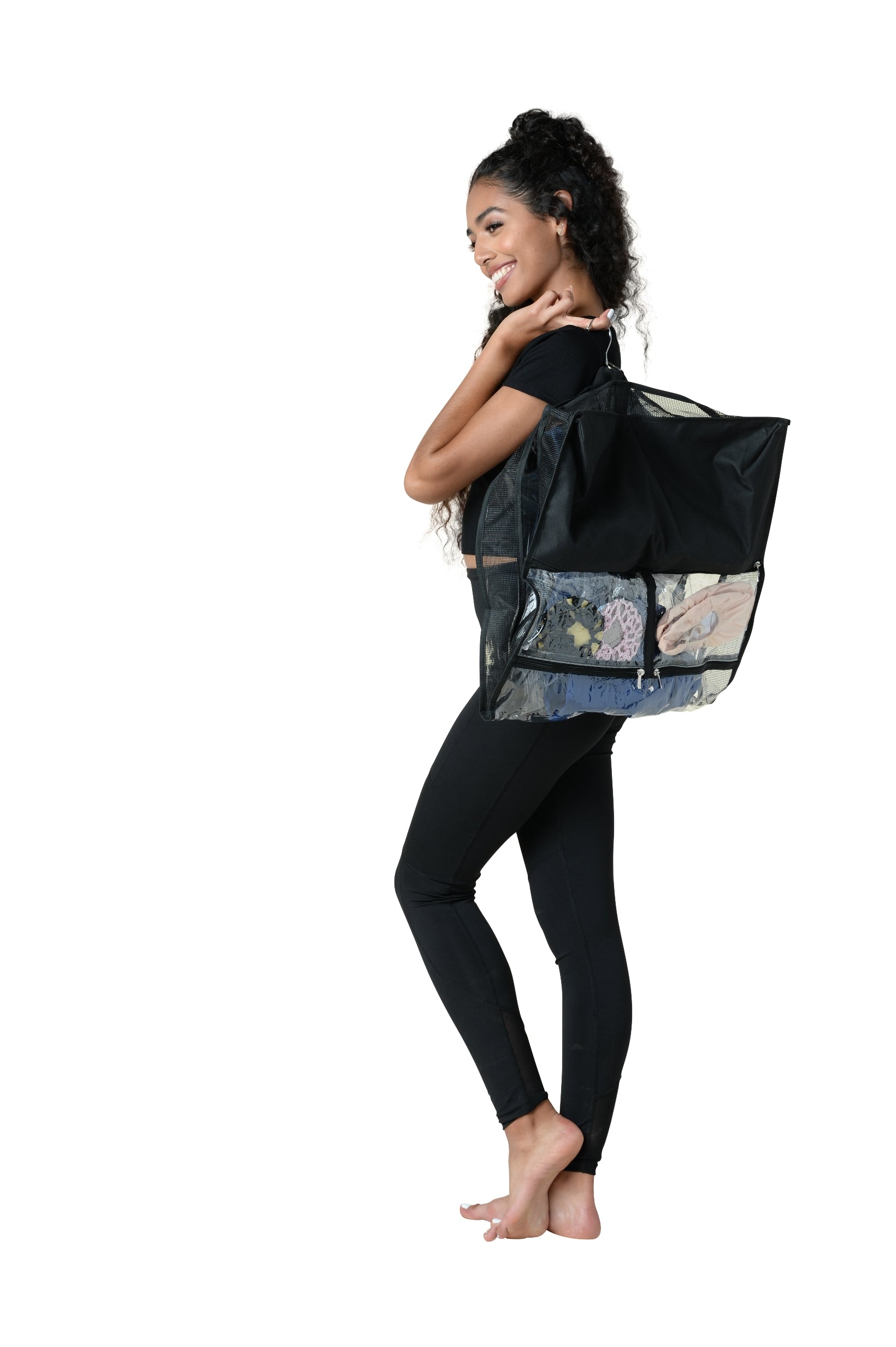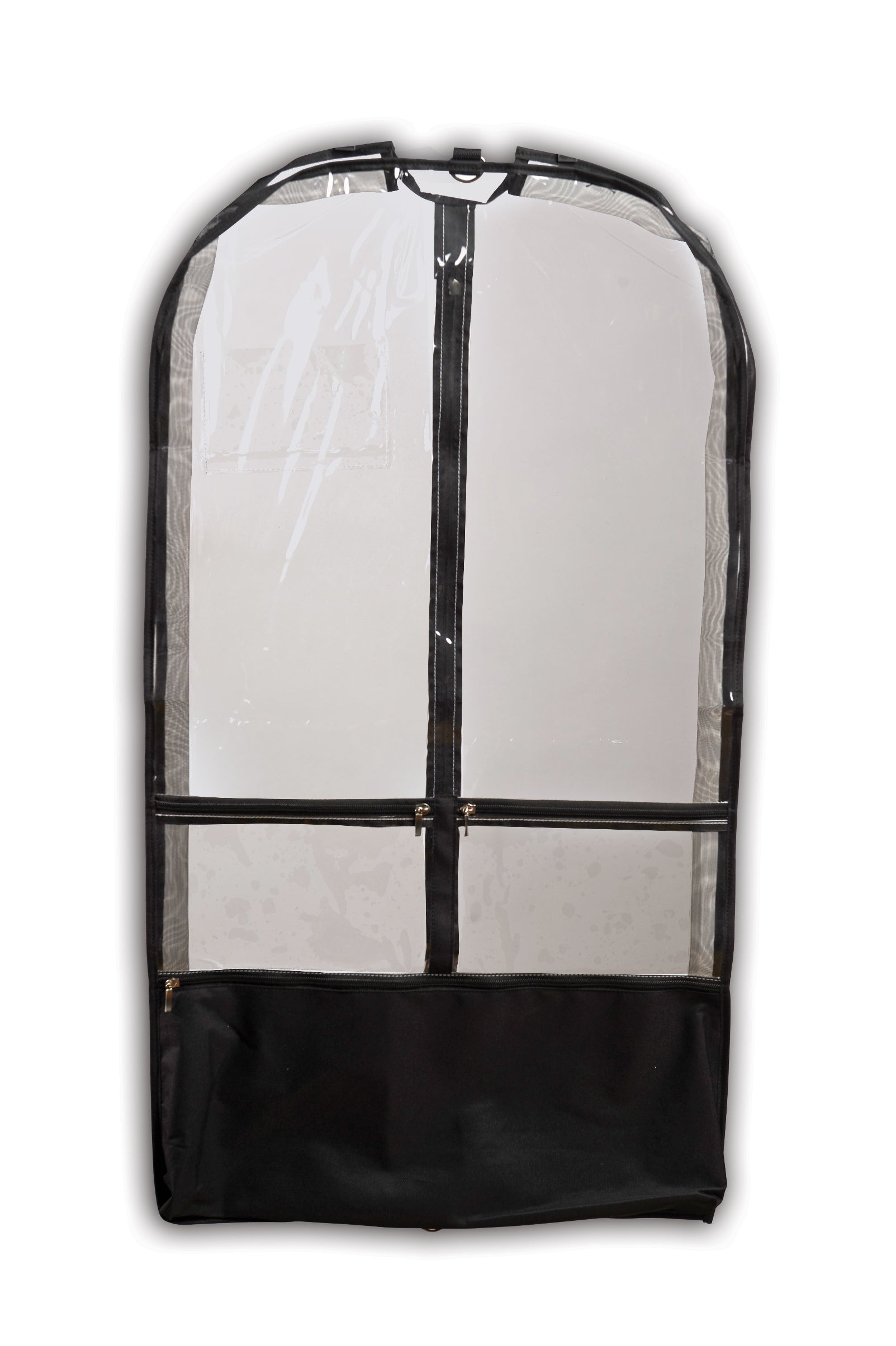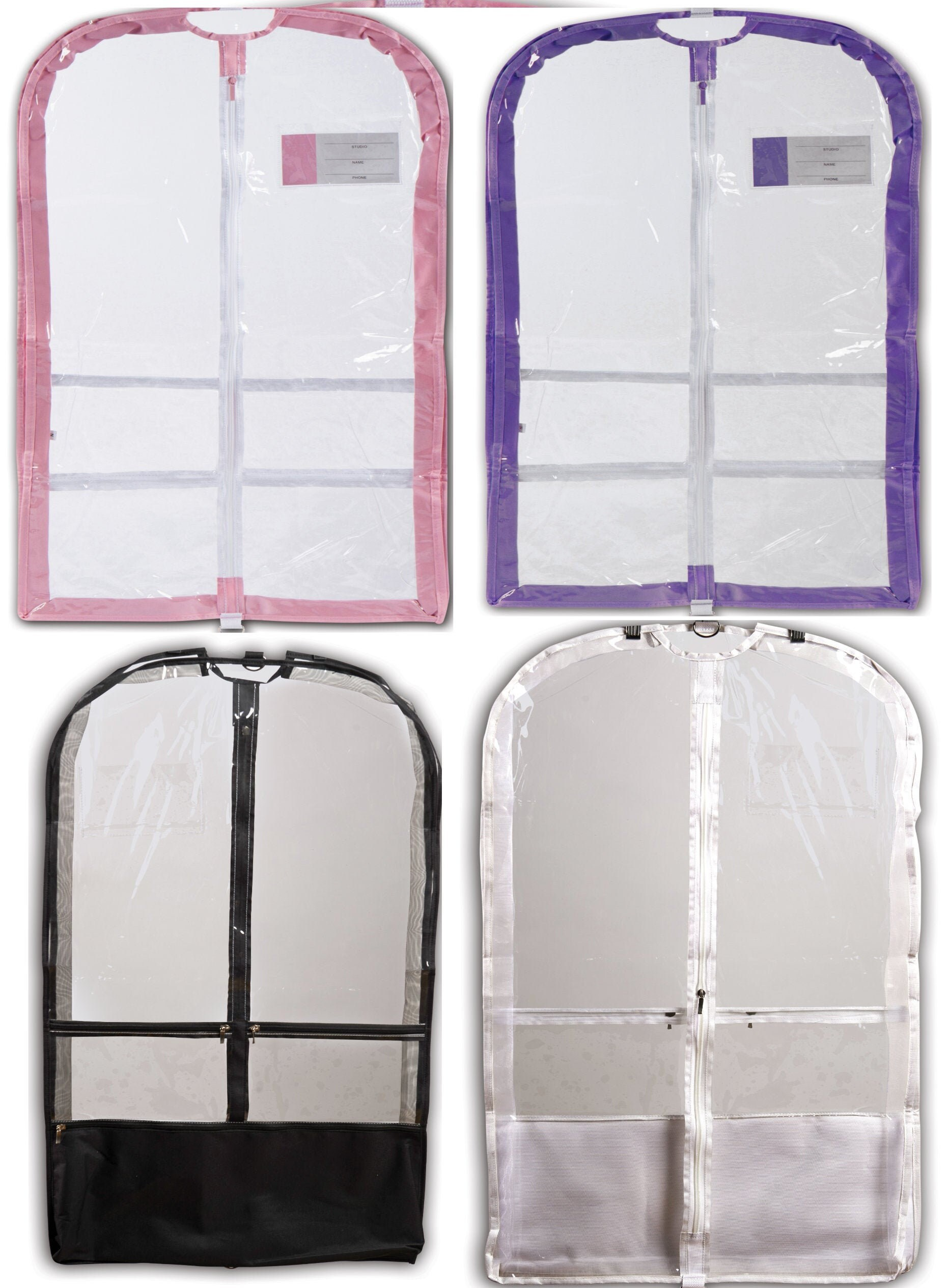 Black or White - Features: Clear garment bag with a 3-inch expandable mesh gusset for breathability. Has 3 exterior pockets including a privacy pocket and ID card pocket. Lightweight and folds flat.