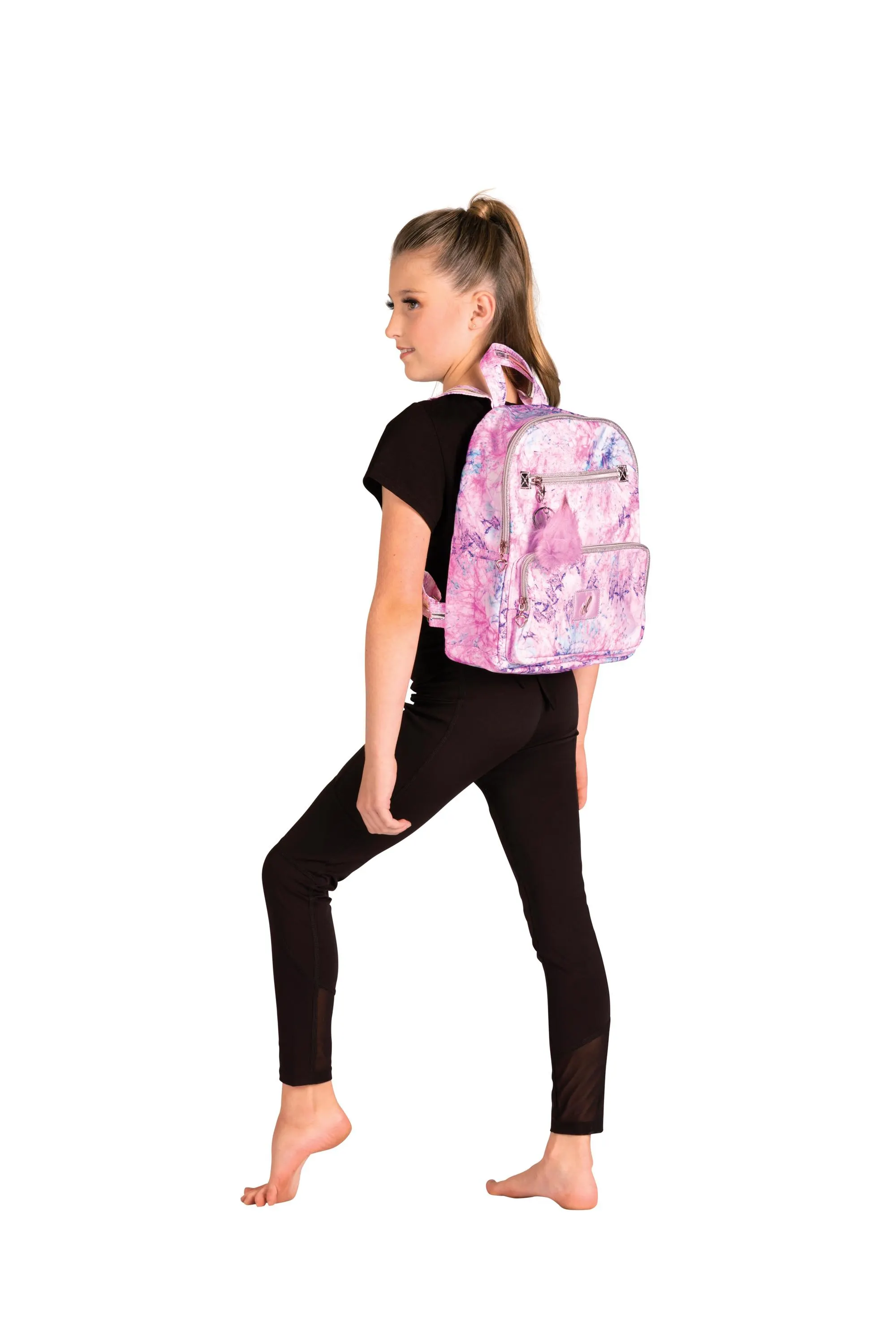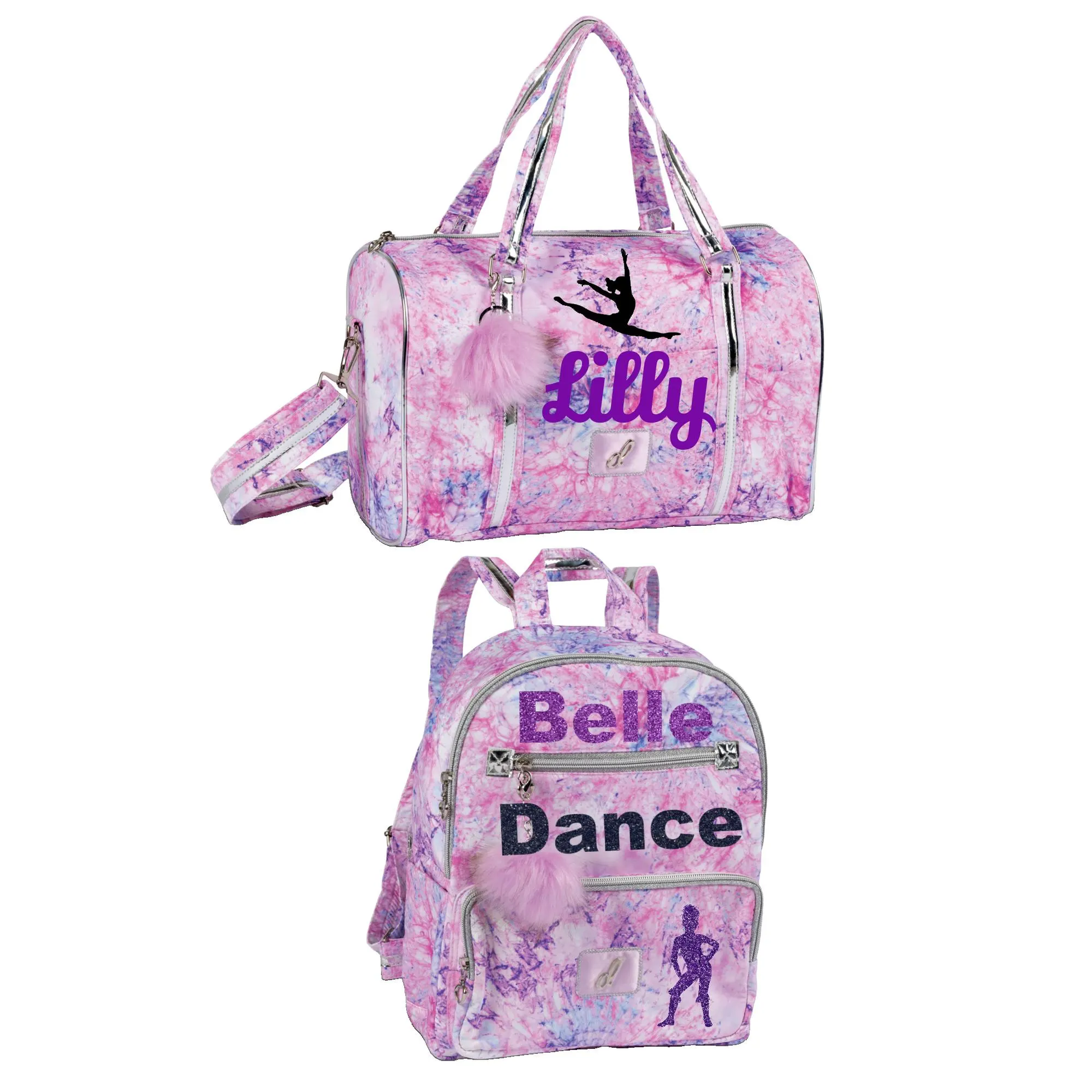 This roomy duffle will hold all your dance needs. A cool psychedelic swirl tie-dye design covers a soft and durable nylon exterior fabrication. Features include a front exterior pocket plus full length inside zipper pocket in addition to double handles and adjustable shoulder straps. Infludes matching pom-pom keychain. This bag wipes clean and folds flat.