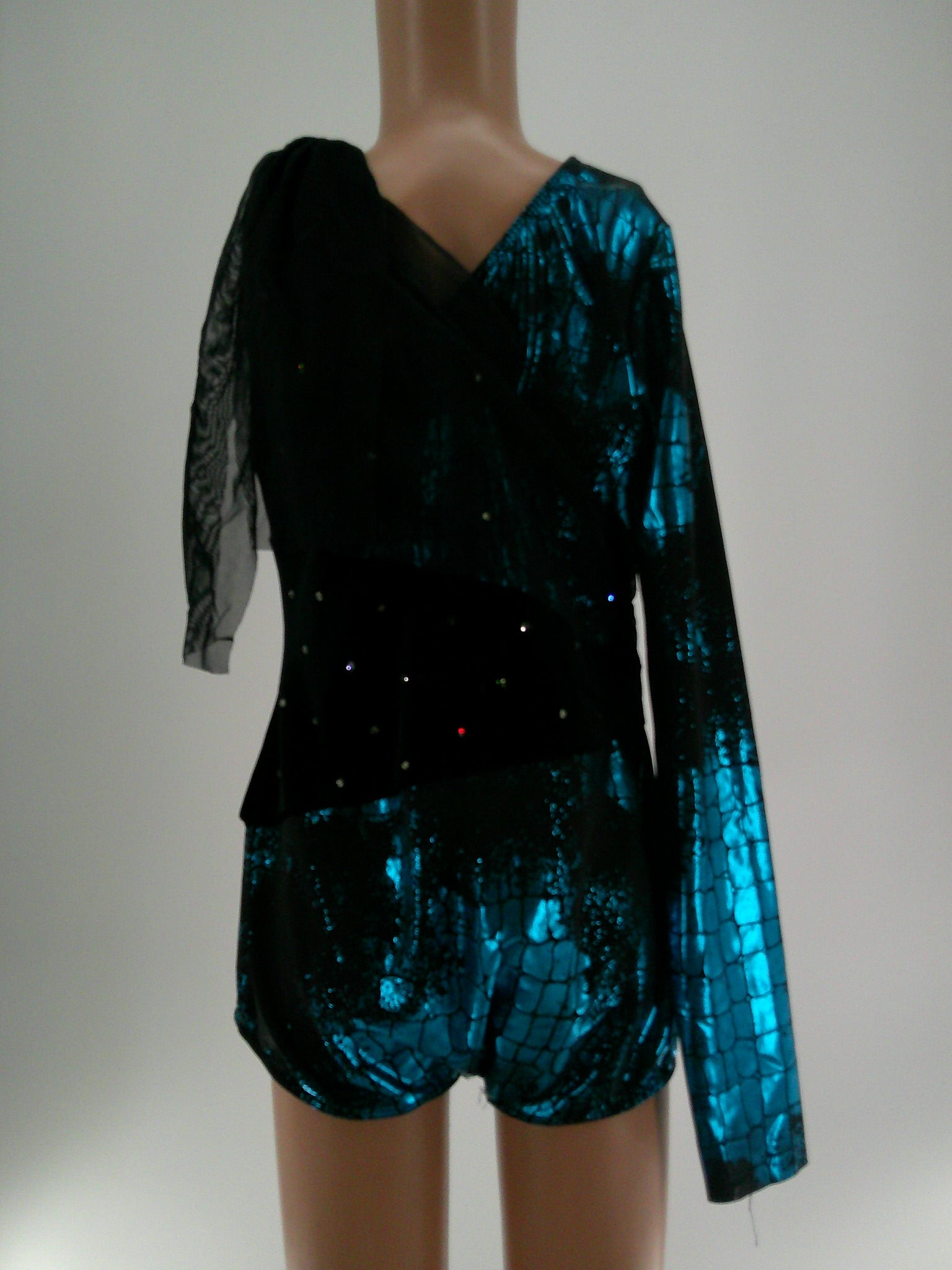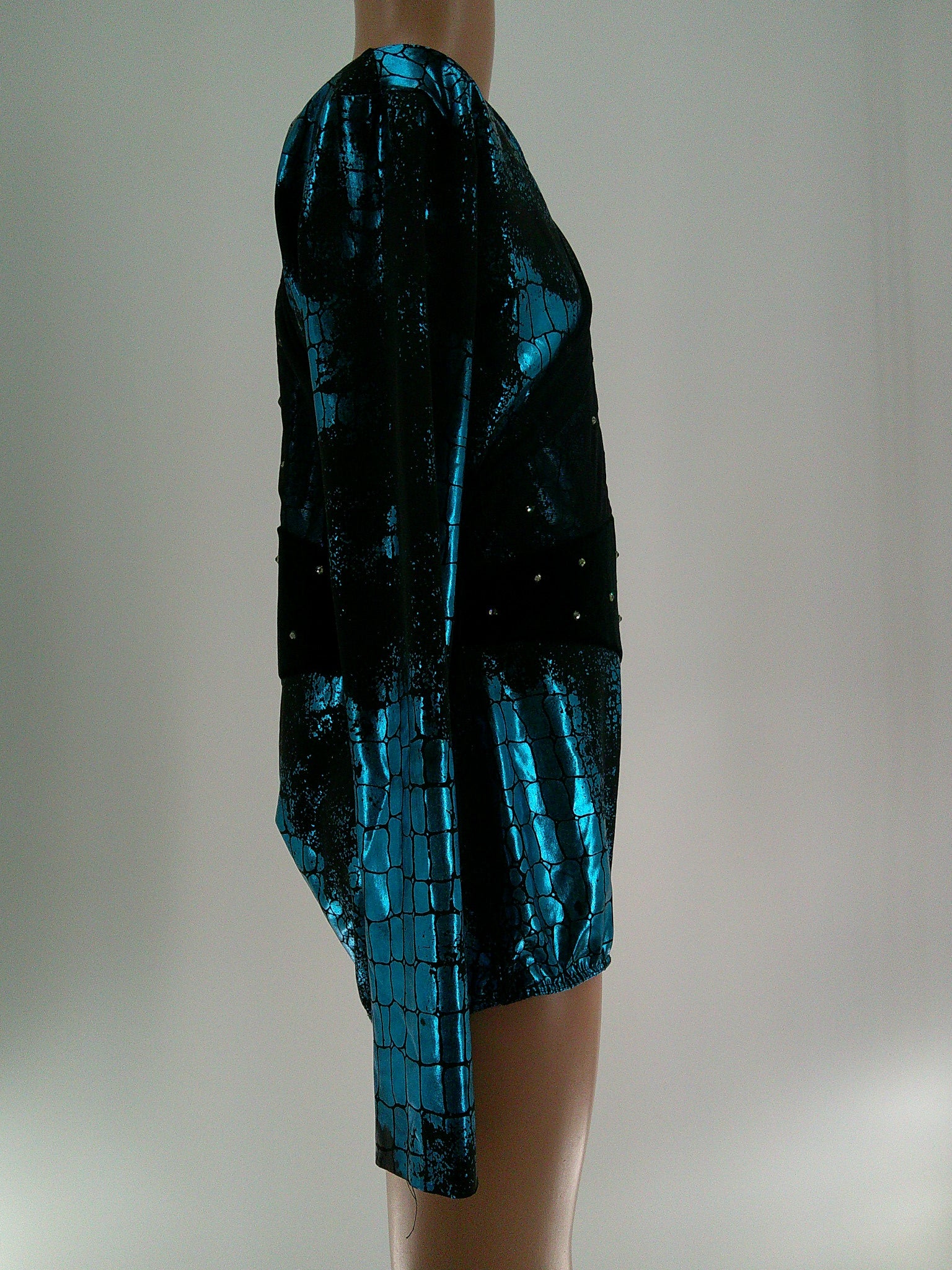 Spandex and velvet leotard with one long sleeve and draping mesh across the left shoulder. Metallic foil print and rhinestones design.
