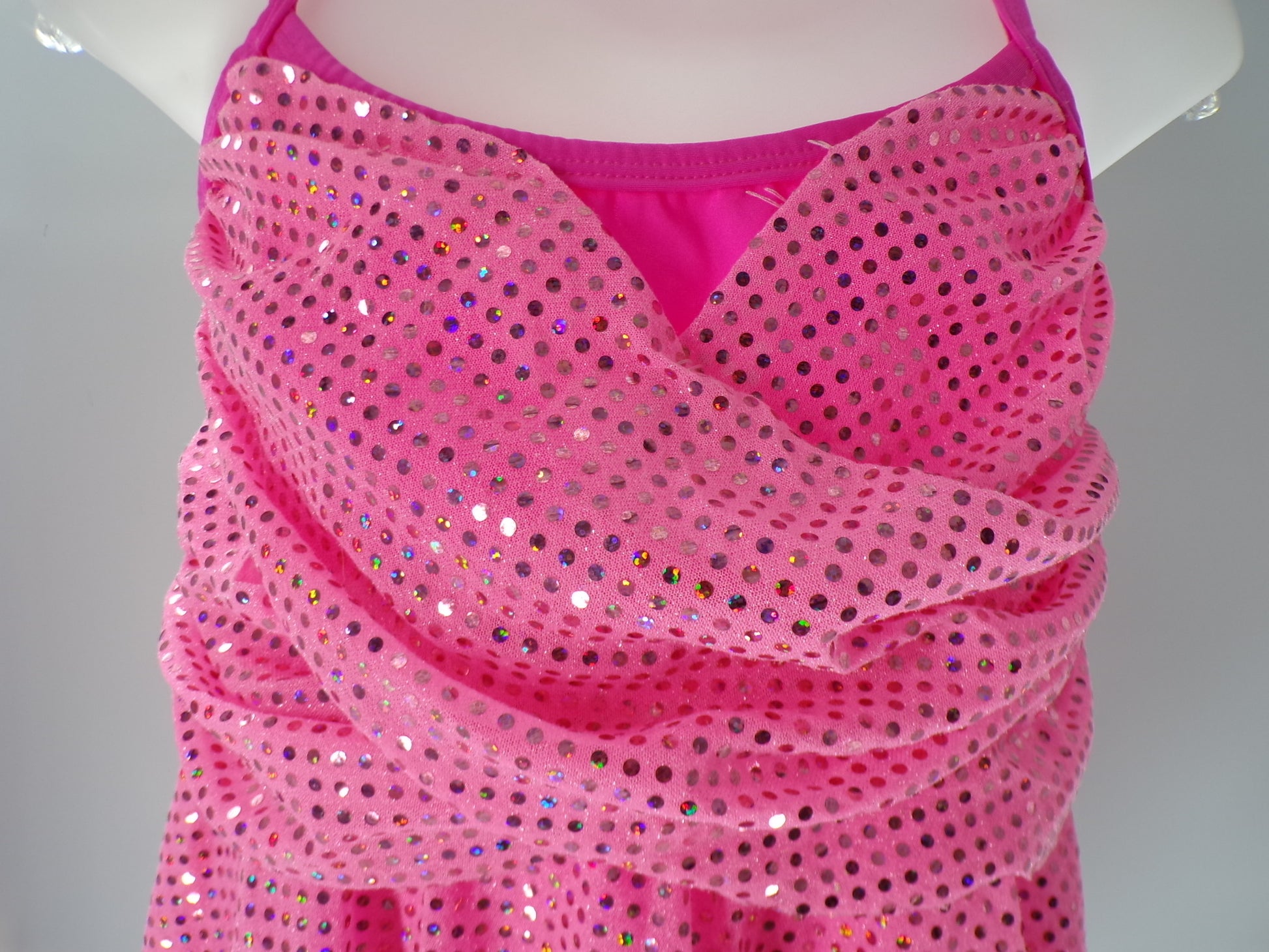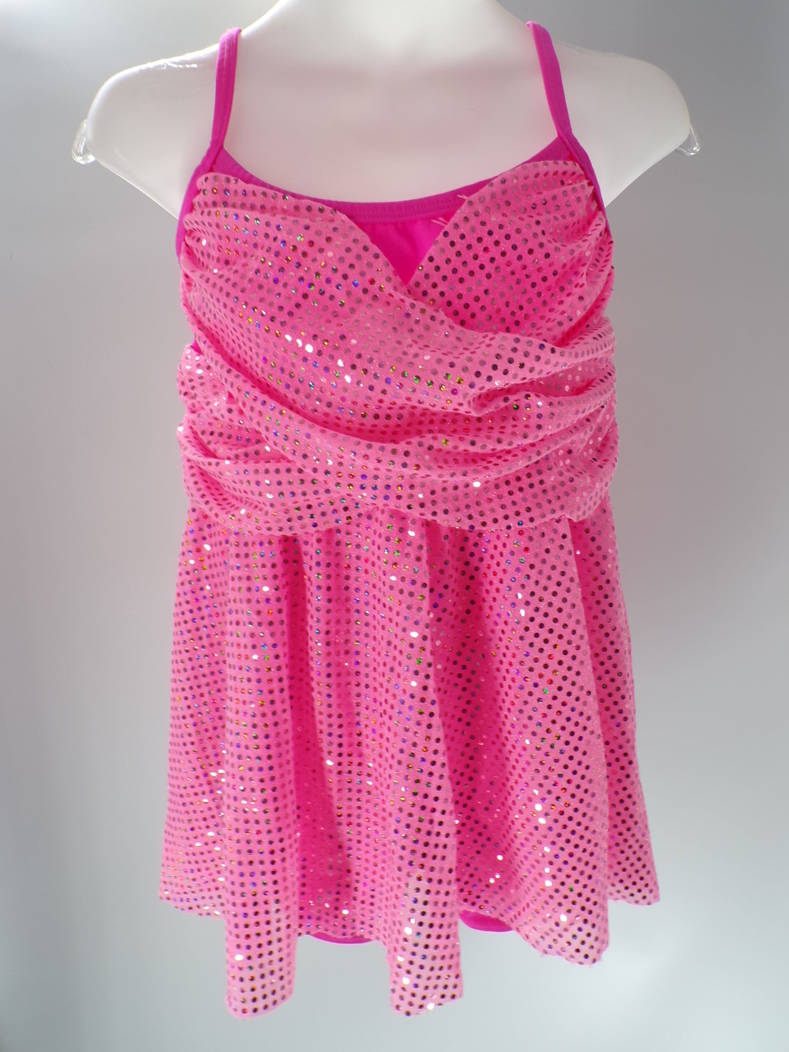 Biketard with attached handkerchief skirt. Foil dot sequins.