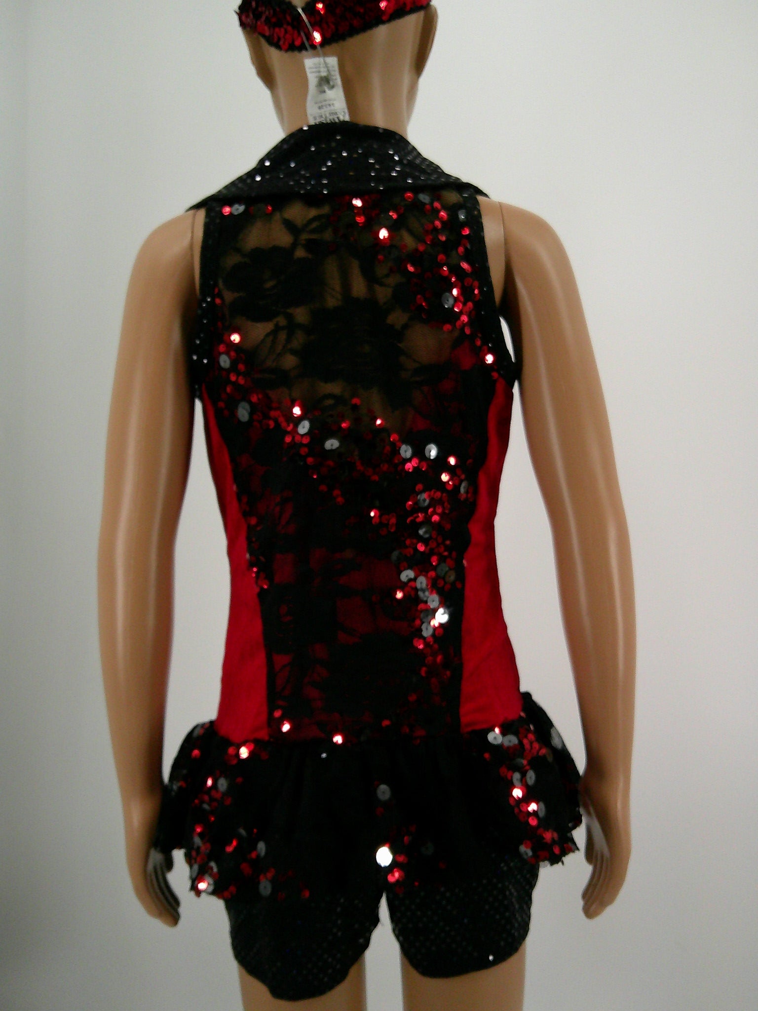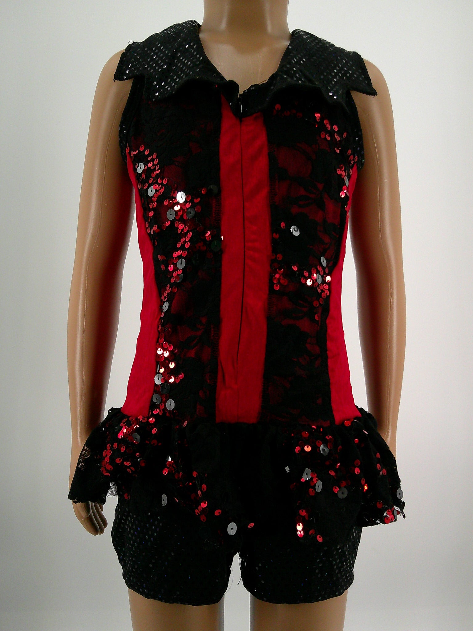 Shortie Unitard with Red Lycra Base that zips up - Black lace Accents and Trim - Overskirt attached made of lace and Sequins
