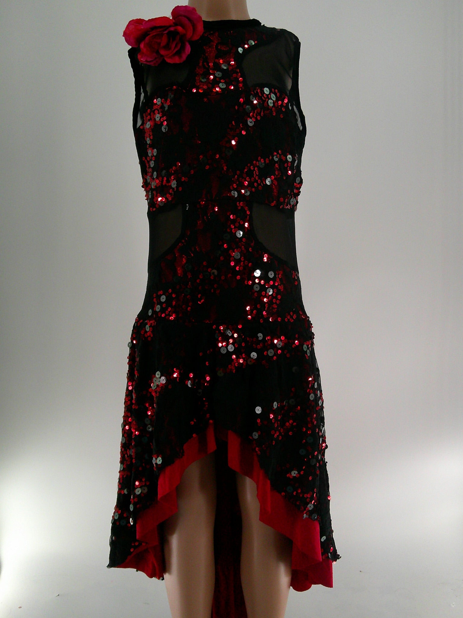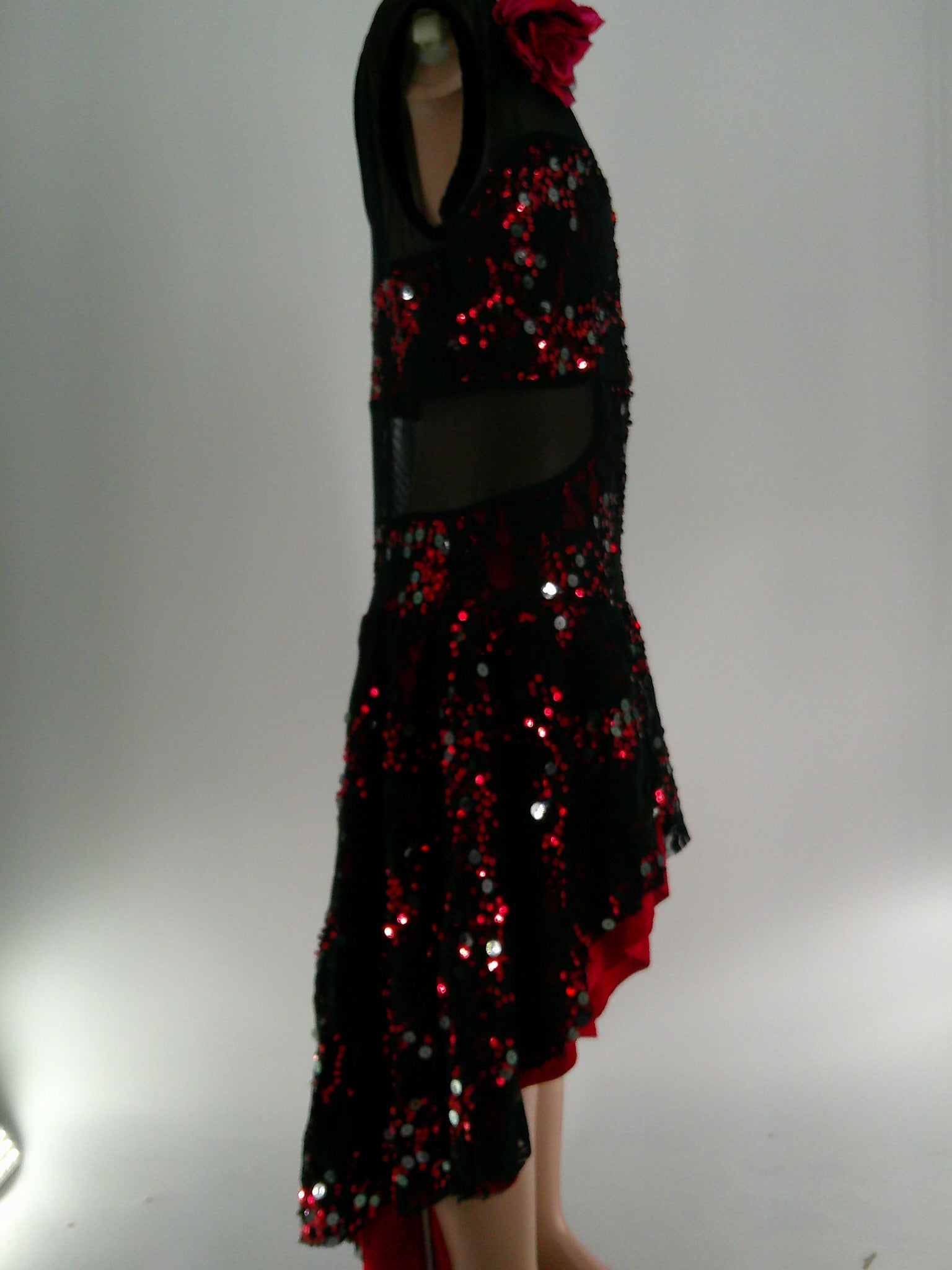 Leotard with attached hi-low skirt and mesh cutouts. Sequined lace mesh over the metallic leotard.