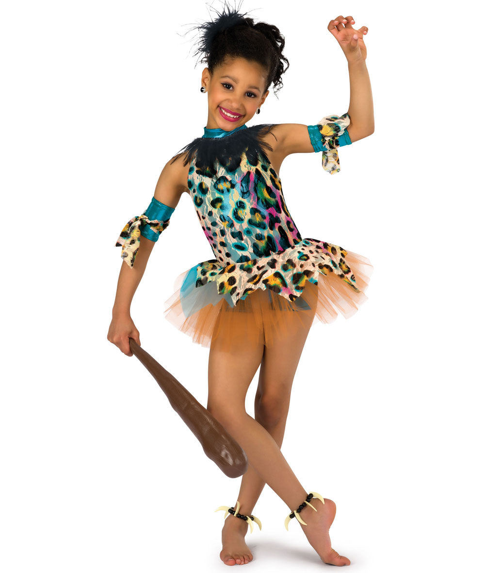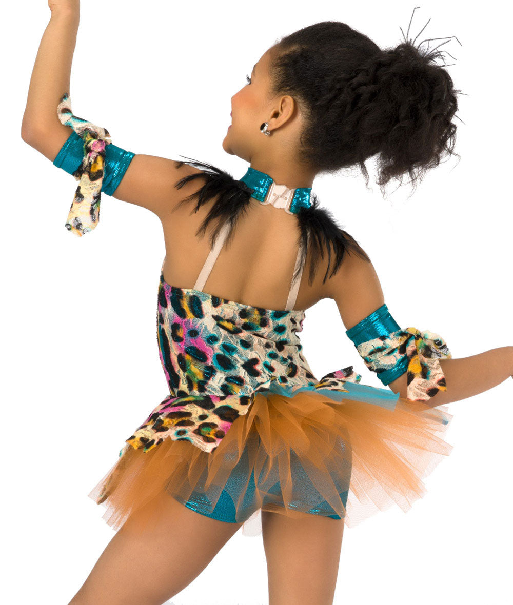 Animal print lace over foil lycra shortall with attached organza and tulle tutu. Attached feather trim. Club sold separately. Made in the USA.