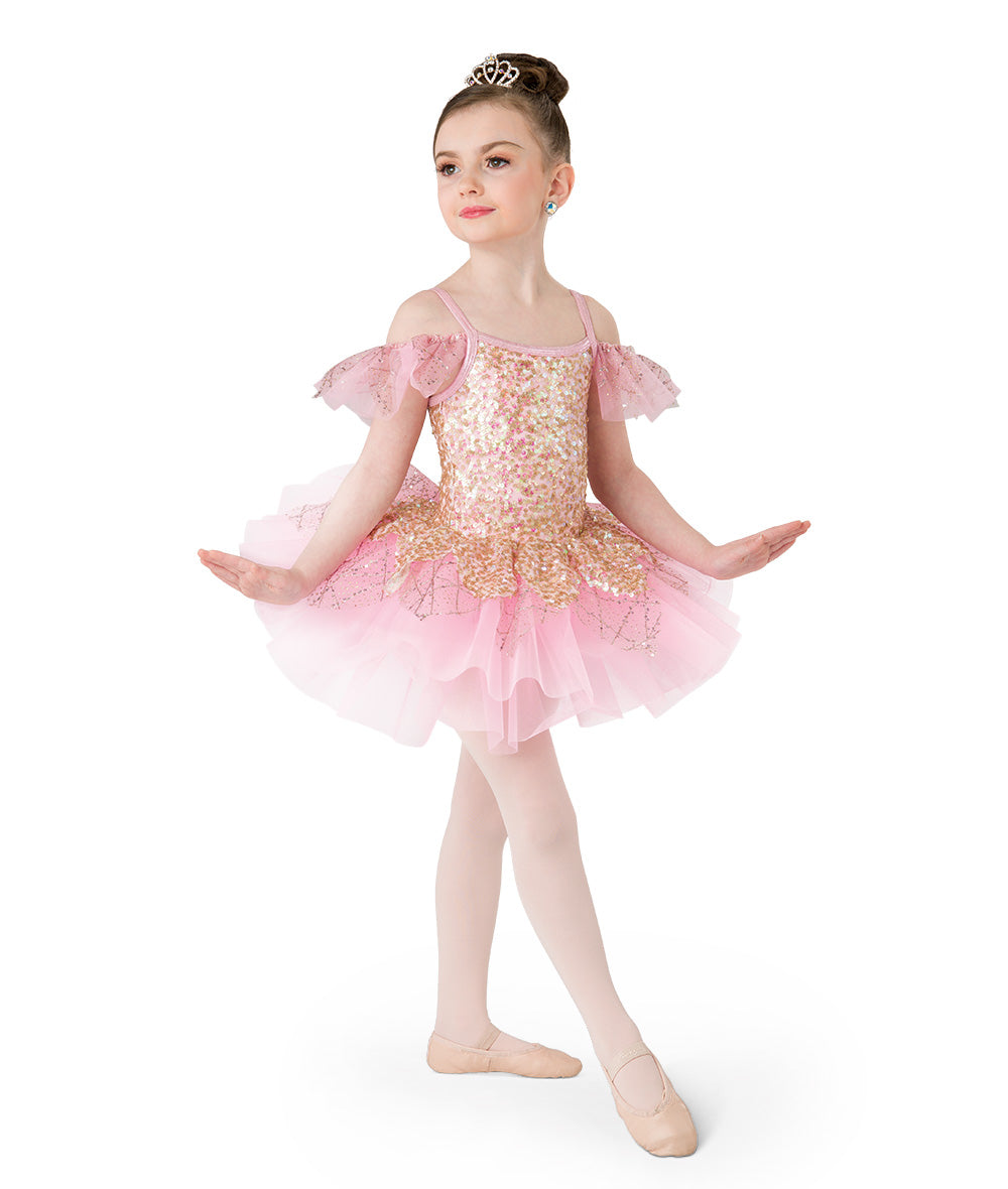Lined glitter sequin mesh and spandex leotard with embroidered glitter sequin tulle topskirt and sleeves. Attached organza short tutu. Made in the USA. DOES NOT INLCUDE tiara.