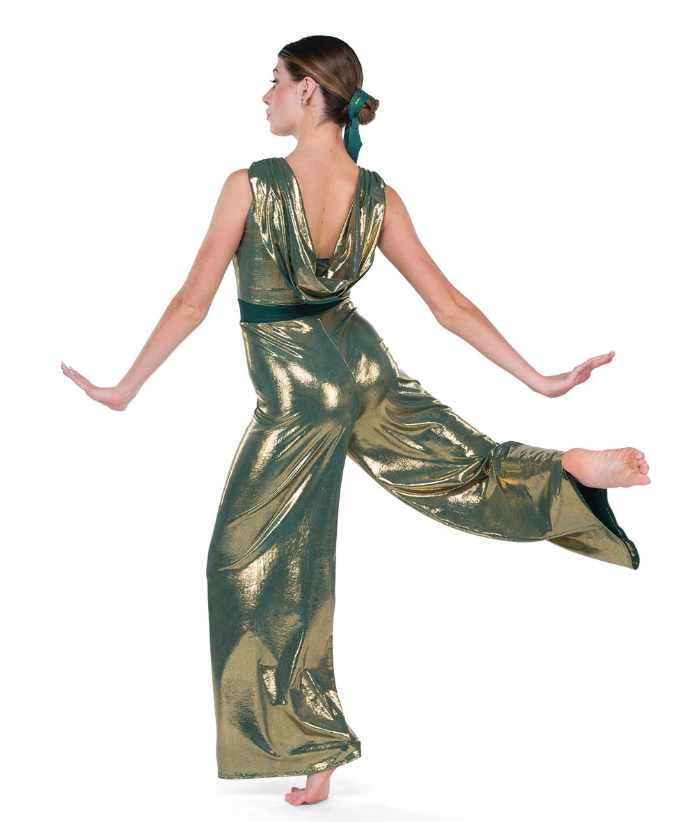 Creased foil wide-leg jumpsuit with spandex waistband and cowl back. Made in the USA.
