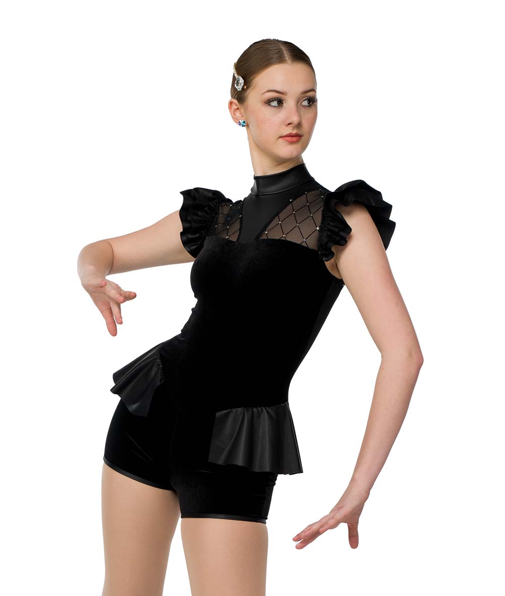 Velvet and faux leather shortall with peplum and diamond glitter mesh insets. Jewel bobby pin sold separately. Made in the USA.