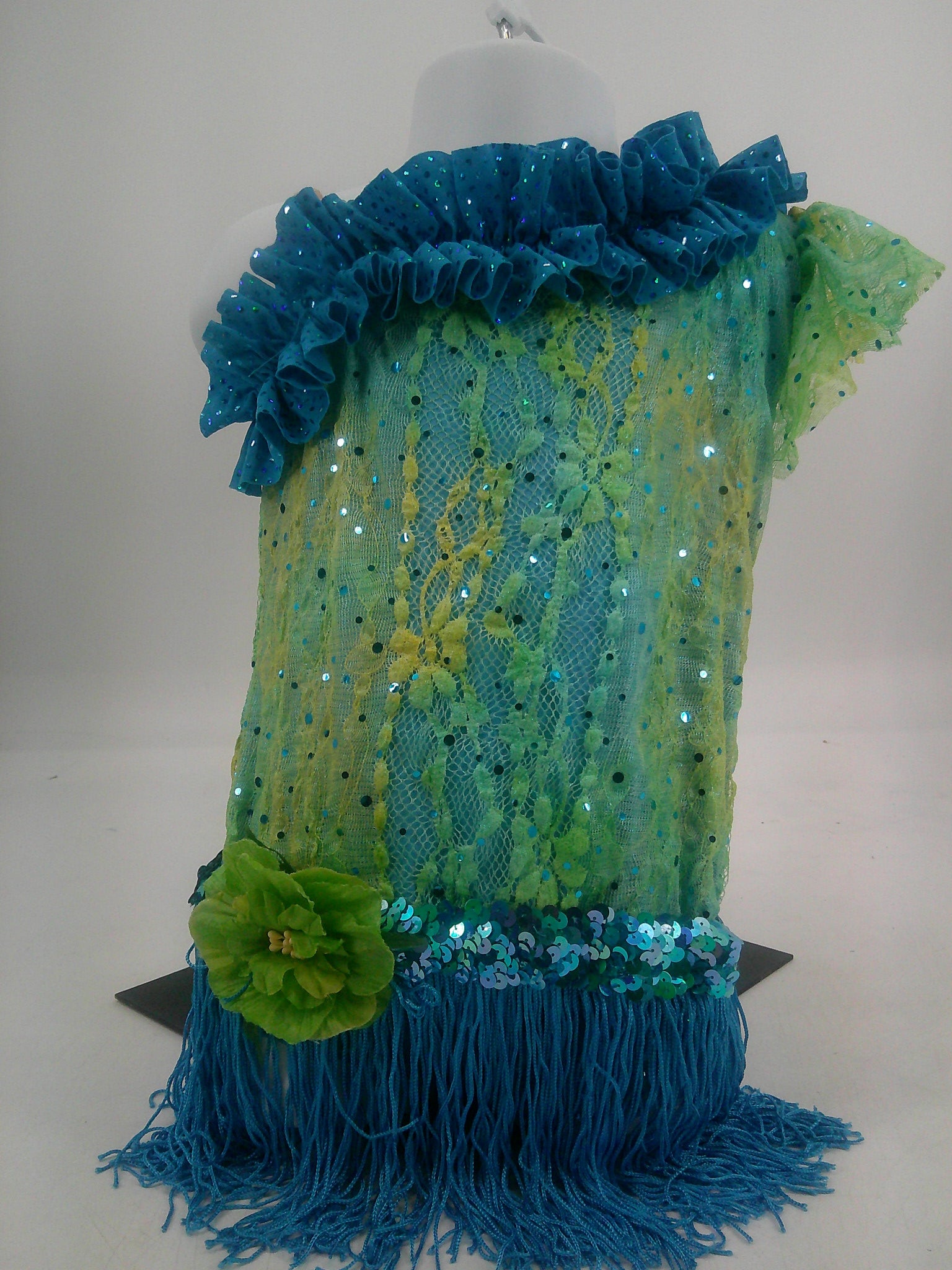 Turquoise Leotard with Lime Lace over the bodice, Sequin waistband and Fringe Skirt Attached Also has flower on the waist and matching flower for the hair