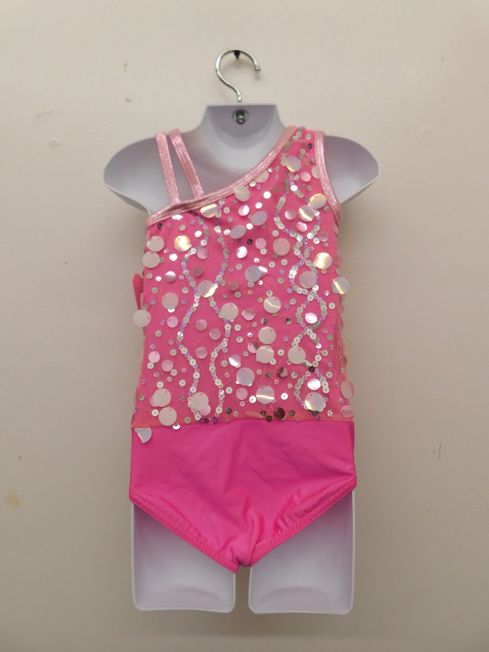 Pink Tank Leotard with Sequins across the chest and strappy right sleeve. Separate fringe skirt included.