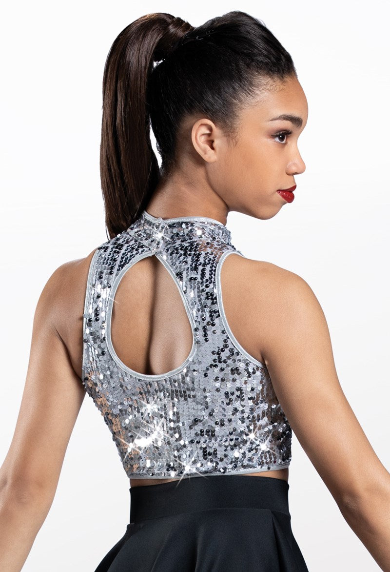Features: Solid Spandex Ultra-Sparkle sequin spandex mock neck crop top. Back keyhole opening and snap closure at the neck. Fully lined.