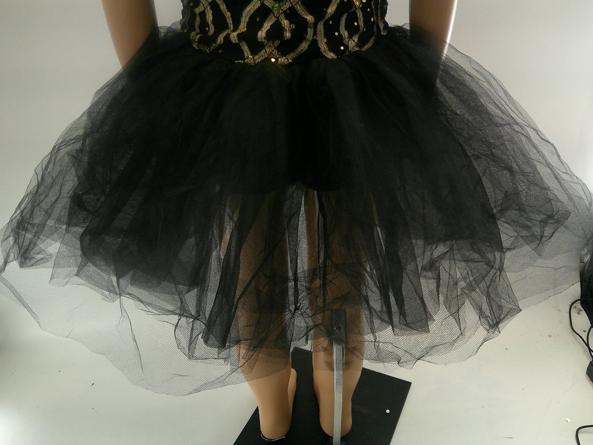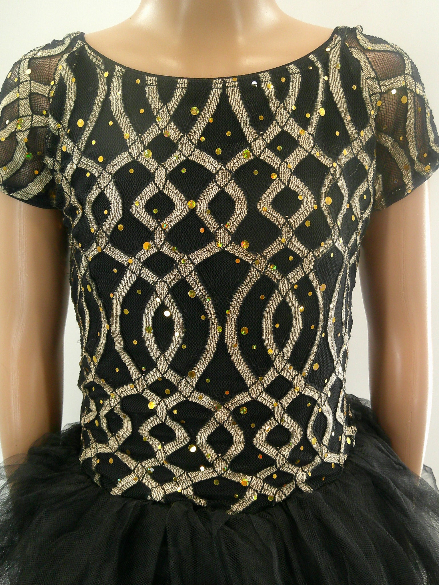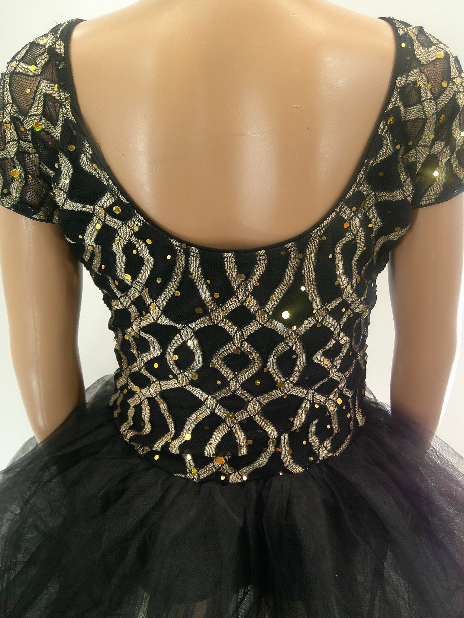 Detailed Description: Lace and mesh leotard with capped sleeves and attached tutu. Briefs attached. Headpiece included.