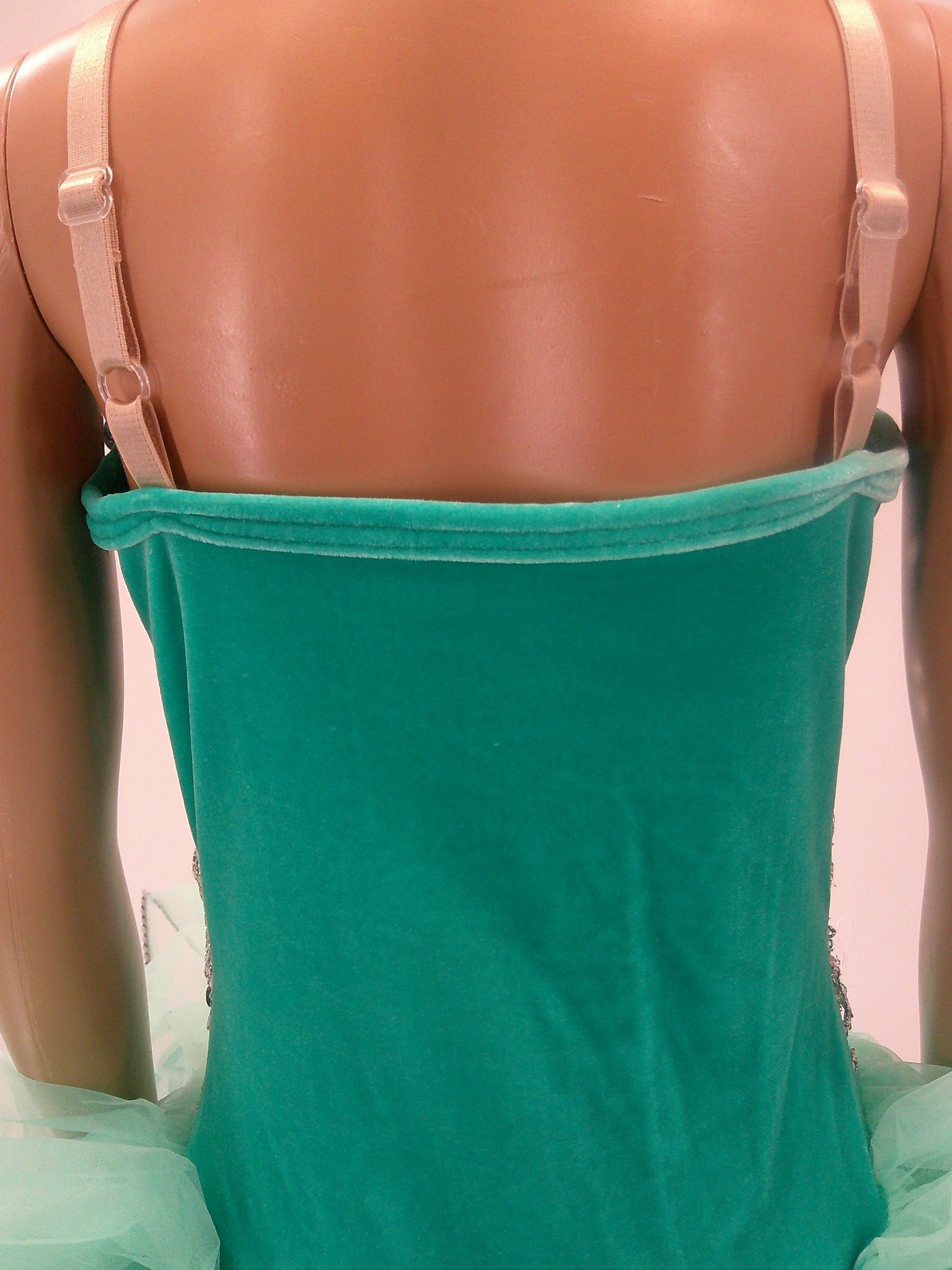 Detailed Description: Velvet leotard with adjustable straps, attached tulle tutu, and lace embroidery on the front of the bodice.