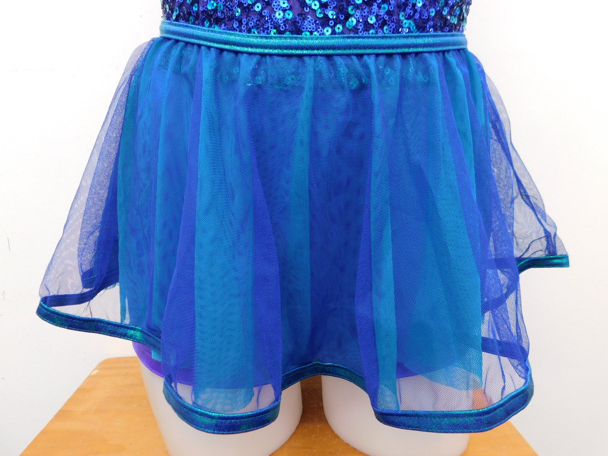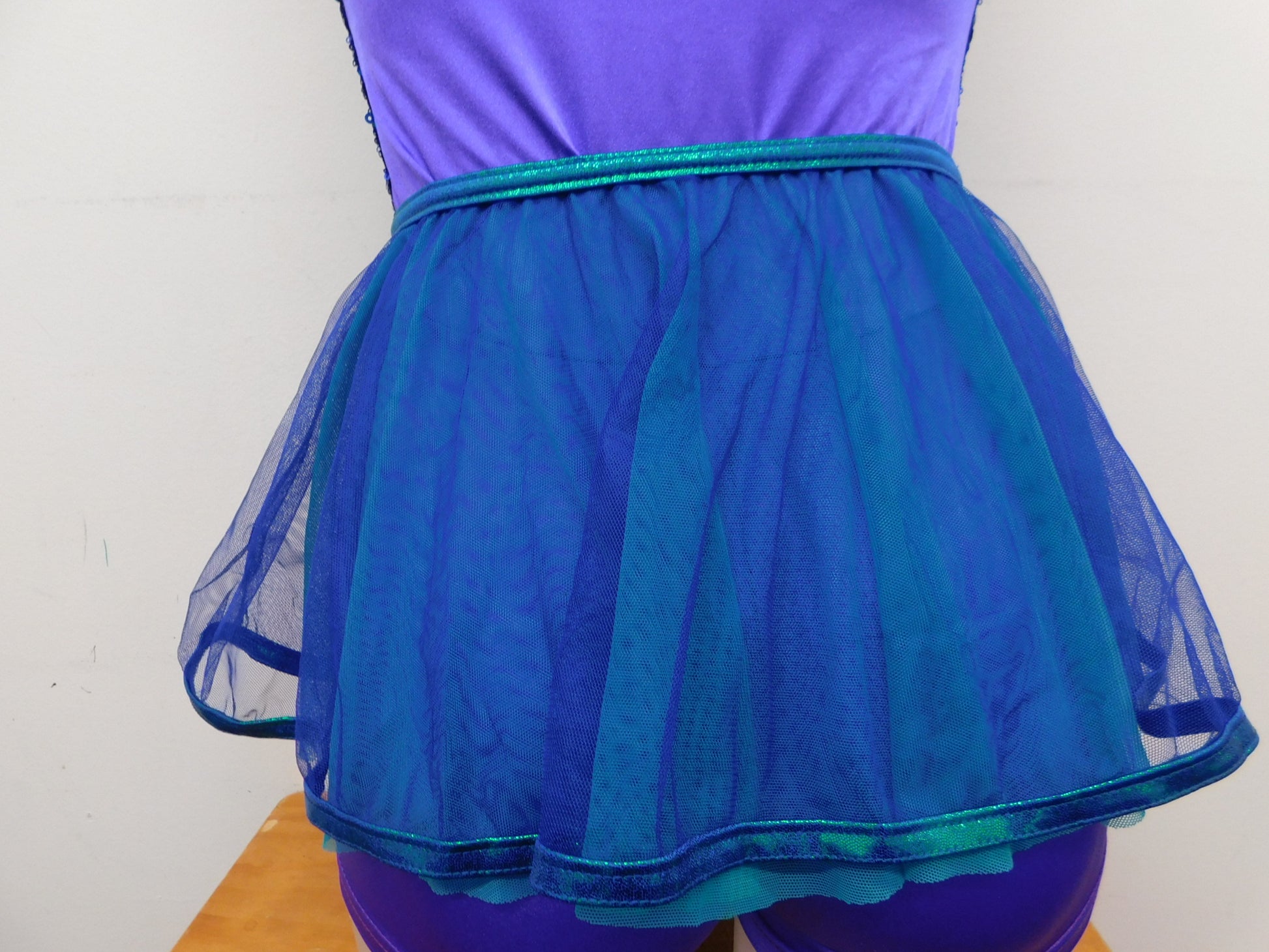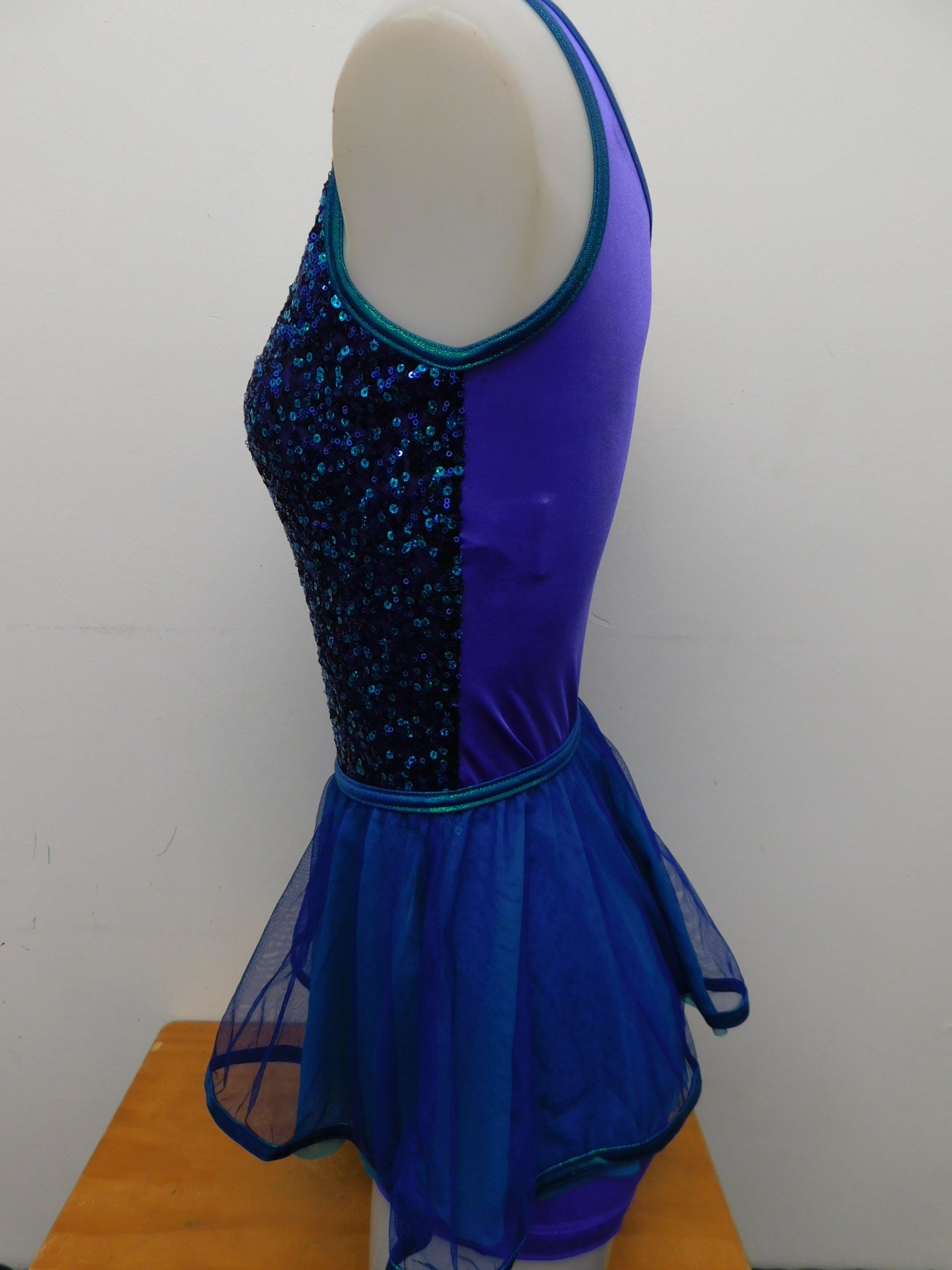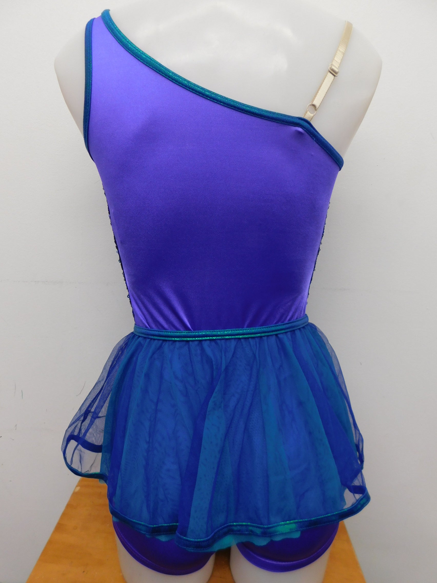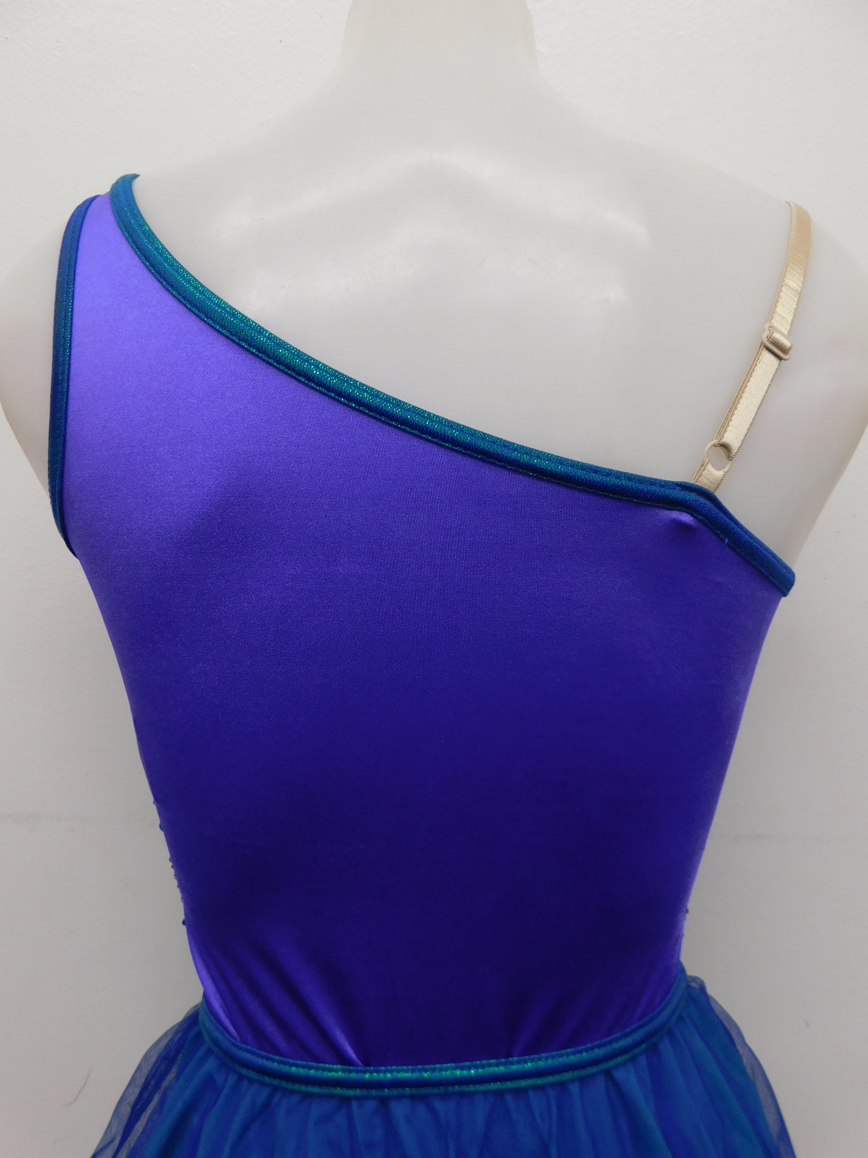 One shoulder camisole lycra leotard with sequined bodice and adjustable nude strap. Includes mesh tulle skirt