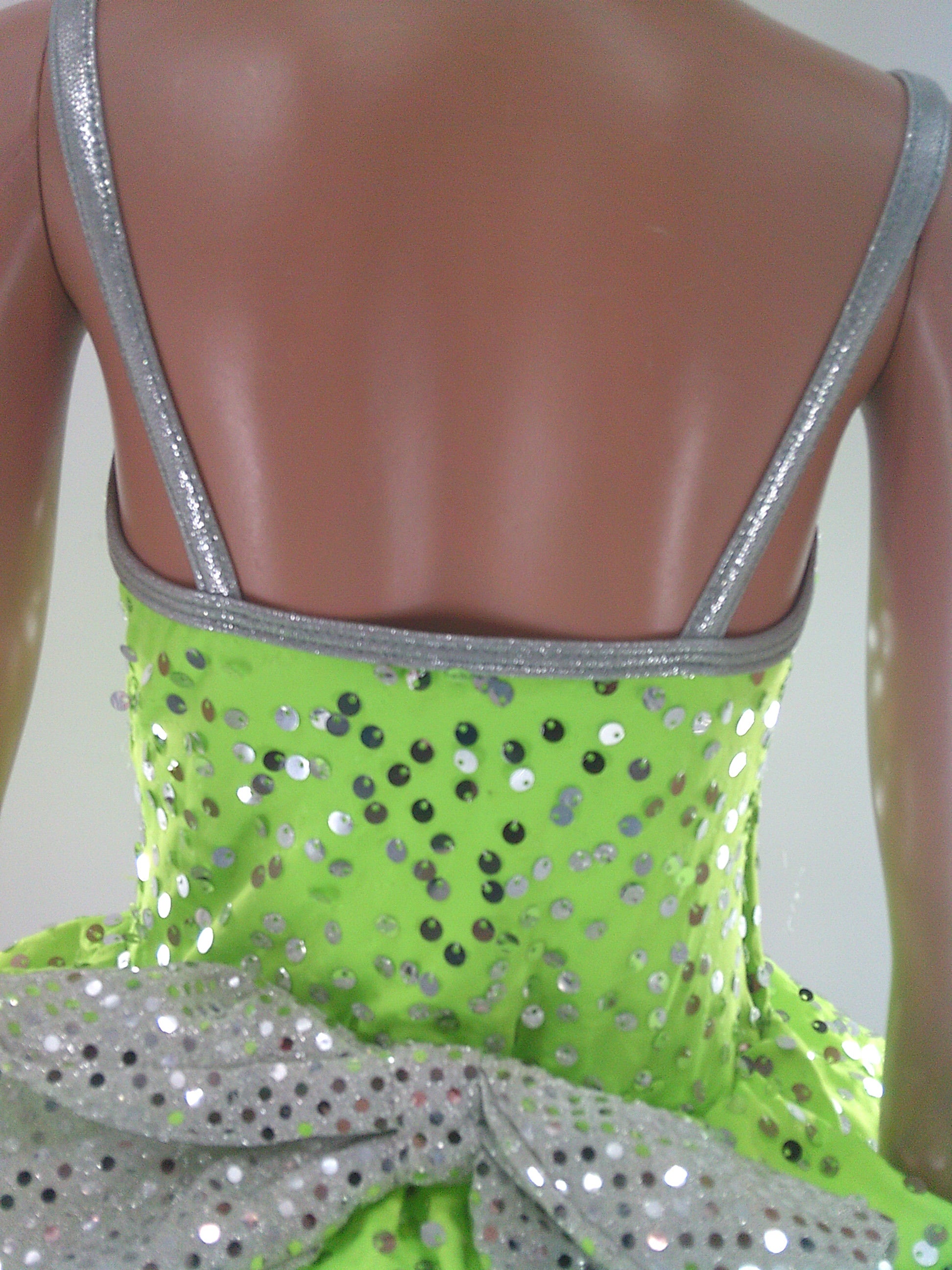 Spandex leotard with sequins and attached skirt. Large bow attached to the back of the costume. Includes separate tulle tutu.