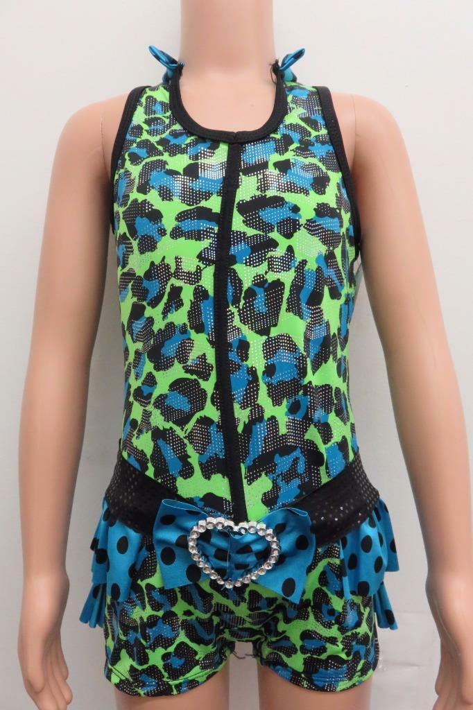 Electric blue and lime green leopard with silver foil dot unitard with black polka dots. Tank style sleeves with black polka dots on blue neck line. Polka dot bow with rhinestone clasp. Attached black foil dot belt with polka dot bow and rhinestone clasp.