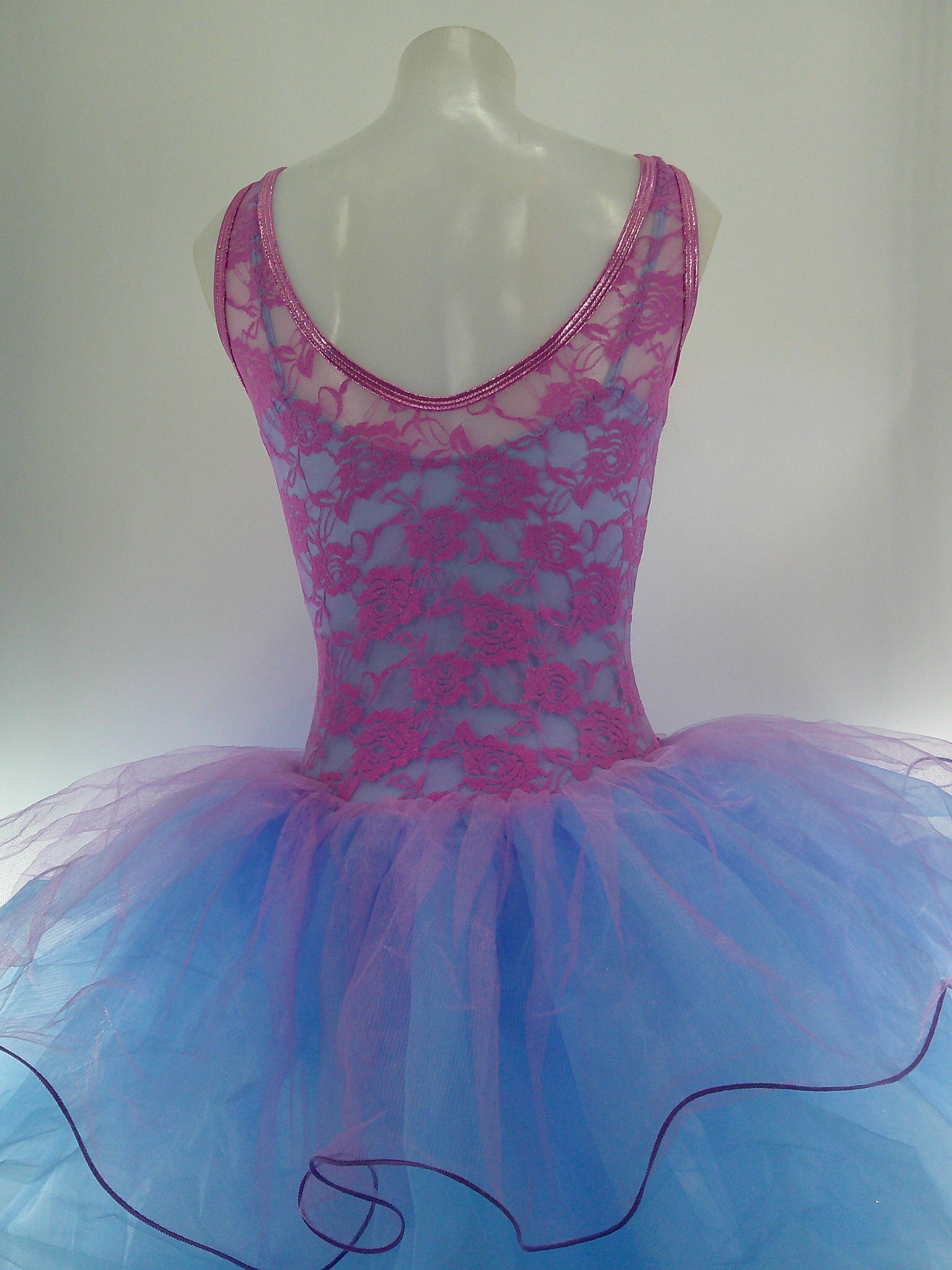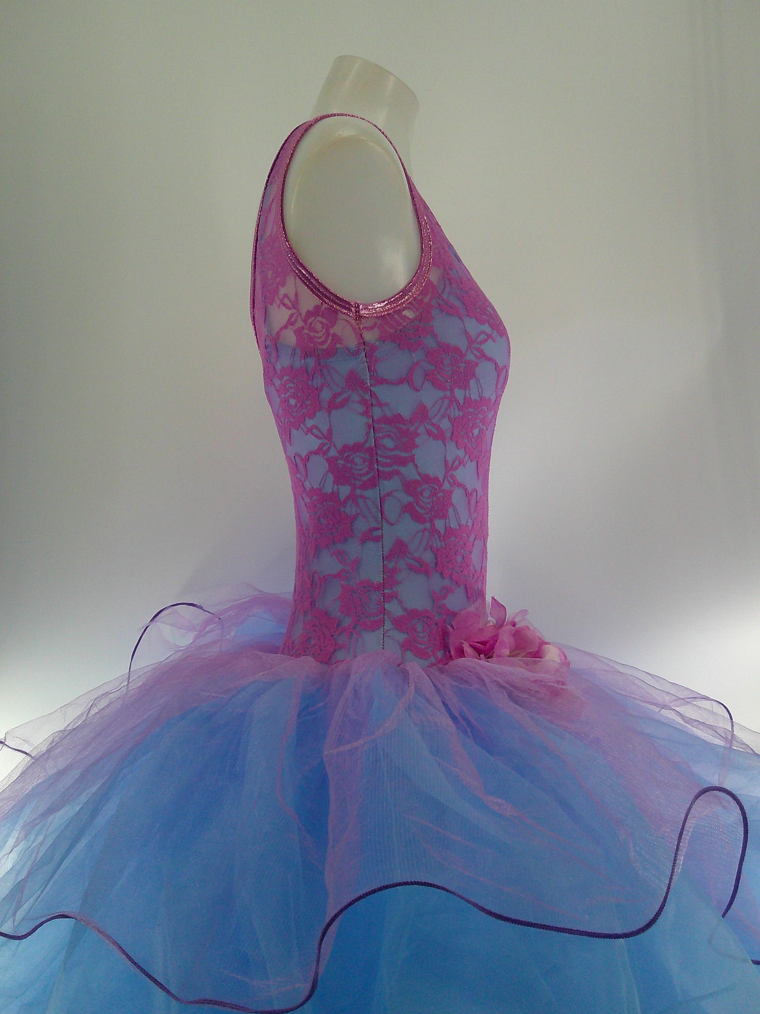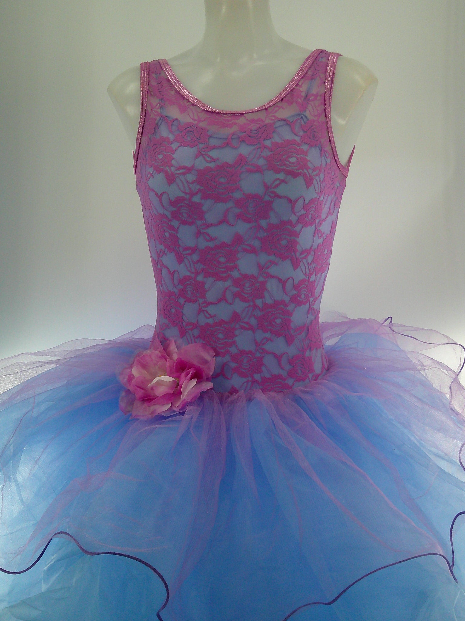 Spandex leotard with lace overlay and attached tulle tutu. Flower accent attached at waist.
