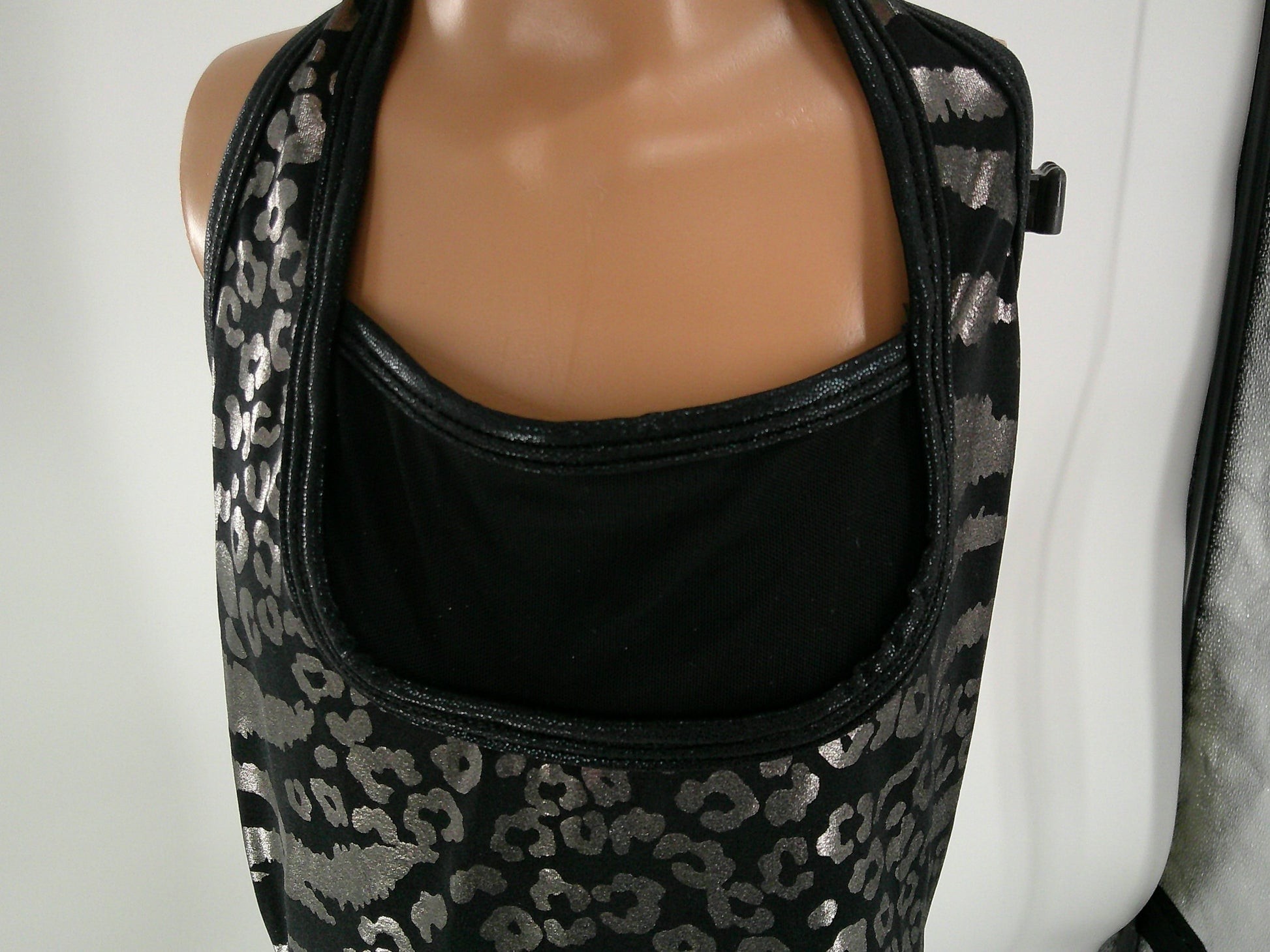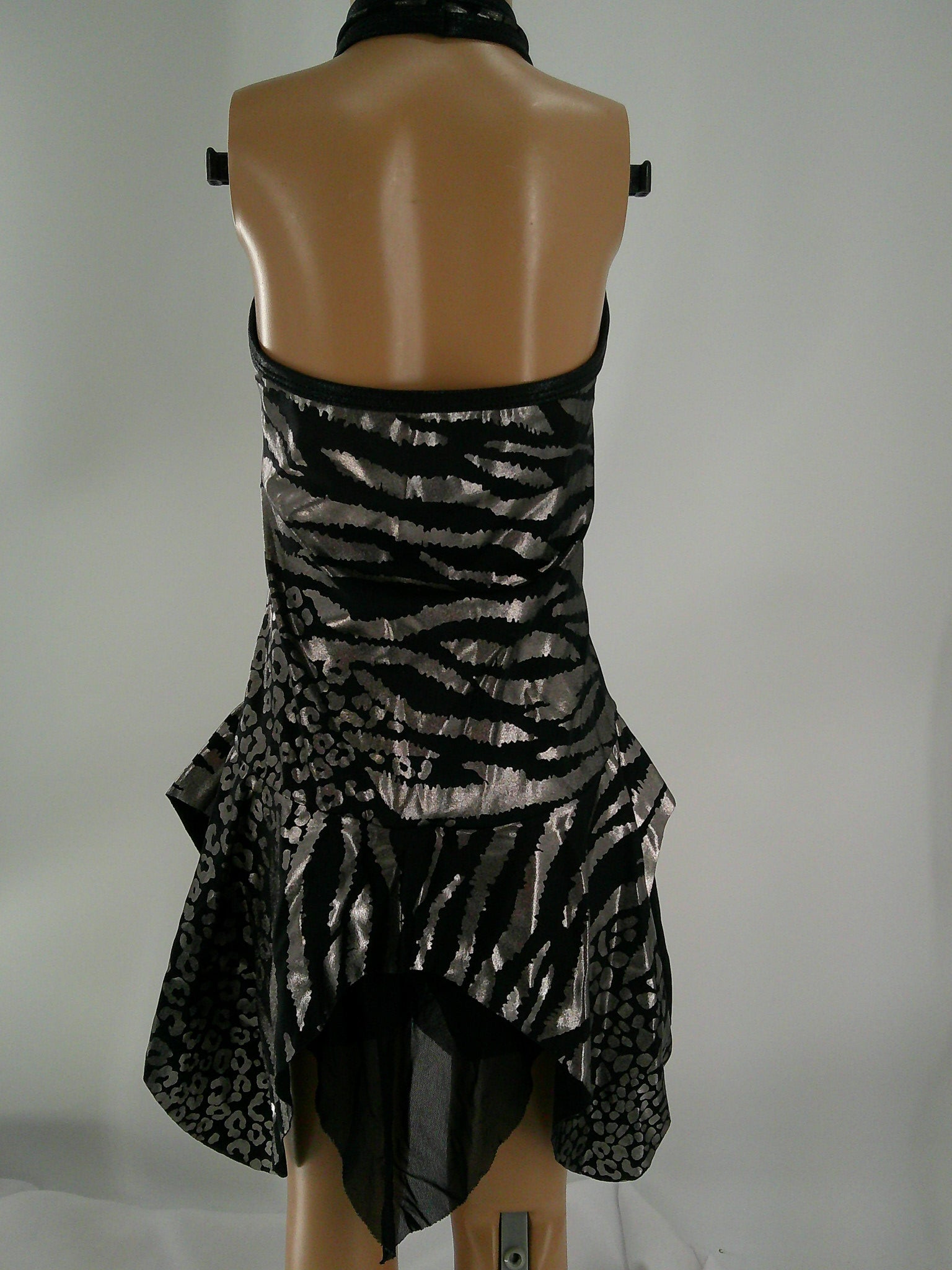 Halter style biketard with attached handkerchief skirt. Various metallic animal print.