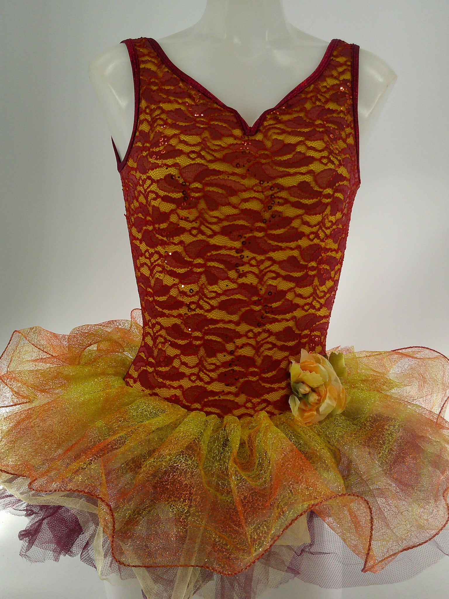 Sequined lace leotard with attached tulle tutu. Flower accent attached at waist on left side.