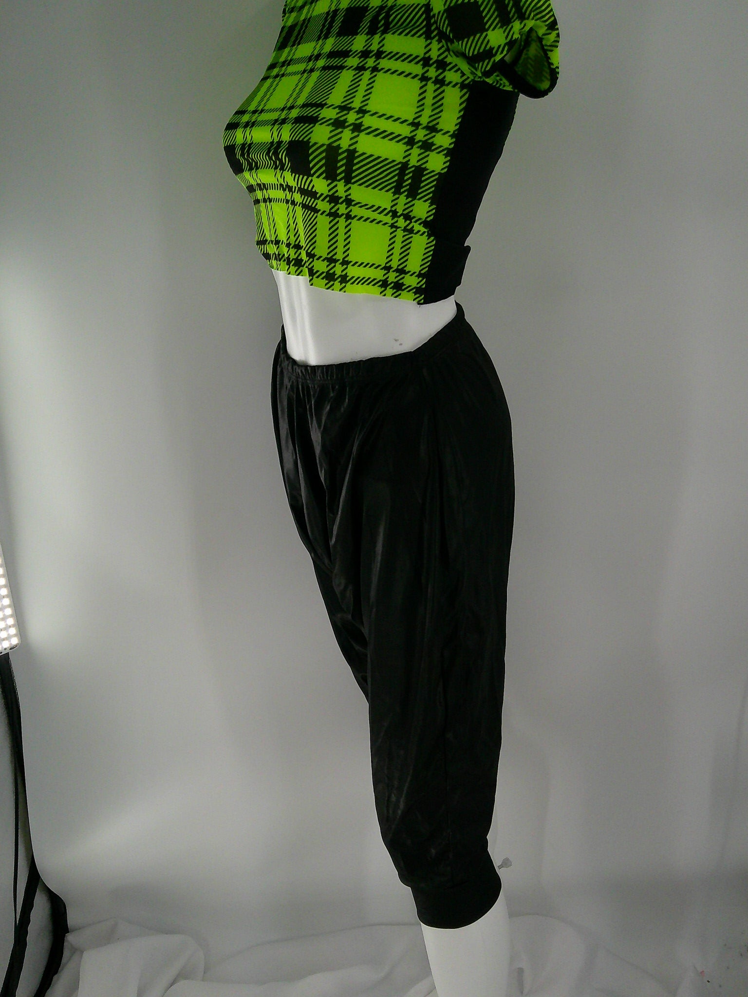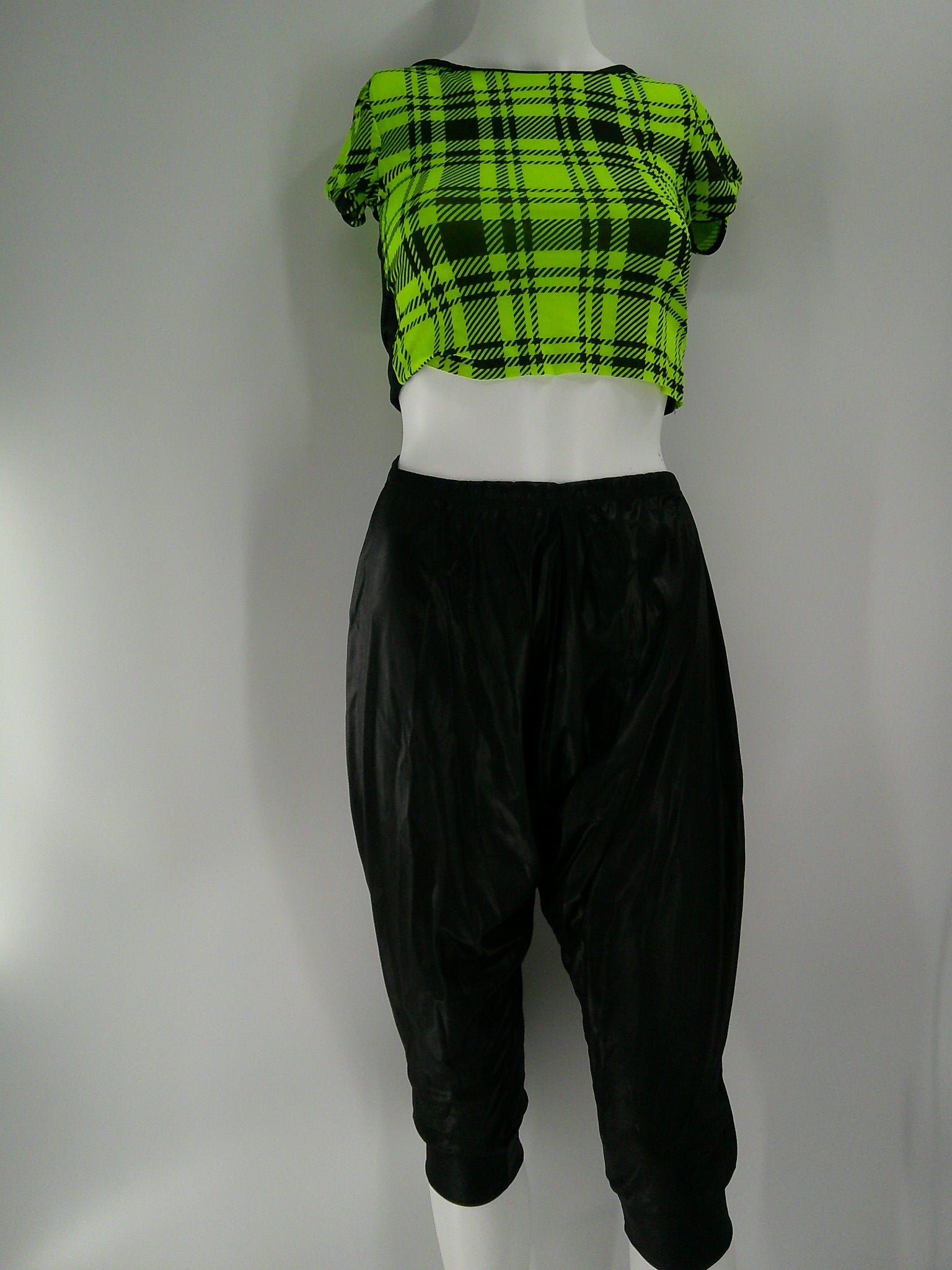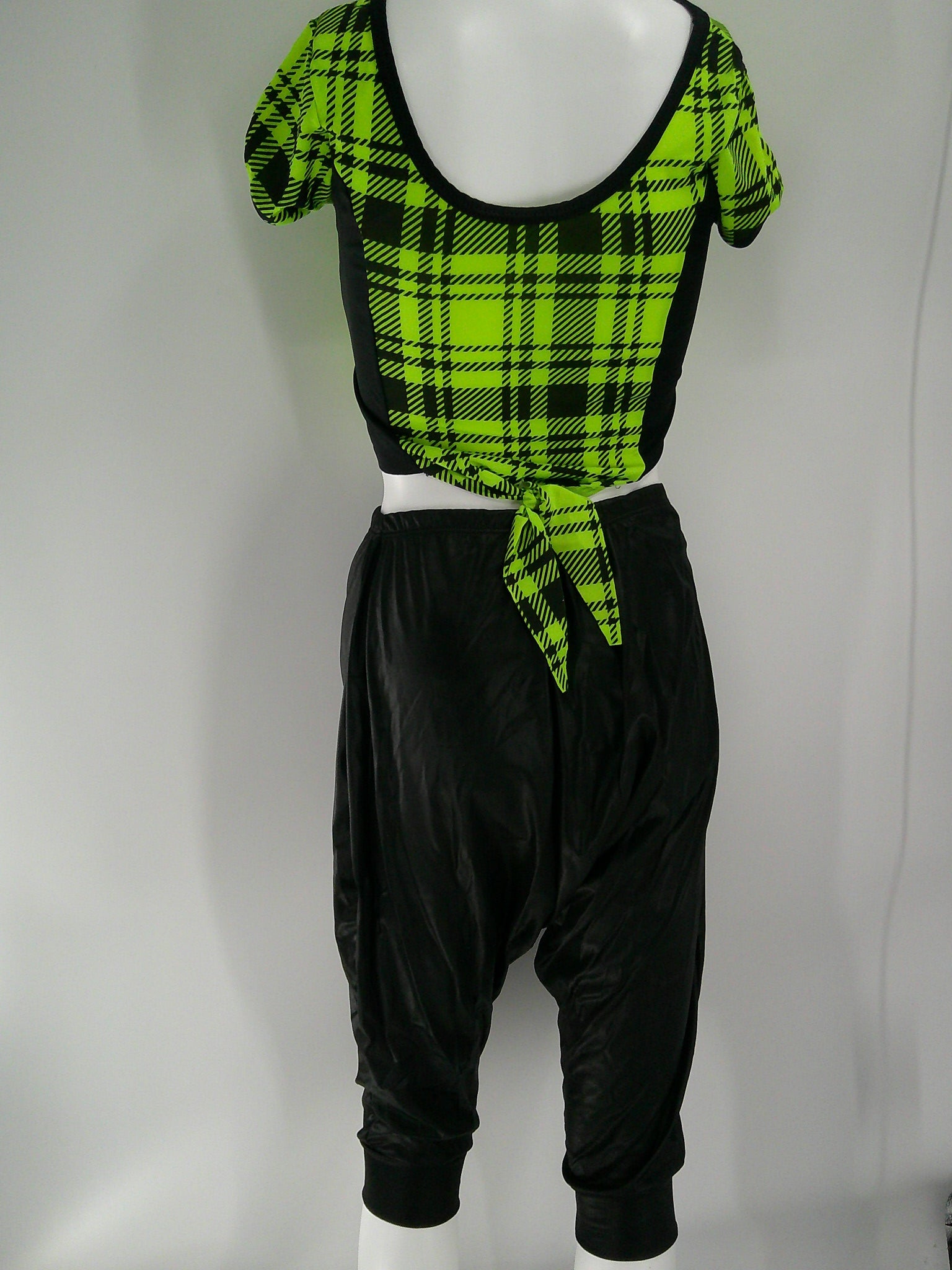 2 pc costume includes short sleeve top with houndstooth print and knot at the bottom, solid black harem pants, and matching fabric for hair.
