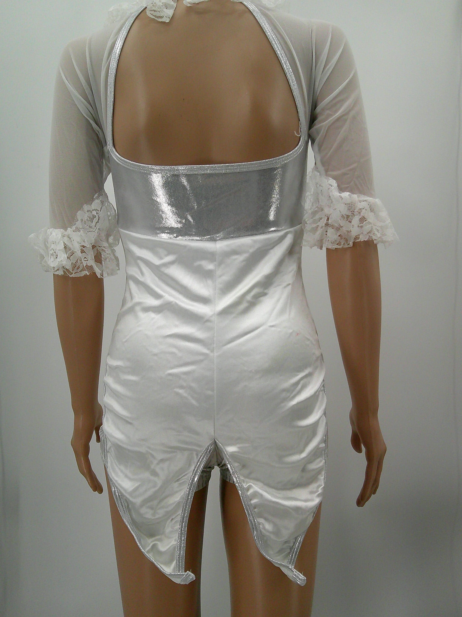 Biketard with with long sleeves, attached lace collar, and tuxedo tails. Pinstripes down the front of biketard and sequin button detail.