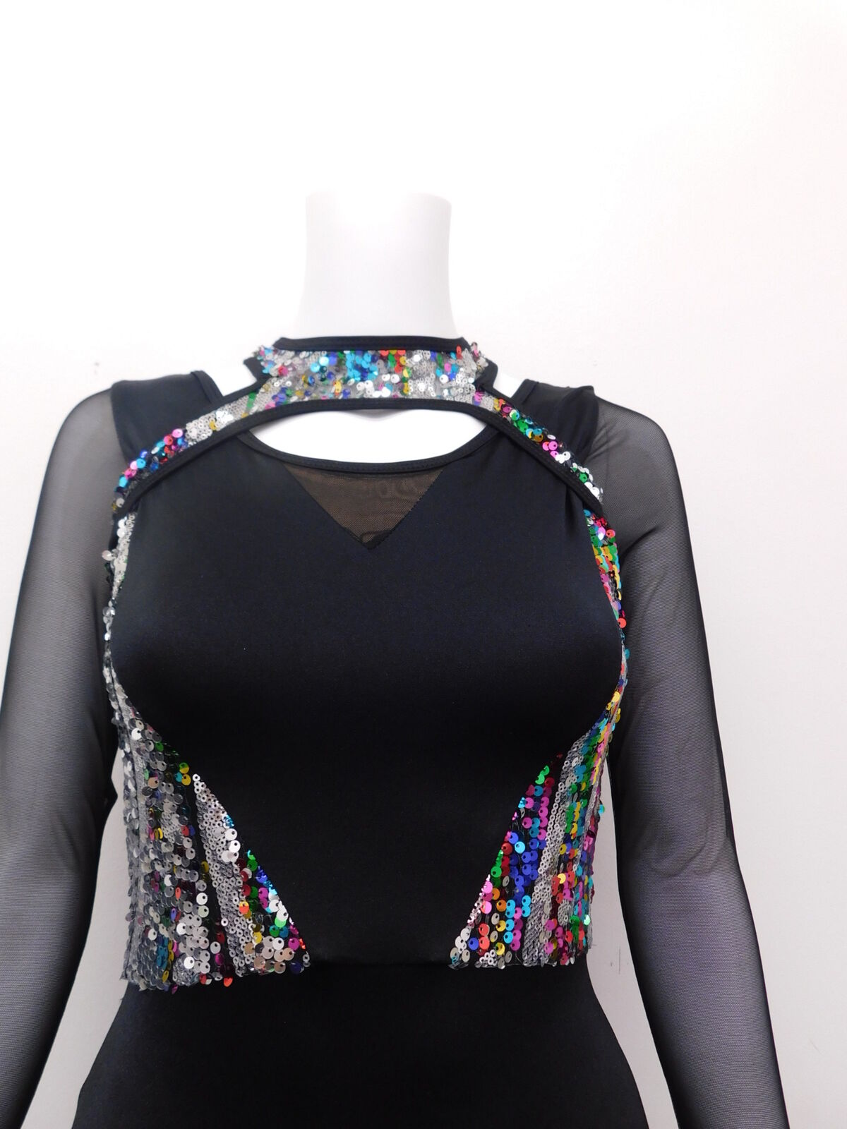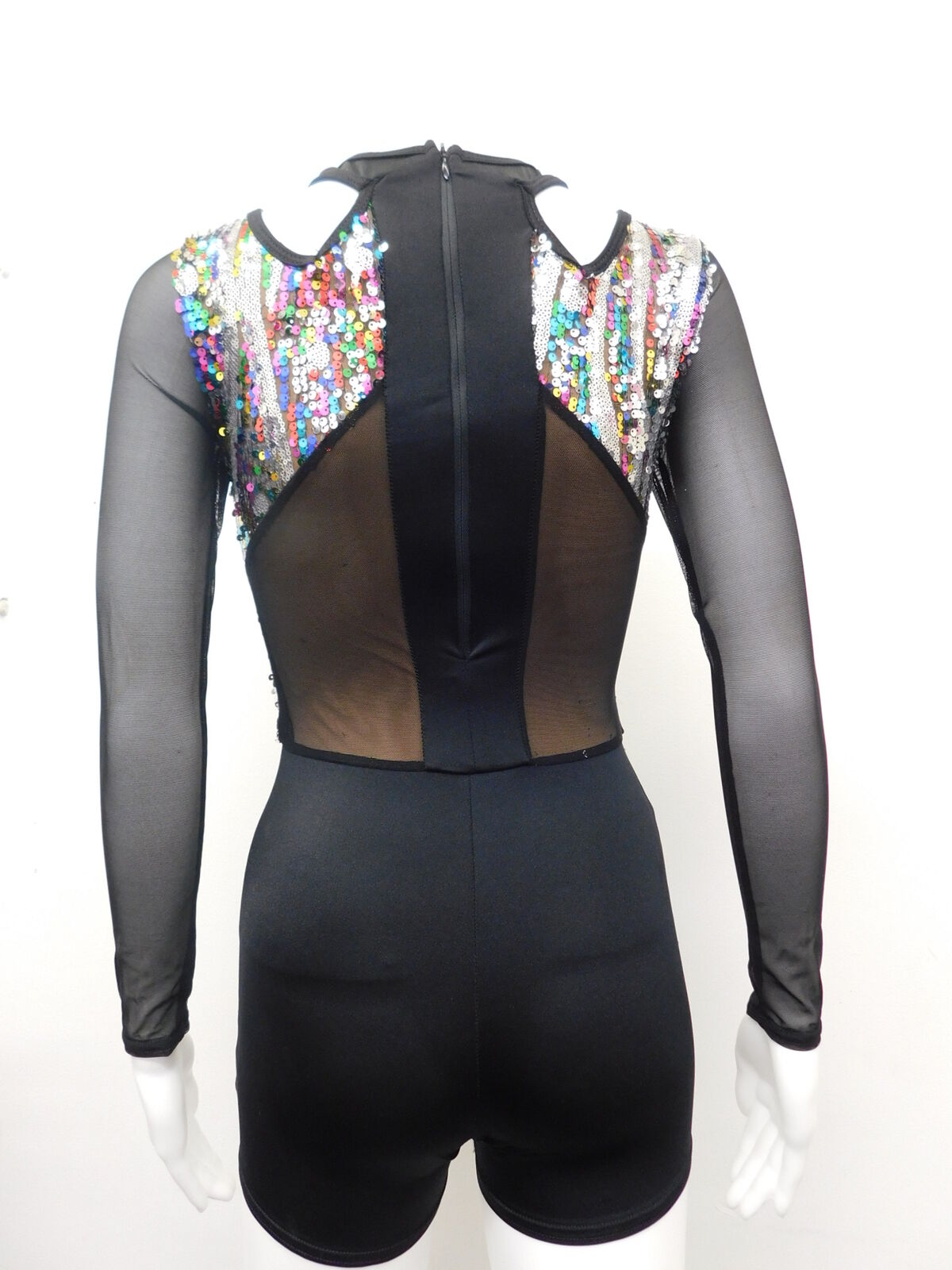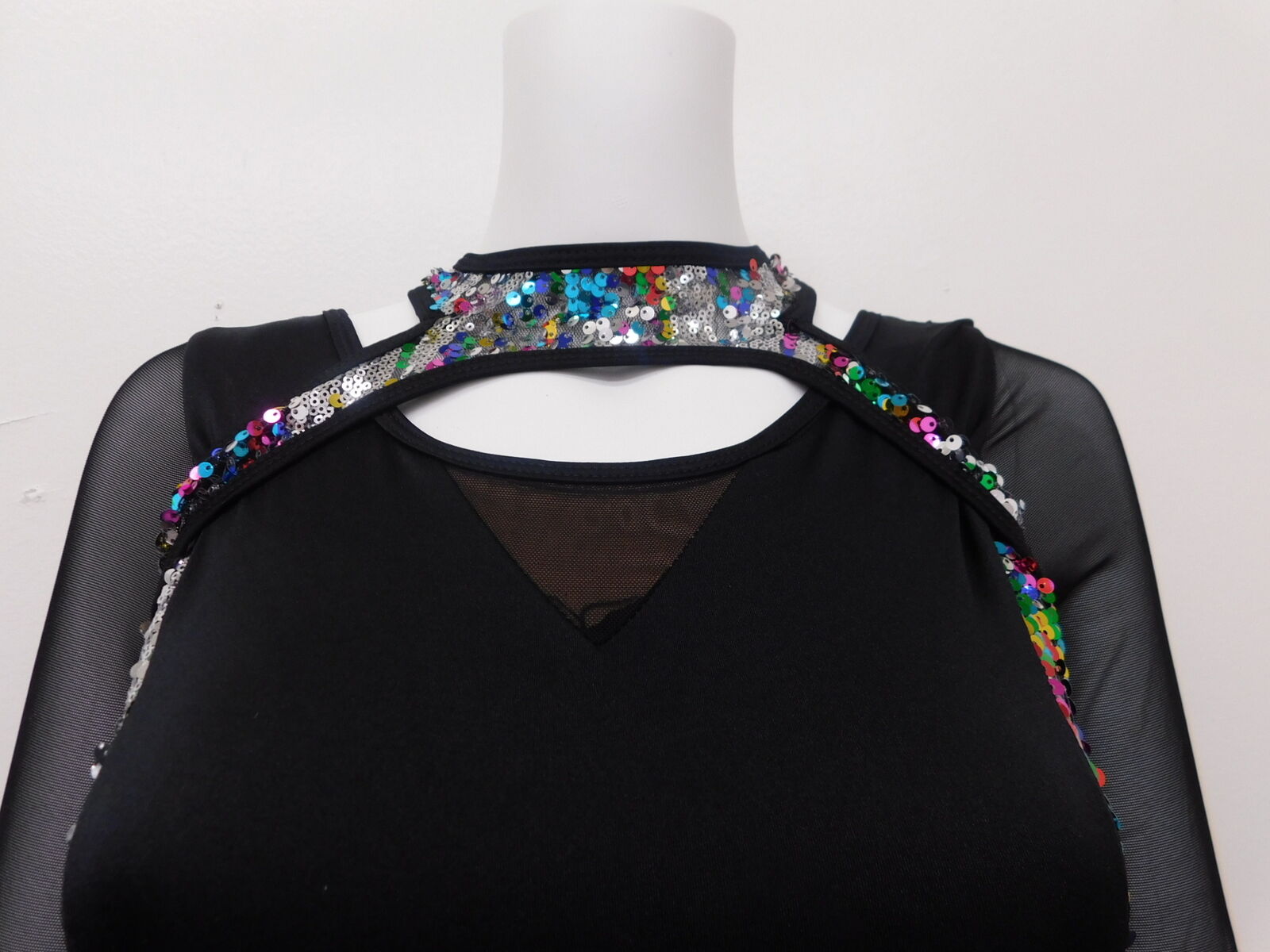 Brand: Curtain Call J5494 D25-455 Size: Big Kid XL Child Colors: Black Black Silver Red Blue Pink Green Great For: Jazz Tap Hip Hop Clogging Modern Features: Solid Sequin Lycra Unitard. Mesh long sleeves. Sequin side inserts, and sequin halter neck with cutout at shoulders and neck. Top half of unitard is fully lined.