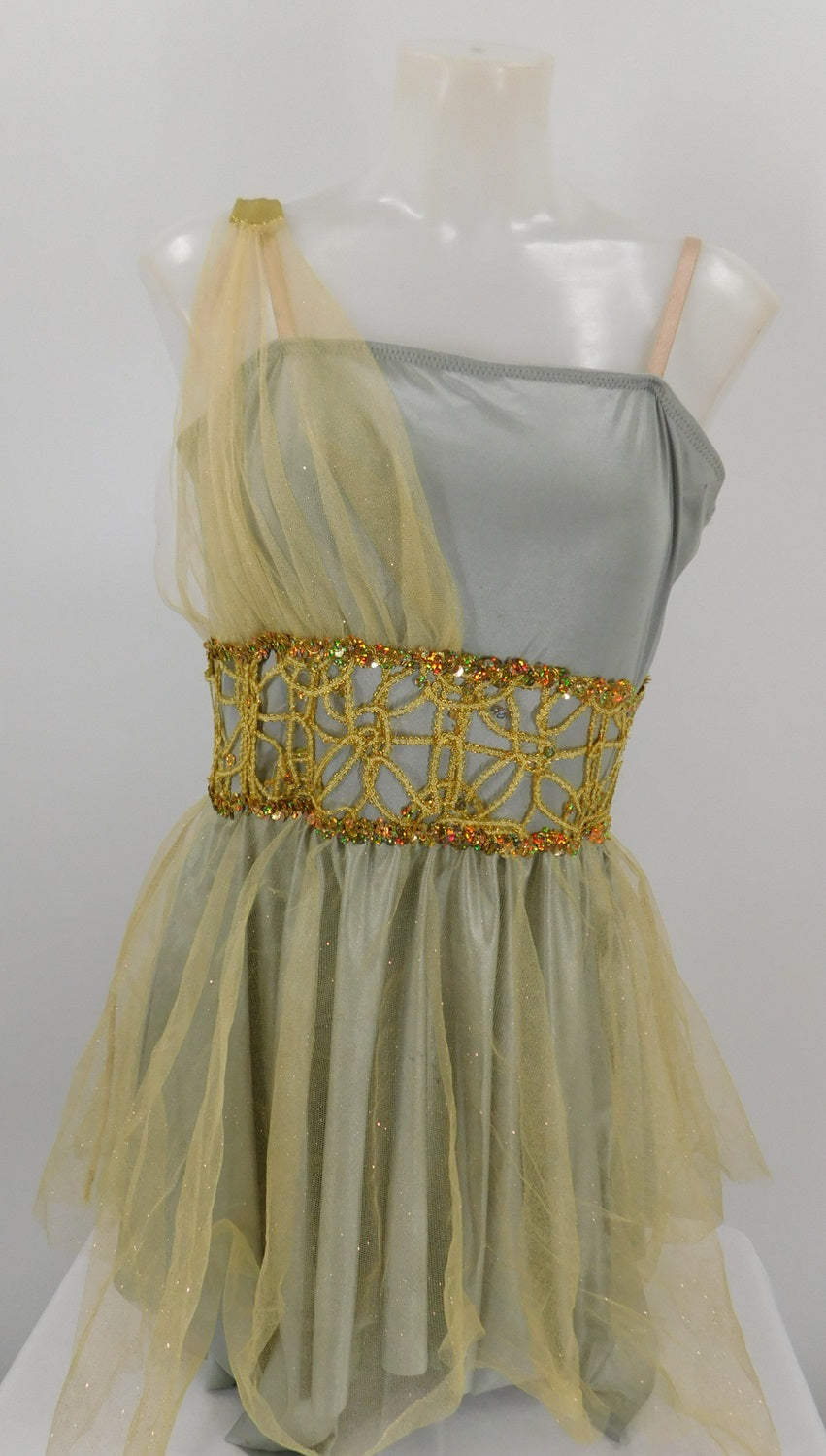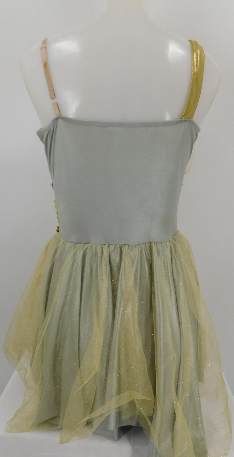 Spandex leotard with adjustable nude straps. The front of the bodice has gold sequins and "roping" that form a belt-like appearance and there is attached tulle that goes over the right shoulder. Attached is also a spandex and tulle skirt decorated with gold glitter.