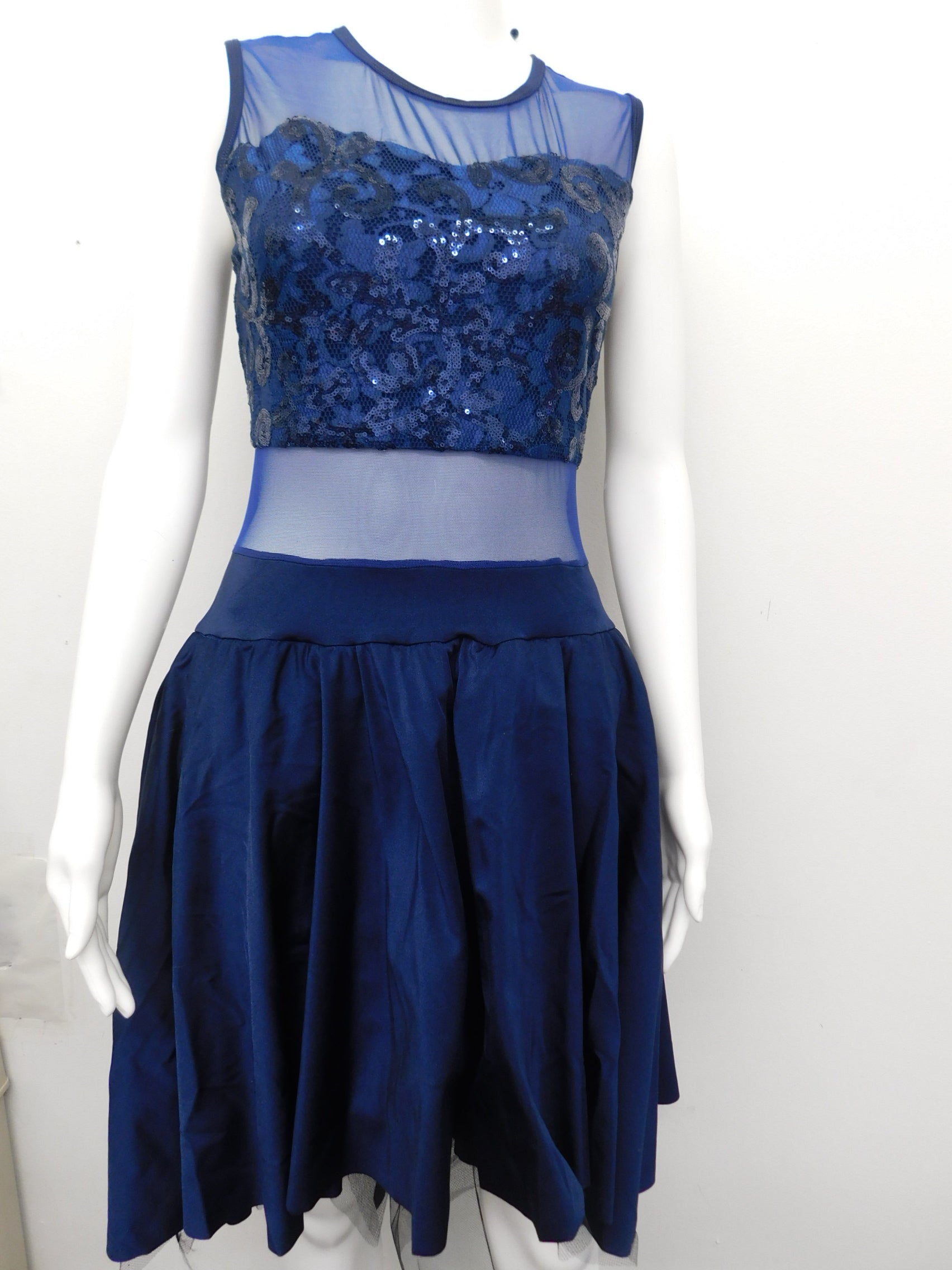 Brand: Curtain Call R491 BB25-496 Size: Large Adult Colors: Navy Blue Great For: Lyrical Ballet Contemporary Features: Floral Lace Sleeveless Dress Trunks Spandex Beautiful ocean blue ballet gown. Upper bodice and midriff made out of stretch mesh material. Bodice over bust is stretch material and decorated with sequins. Voluminous skirt lined with black tulle for full skirt. Skirt is in a high-low cut.