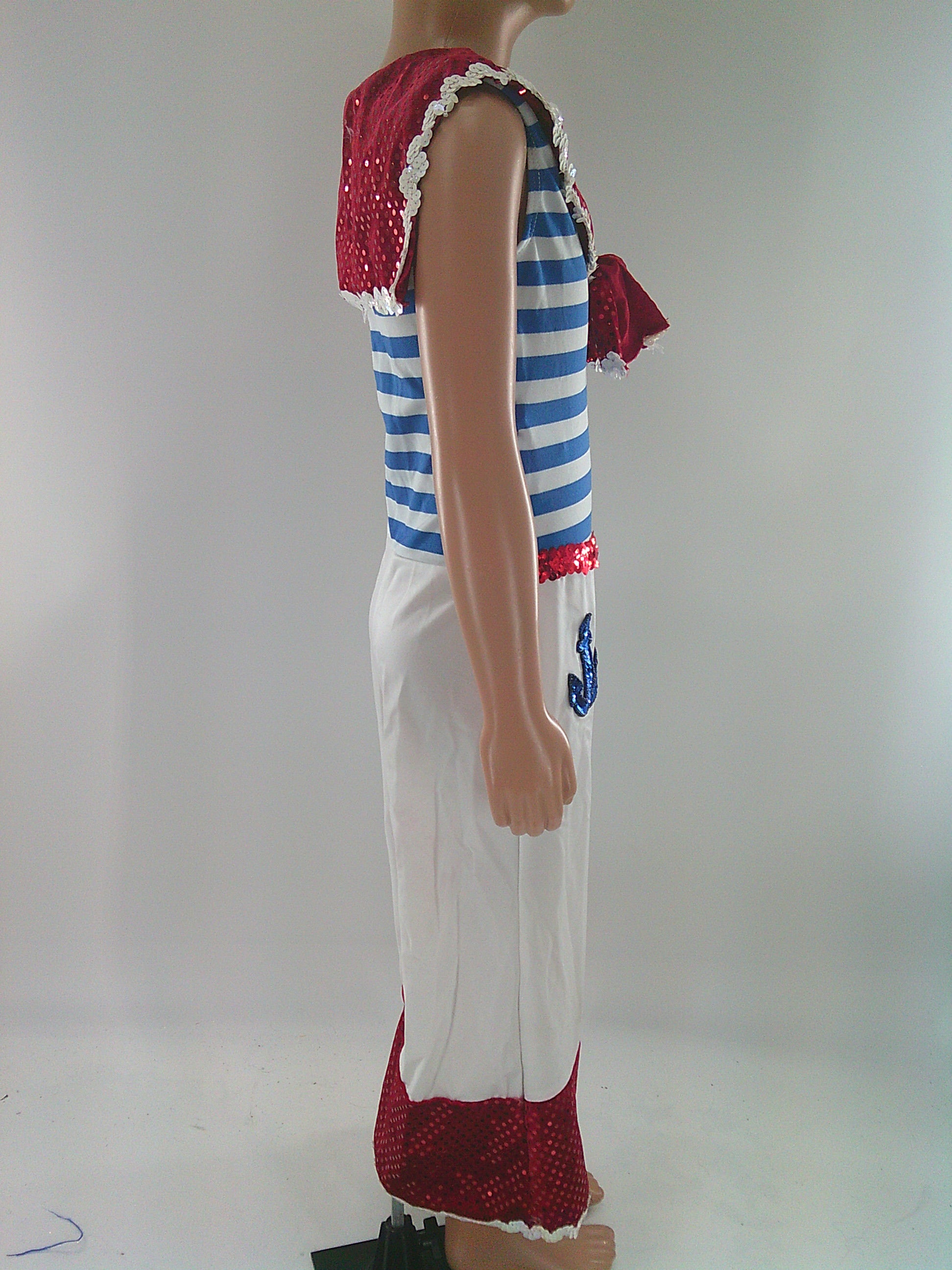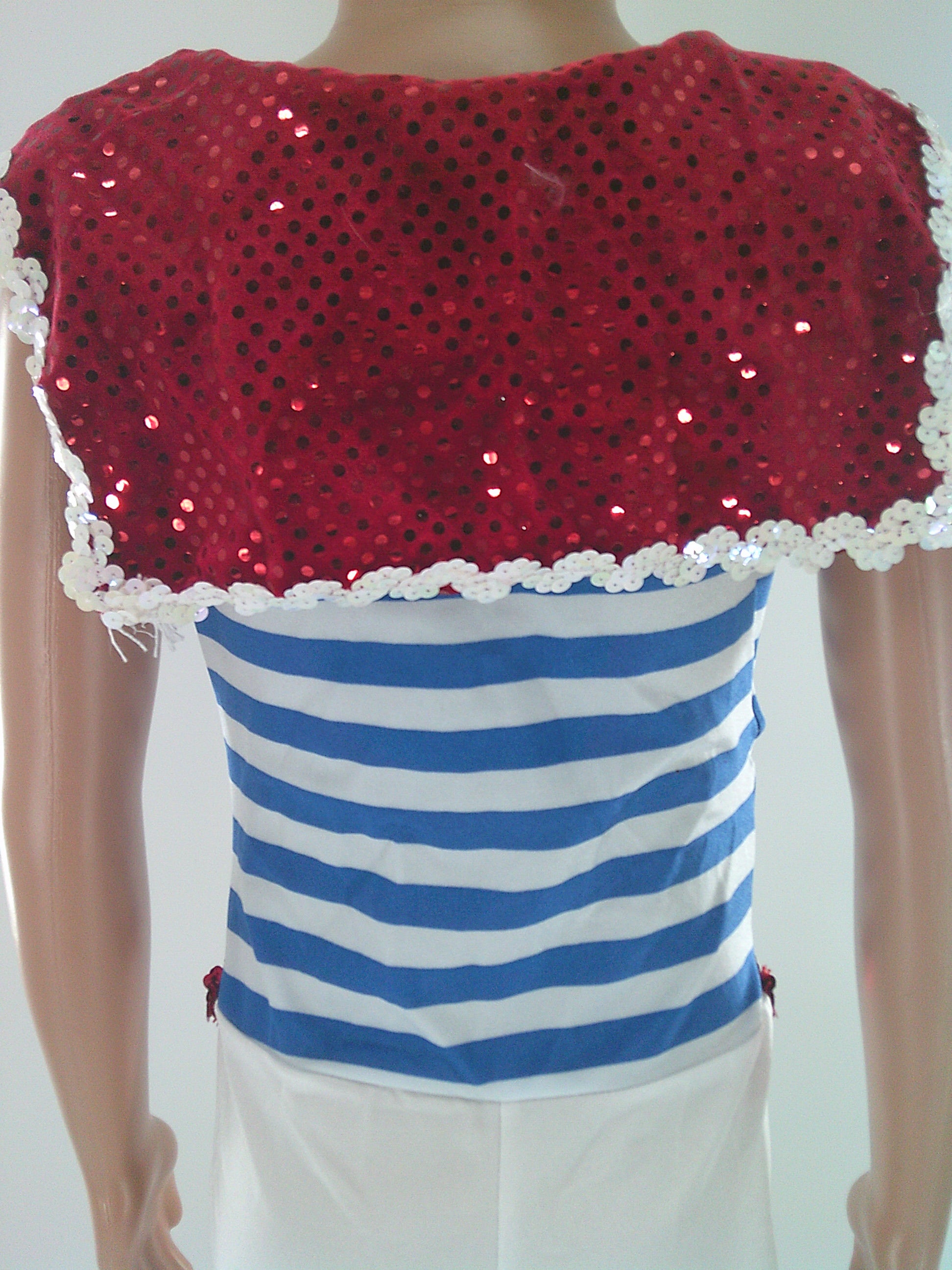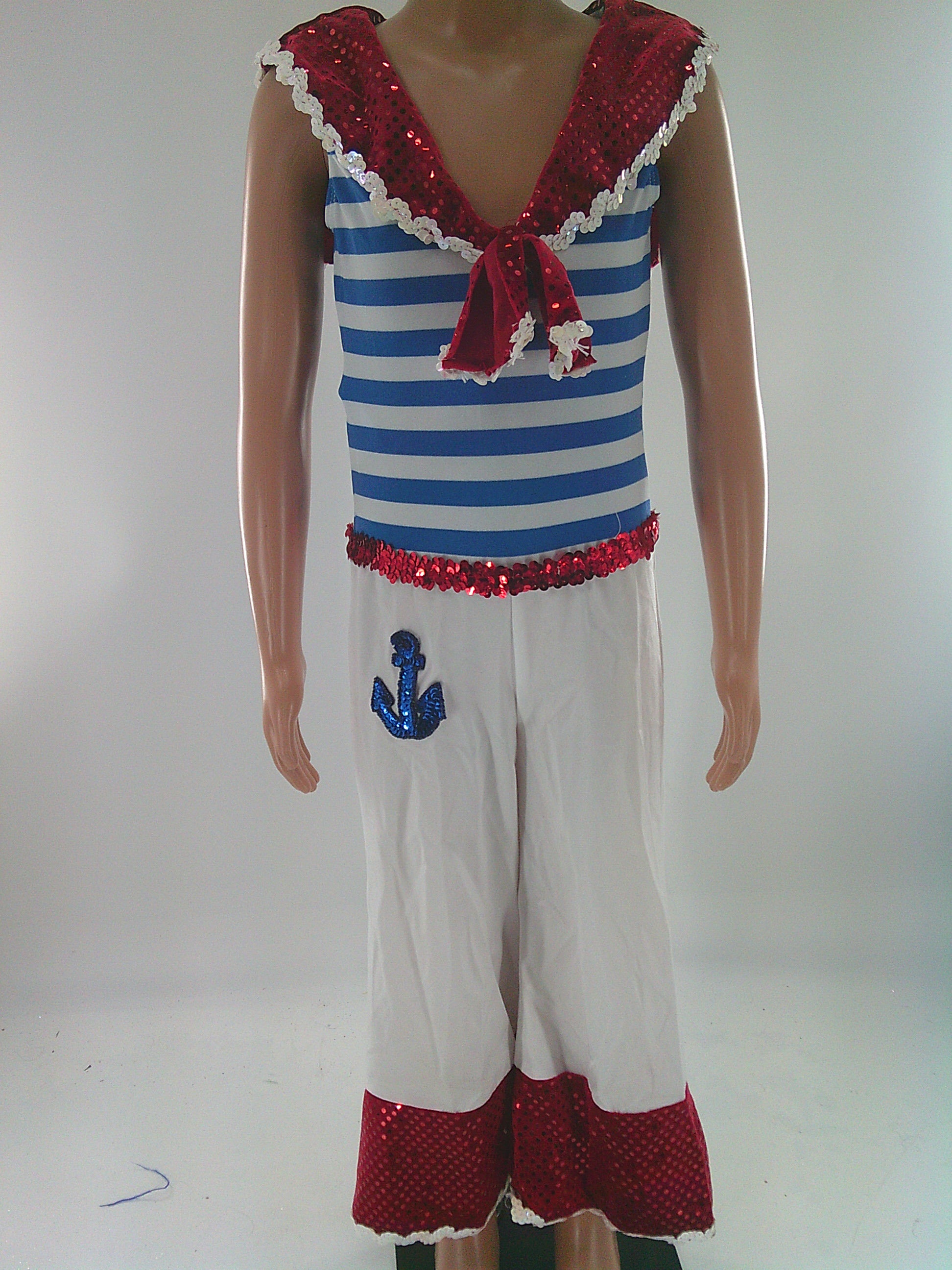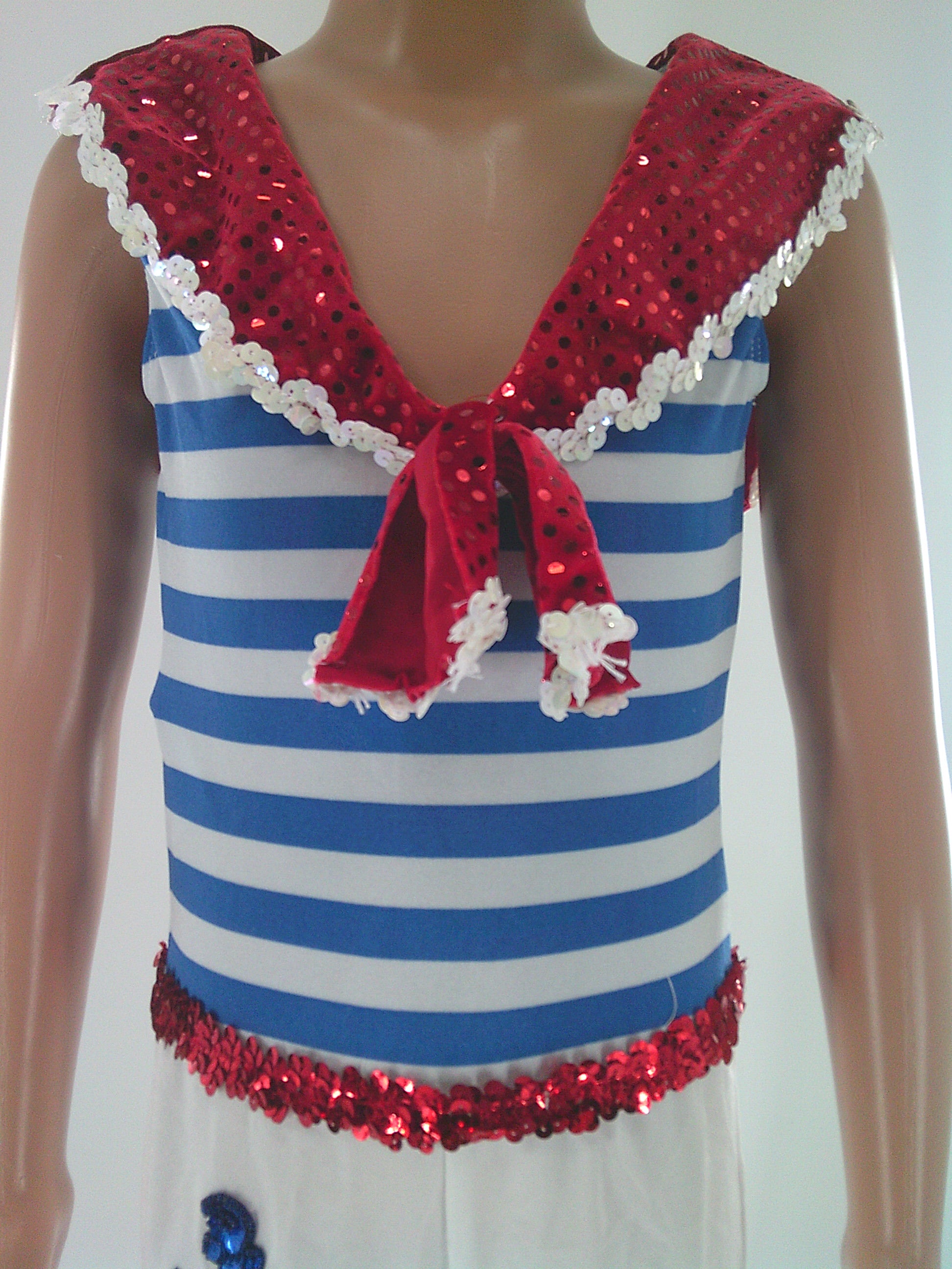 Description: Red white and blue sailor costume is just adorable. Foil dots make it sparkle and shine. Jumpsuit with striped body, attached lapel/cape along the back, anchor detail, and flared leg.