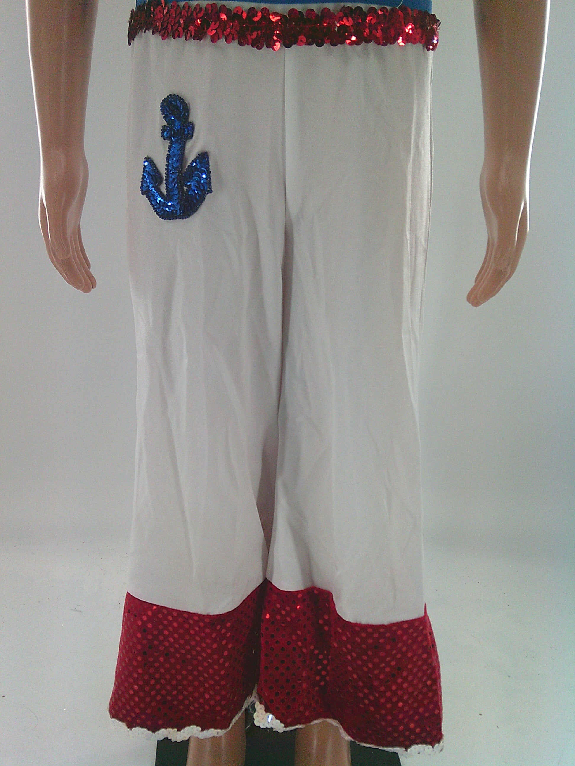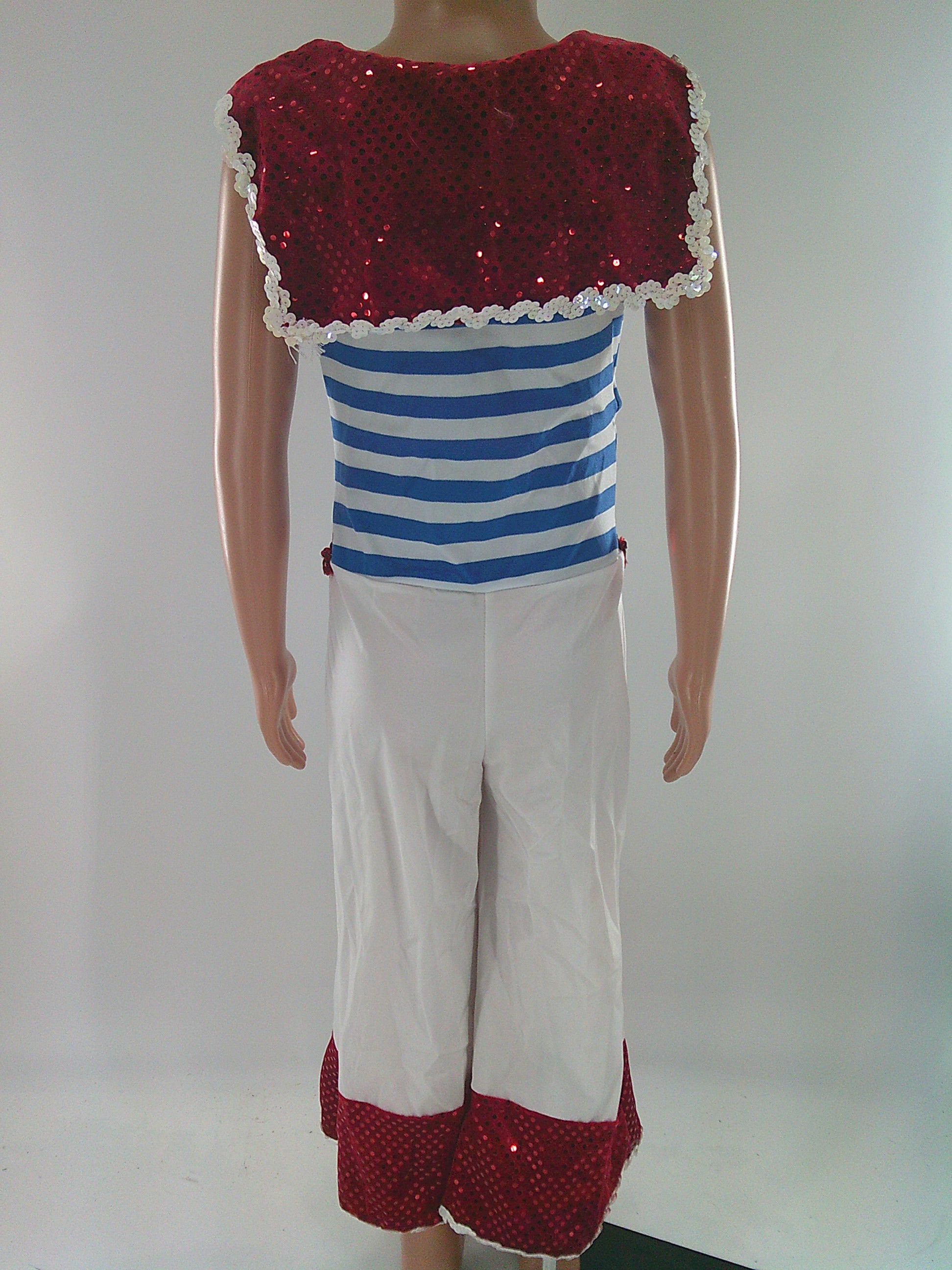 Description: Red white and blue sailor costume is just adorable. Foil dots make it sparkle and shine. Jumpsuit with striped body, attached lapel/cape along the back, anchor detail, and flared leg.