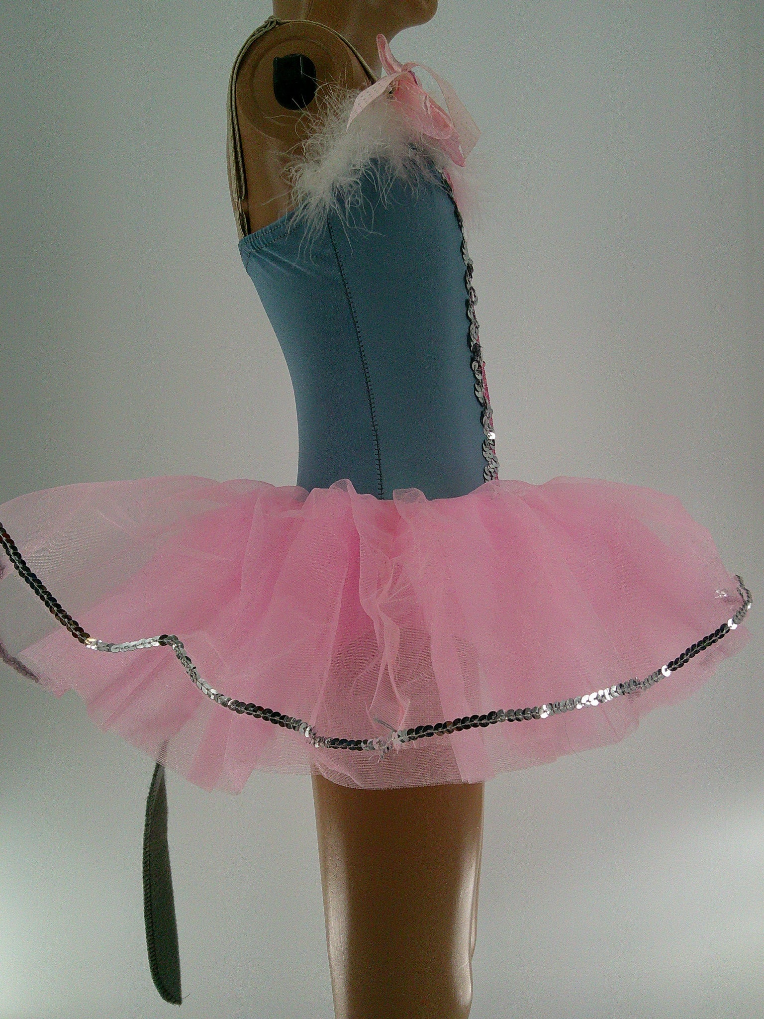 Lycra leotard with attached tutu and tail. Feather boa attached along neckine. Perfect for mouse costume.