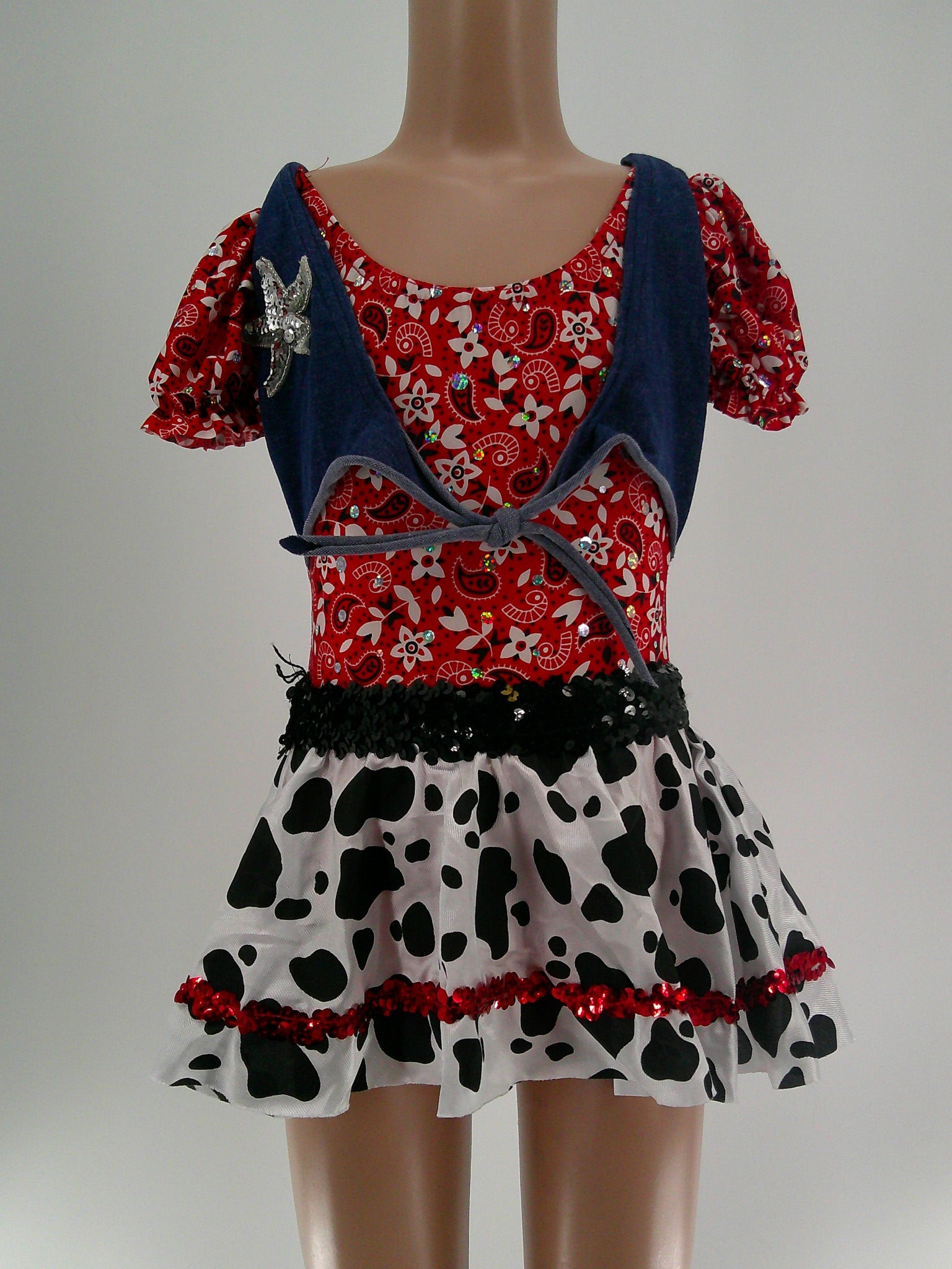 Western print, lycra leotard with attached denim vest and puffy sleeves. separate but included cow print skirt.
