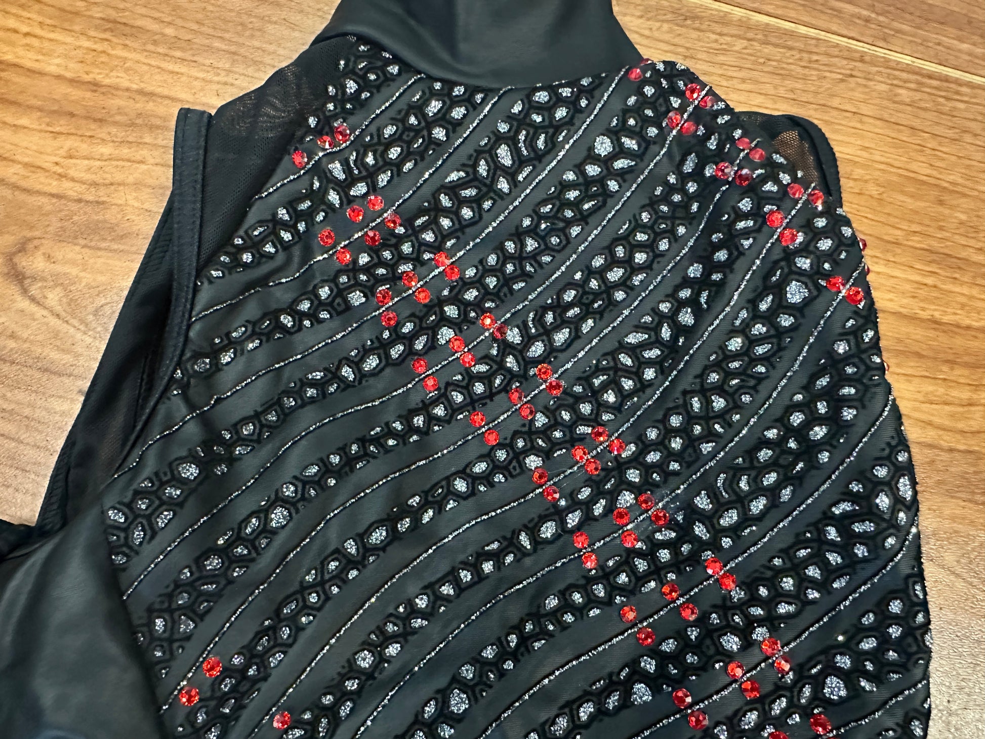 - Biketard features glitter flocked vegan leather