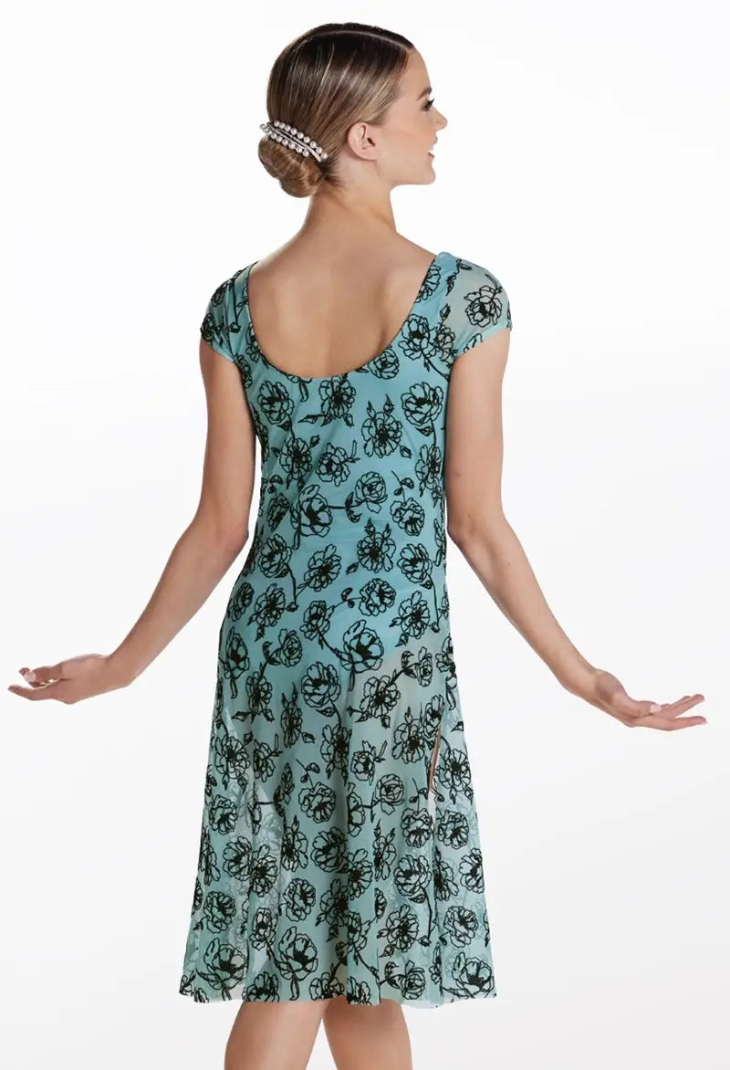 - Cap sleeve dress of flocked floral mesh with cowl neck