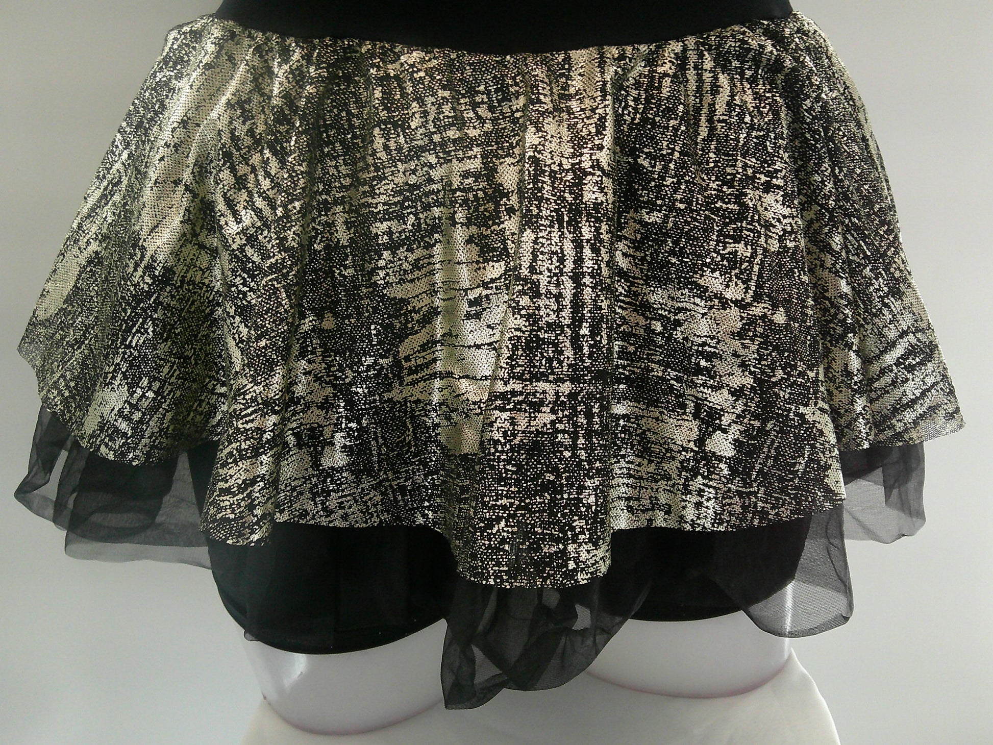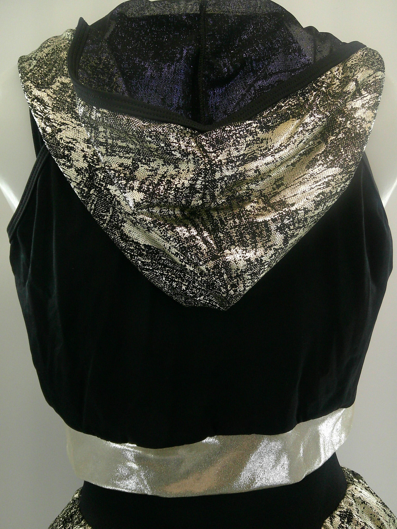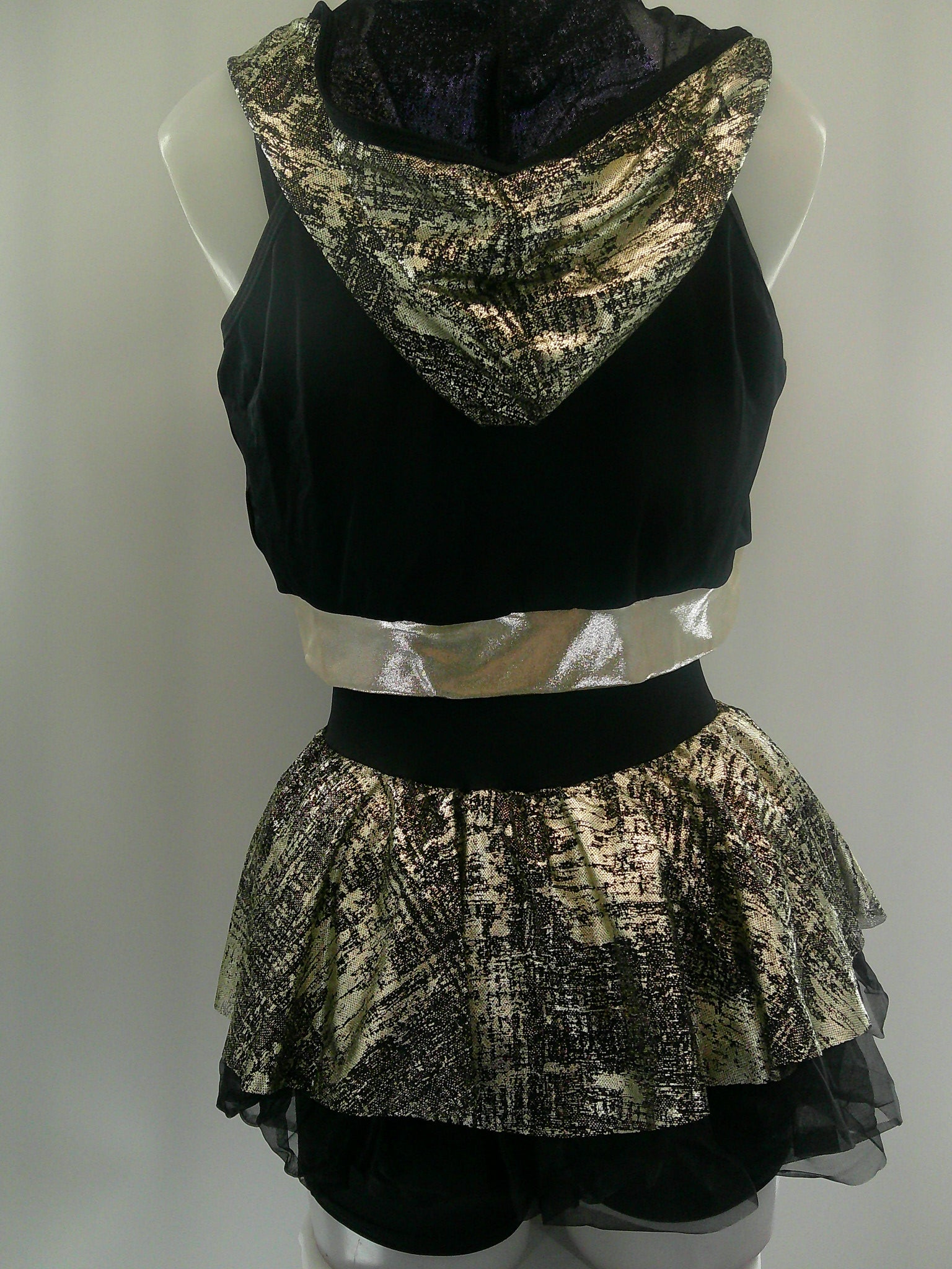 Detailed Description: Biketard with attached layered skirt and matching vest with hood. Headband included.
