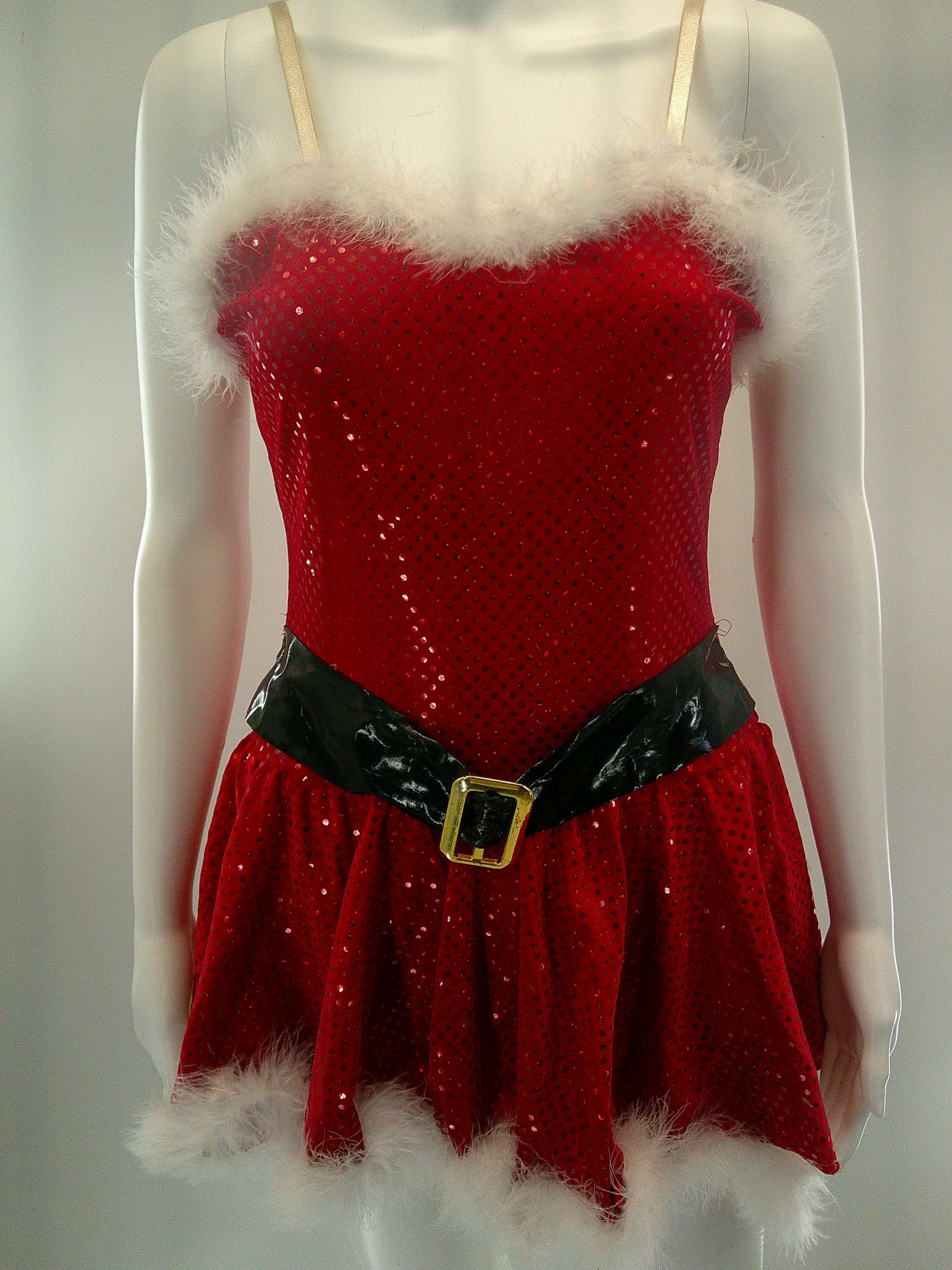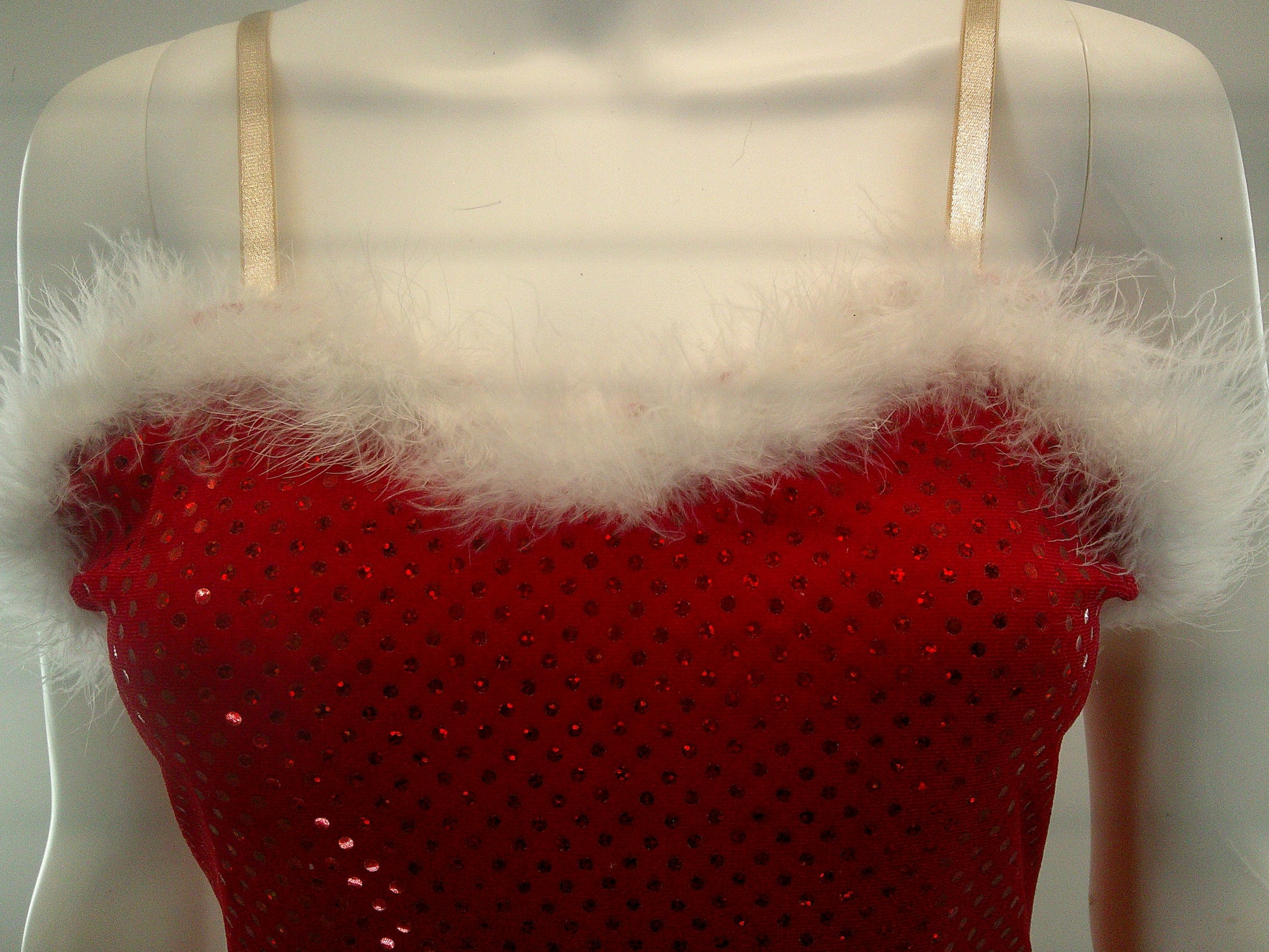 Detailed Description: Velvet leotard with attached dress and belt. Feathers along the neckline and bottom of dress. Arm mitts are included.