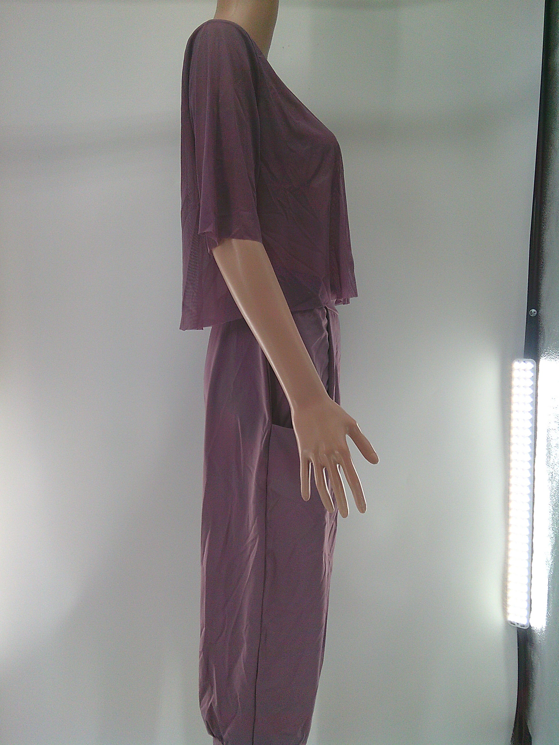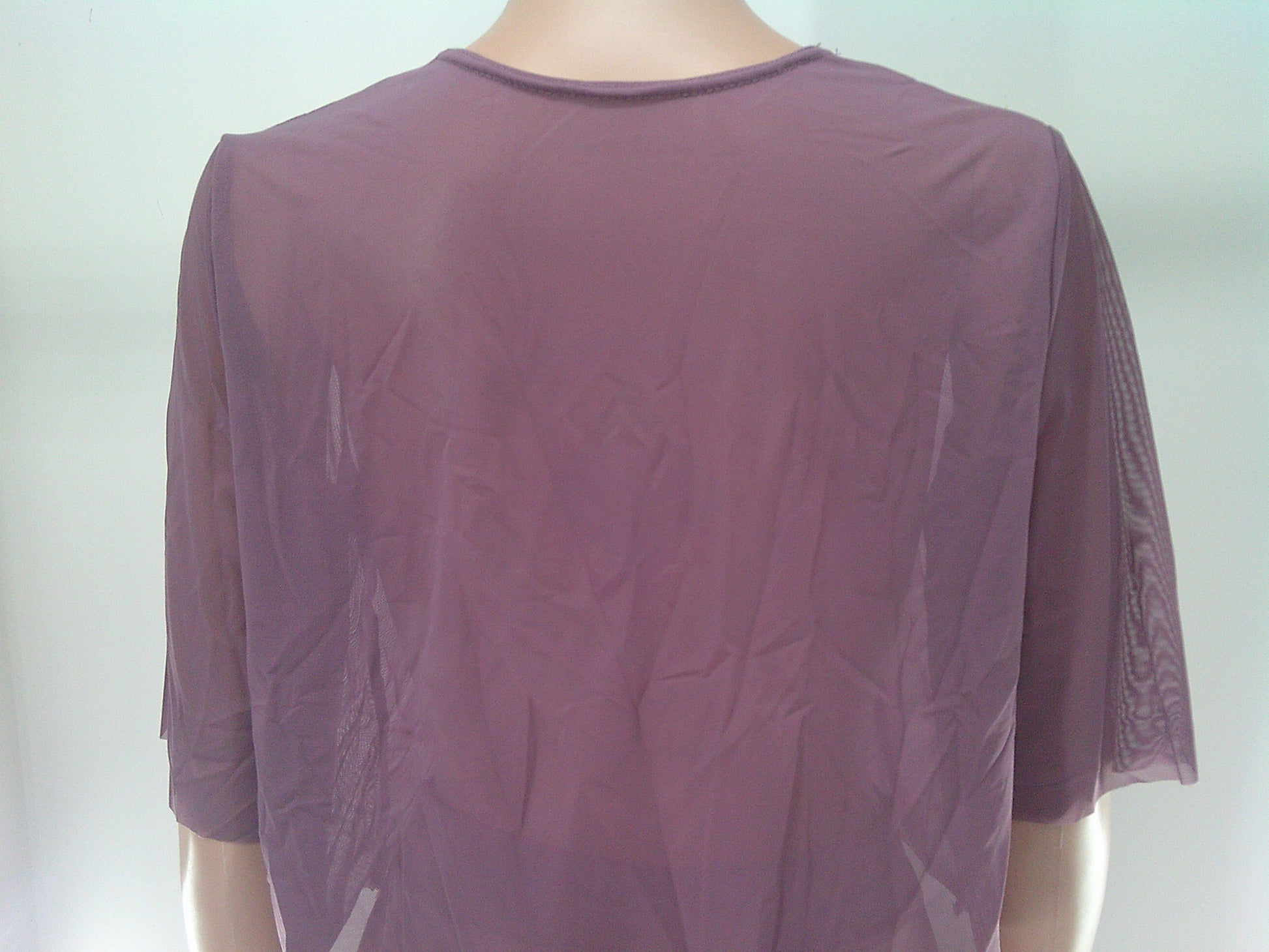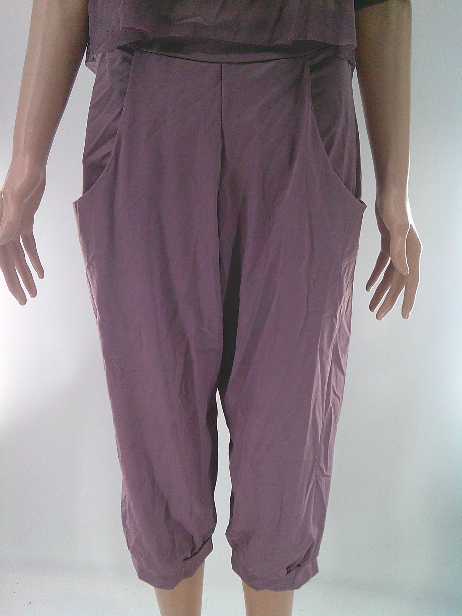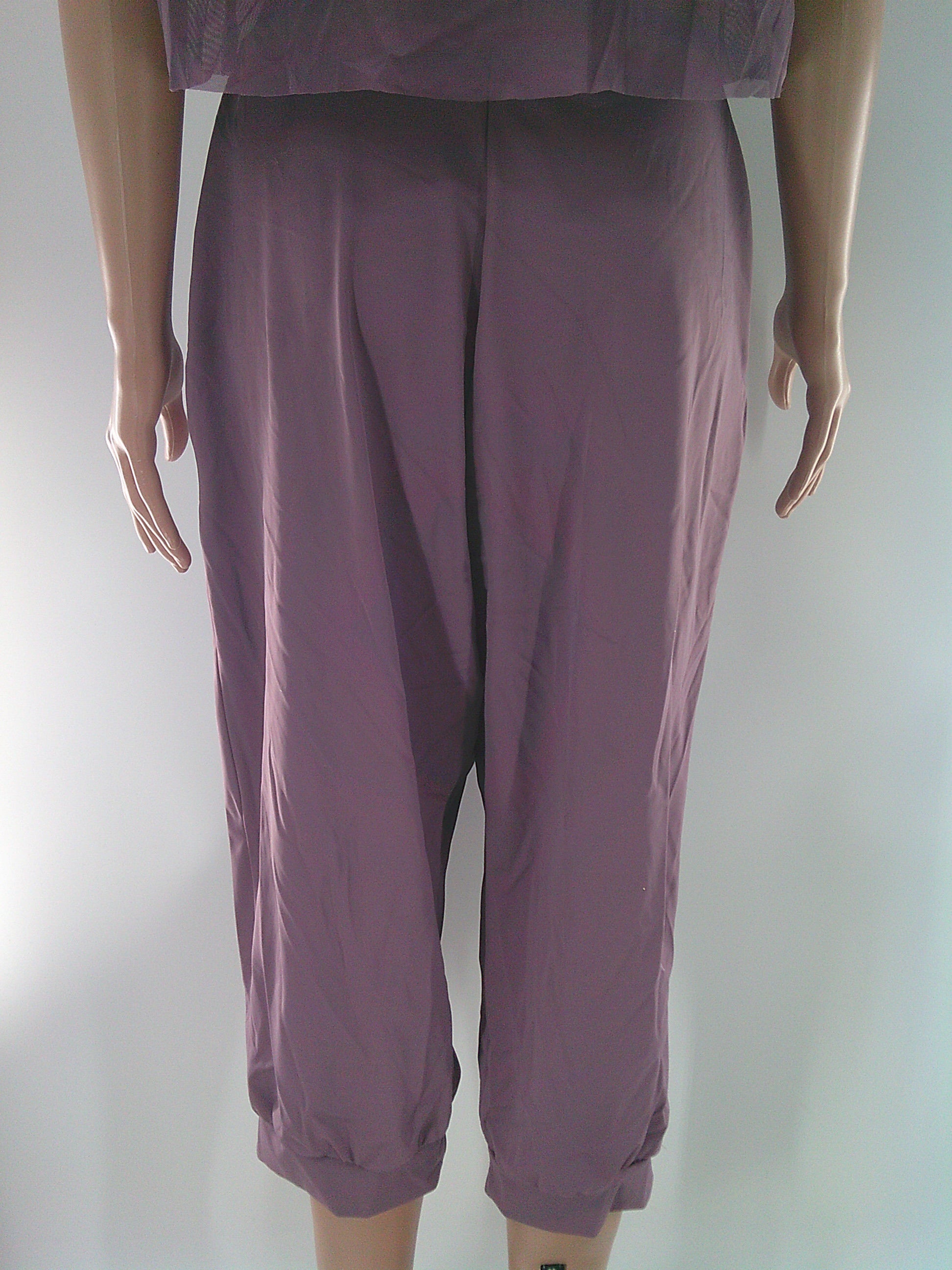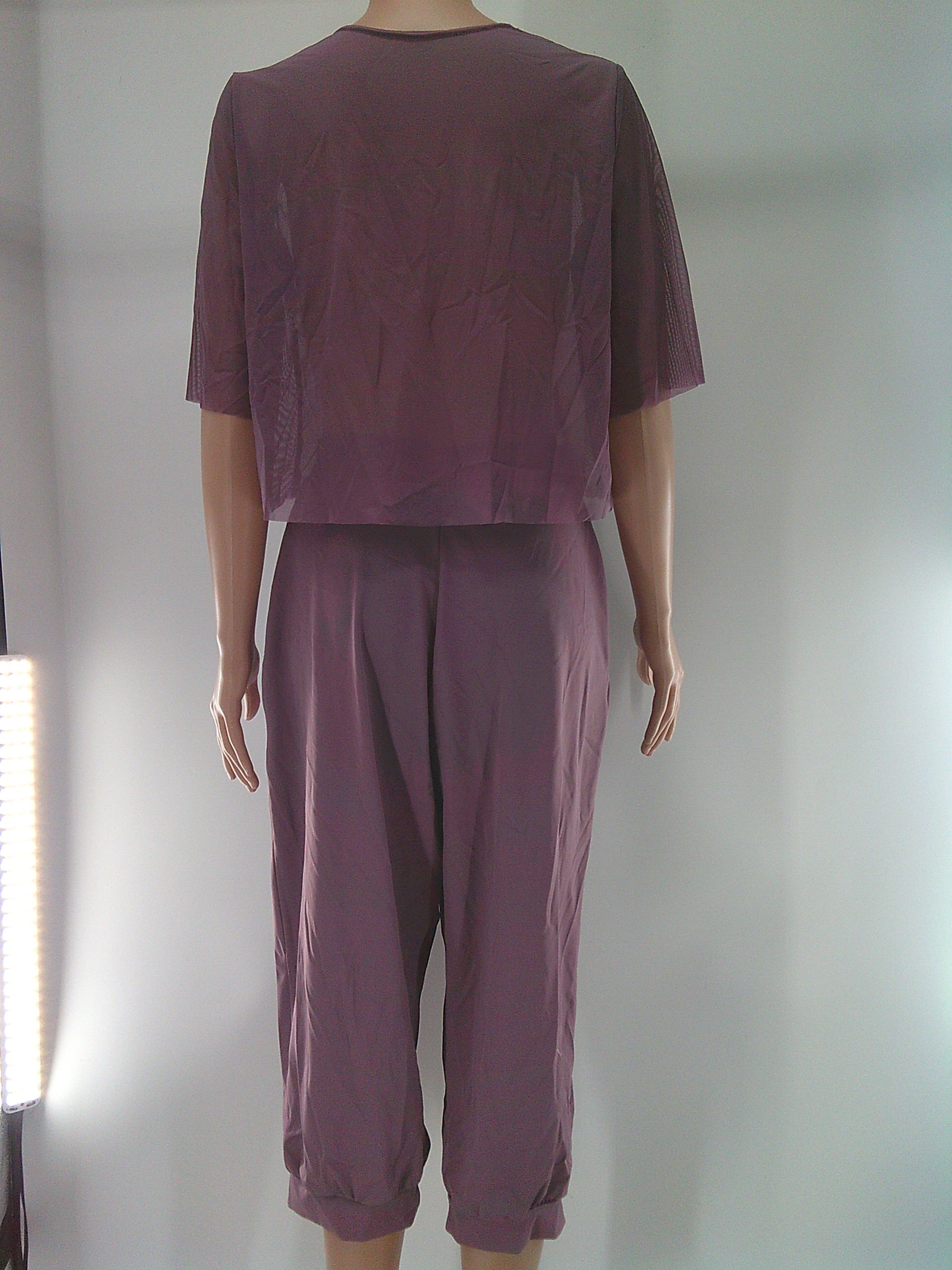 Mesh short sleeve crop top and flowy spandex pants. Does not include anything to go under the top.