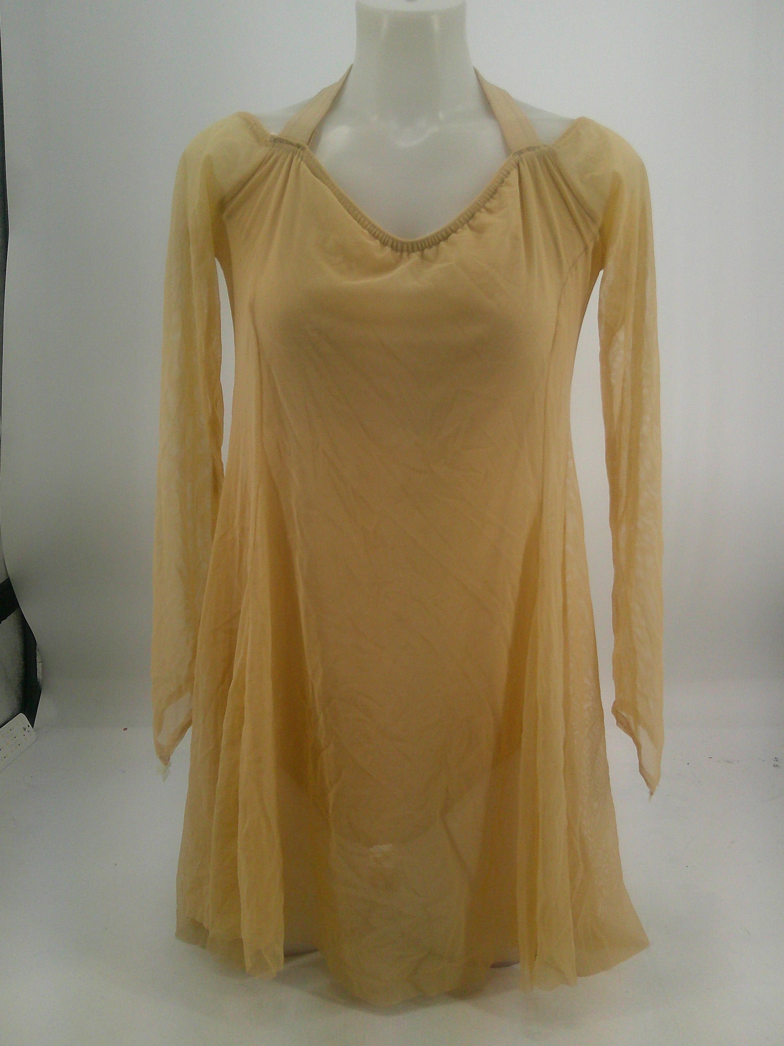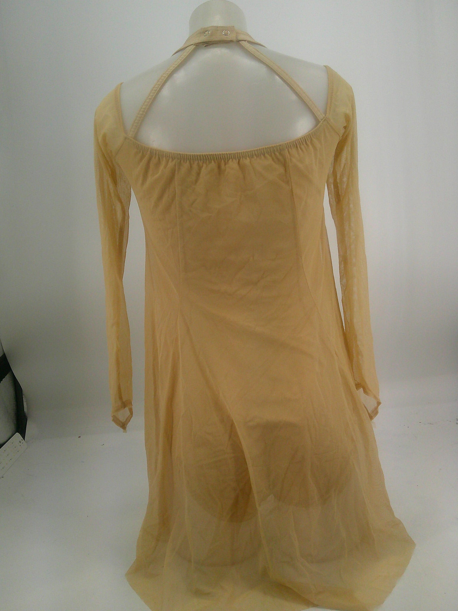 Spandex leotard with halter neckline that snaps behind the neck. Mesh overlay dress with long sleeves.