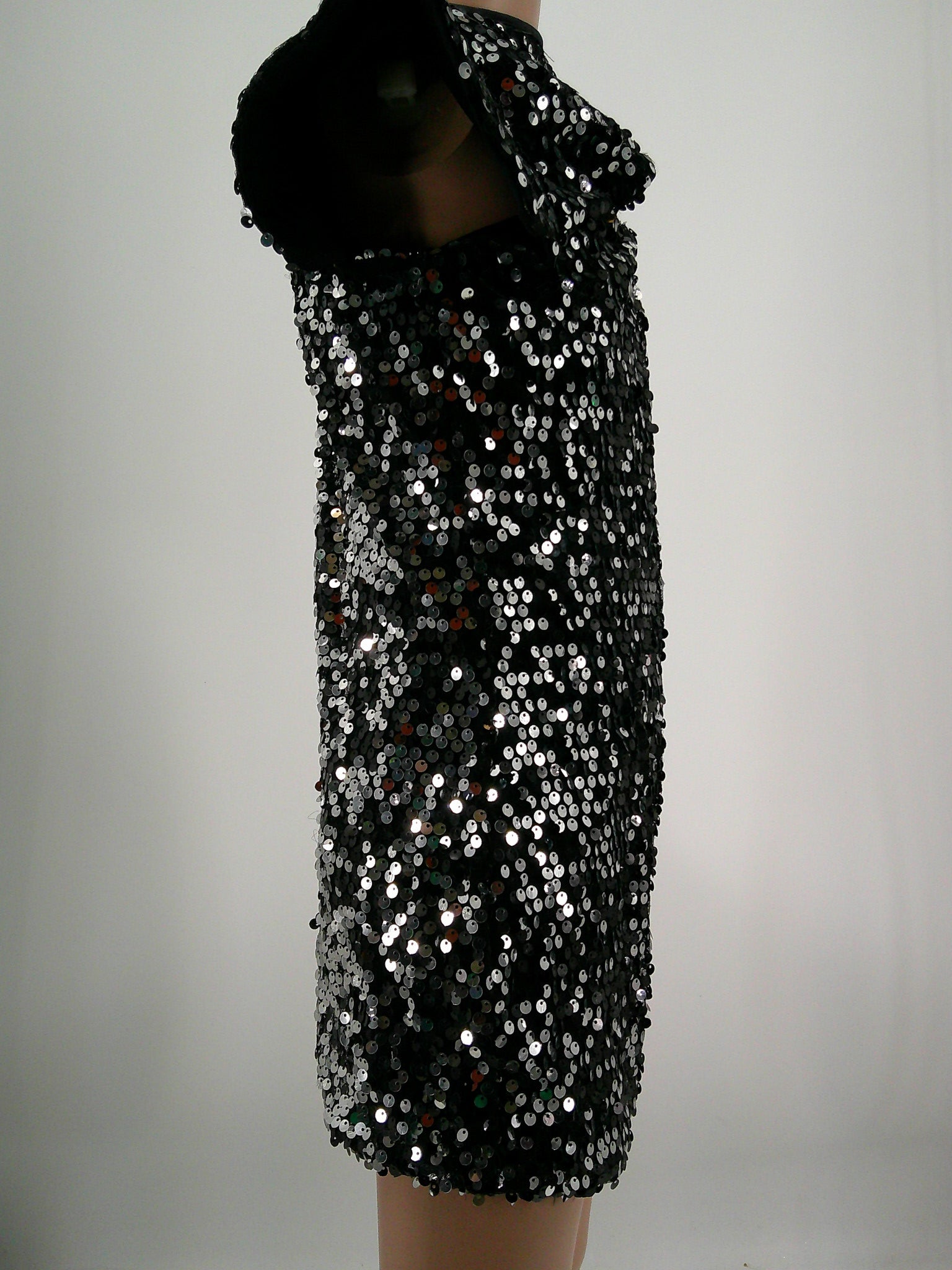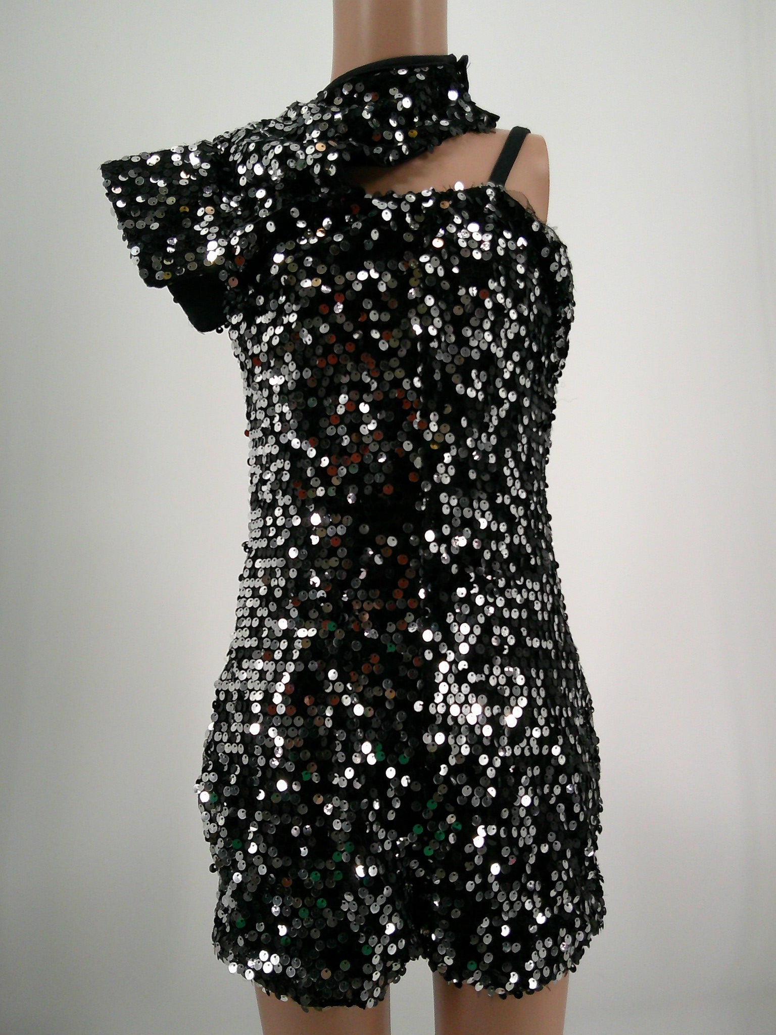 Silver and black sequin Romper with the right shoulder short sleeve connected to a mock neck and the left shoulder strap