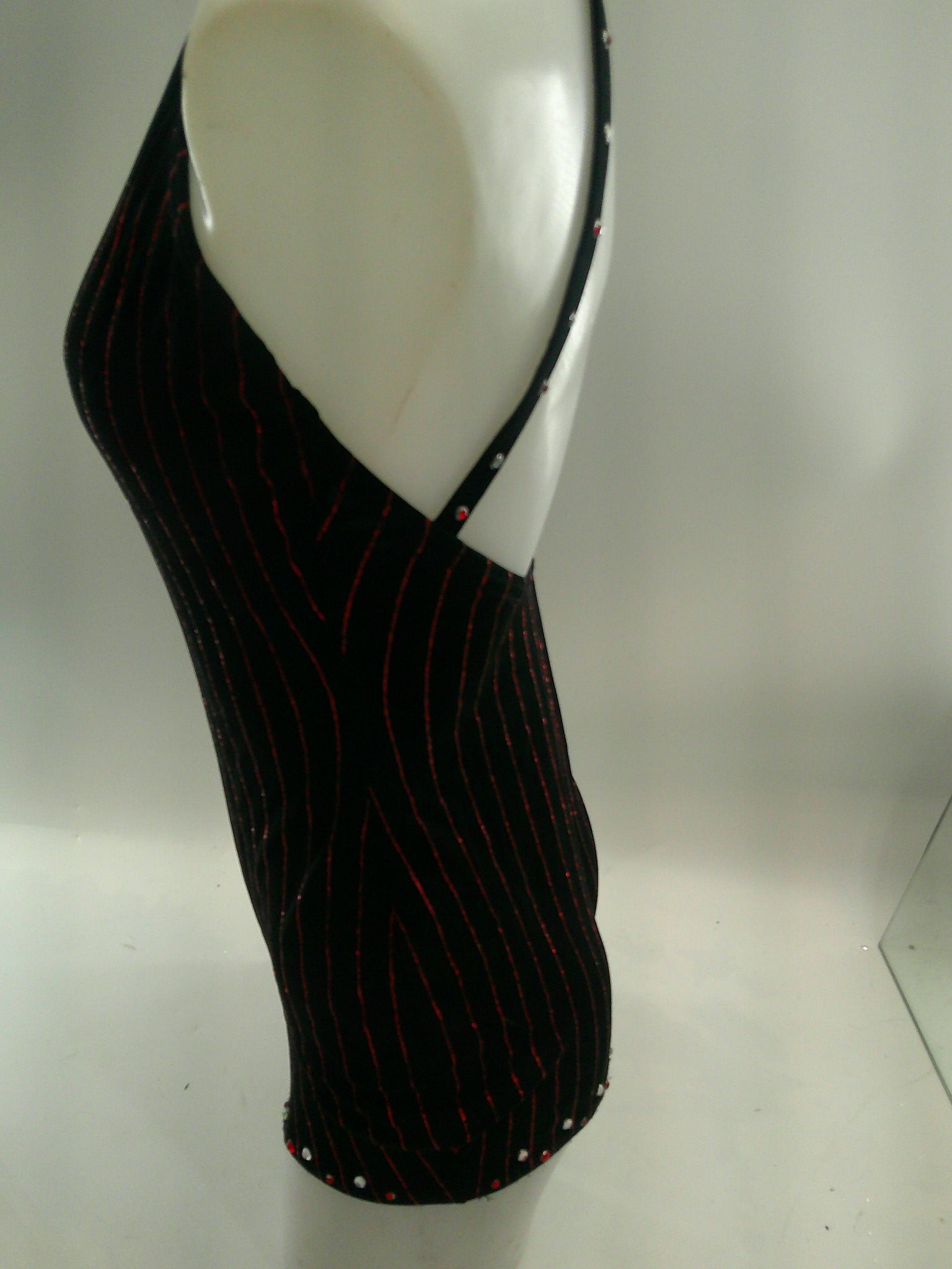 Features: Black Halter Short Unitard with red glitter pin stripes and red and clear Rhinestone accents, Snap Closure at the back of the neck and Keyhole on the front