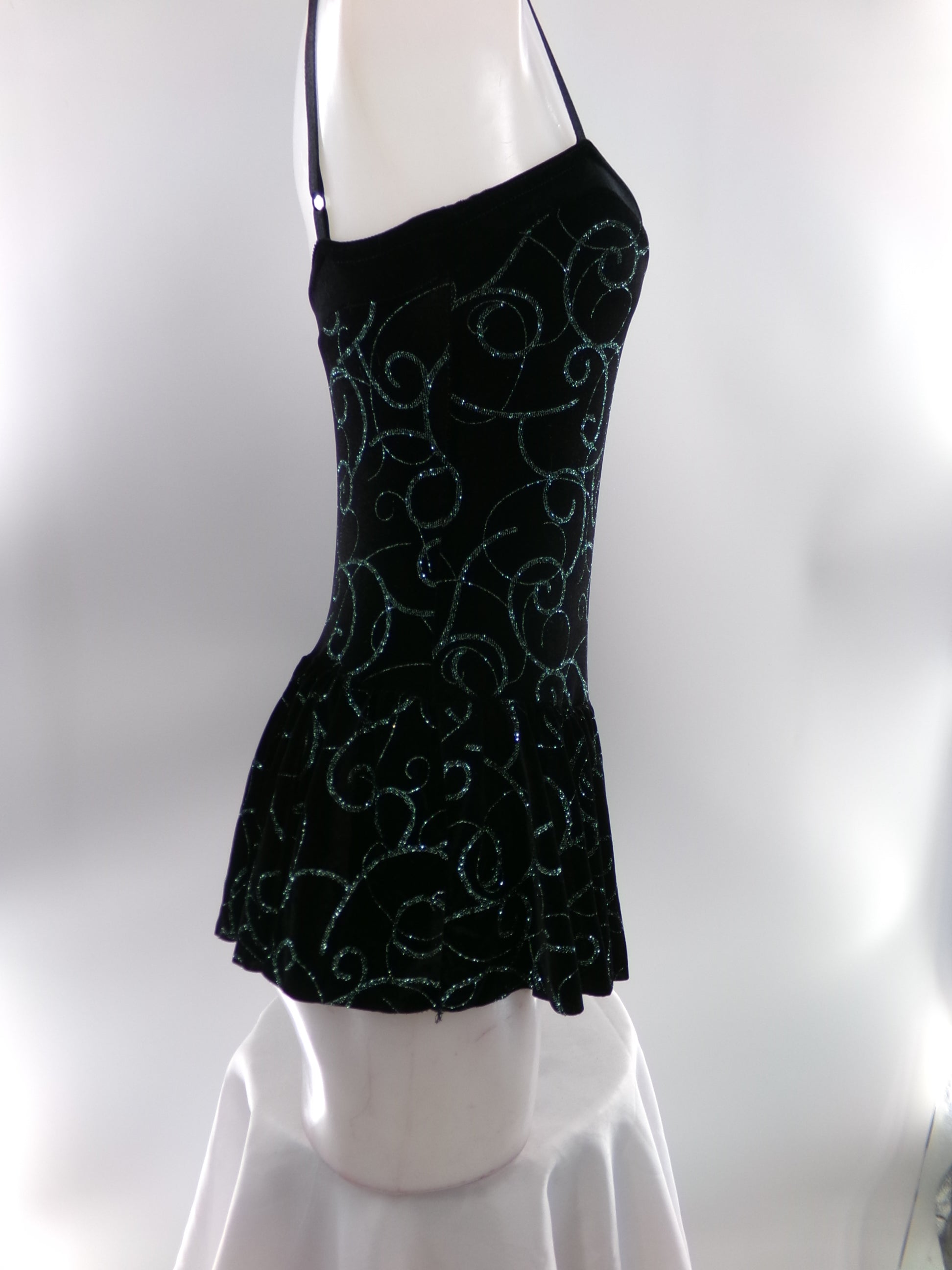 Detailed Description: Leotard with attached velvet skirt and glitter swirls. Flower pinned to waist, can be removed.
