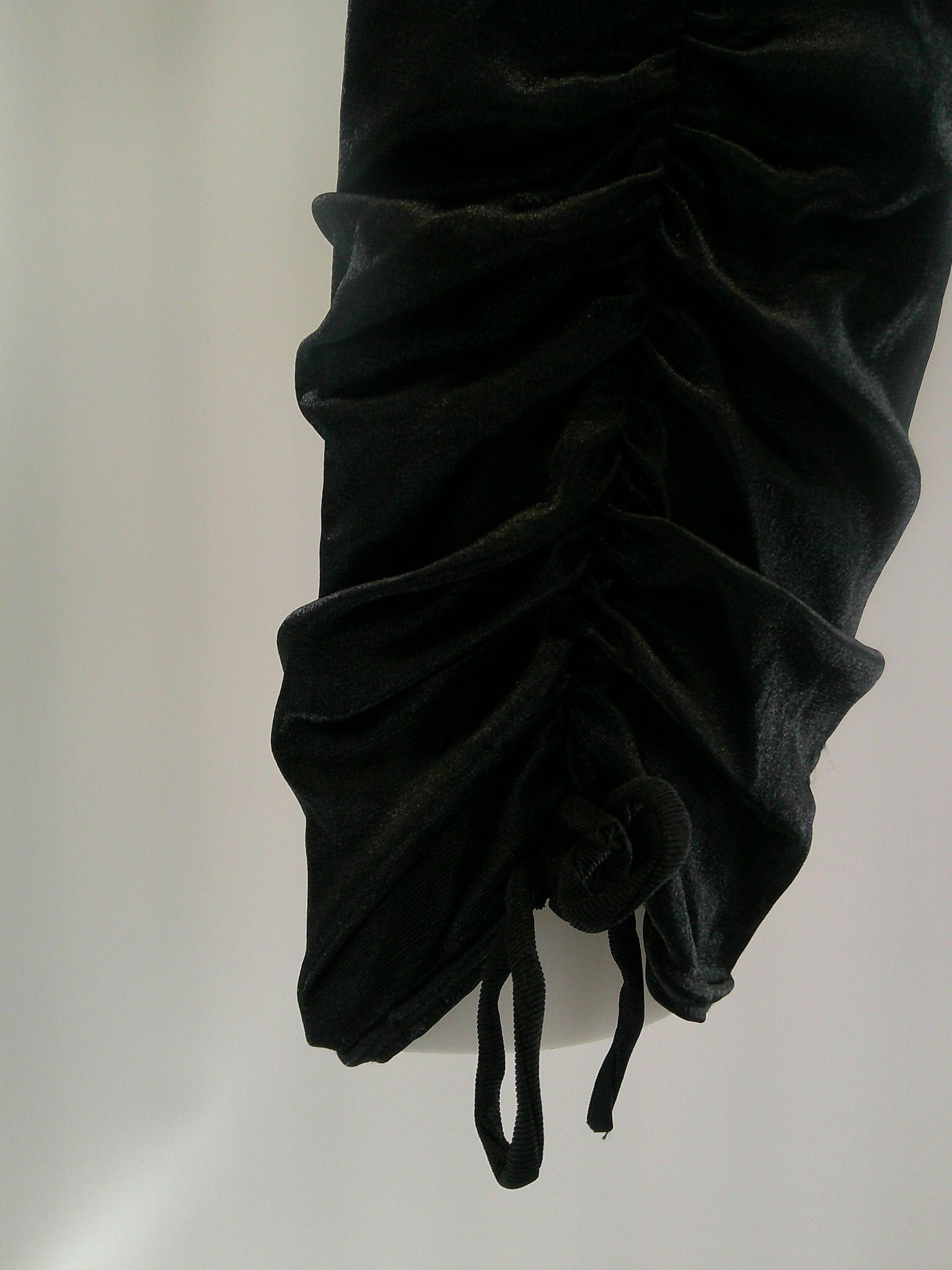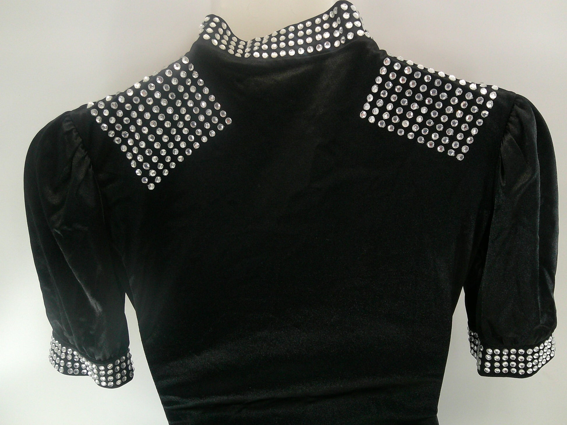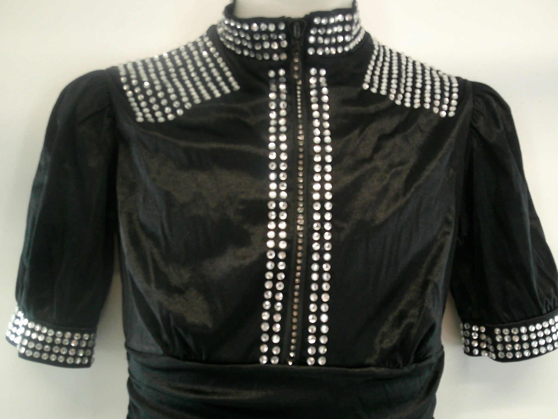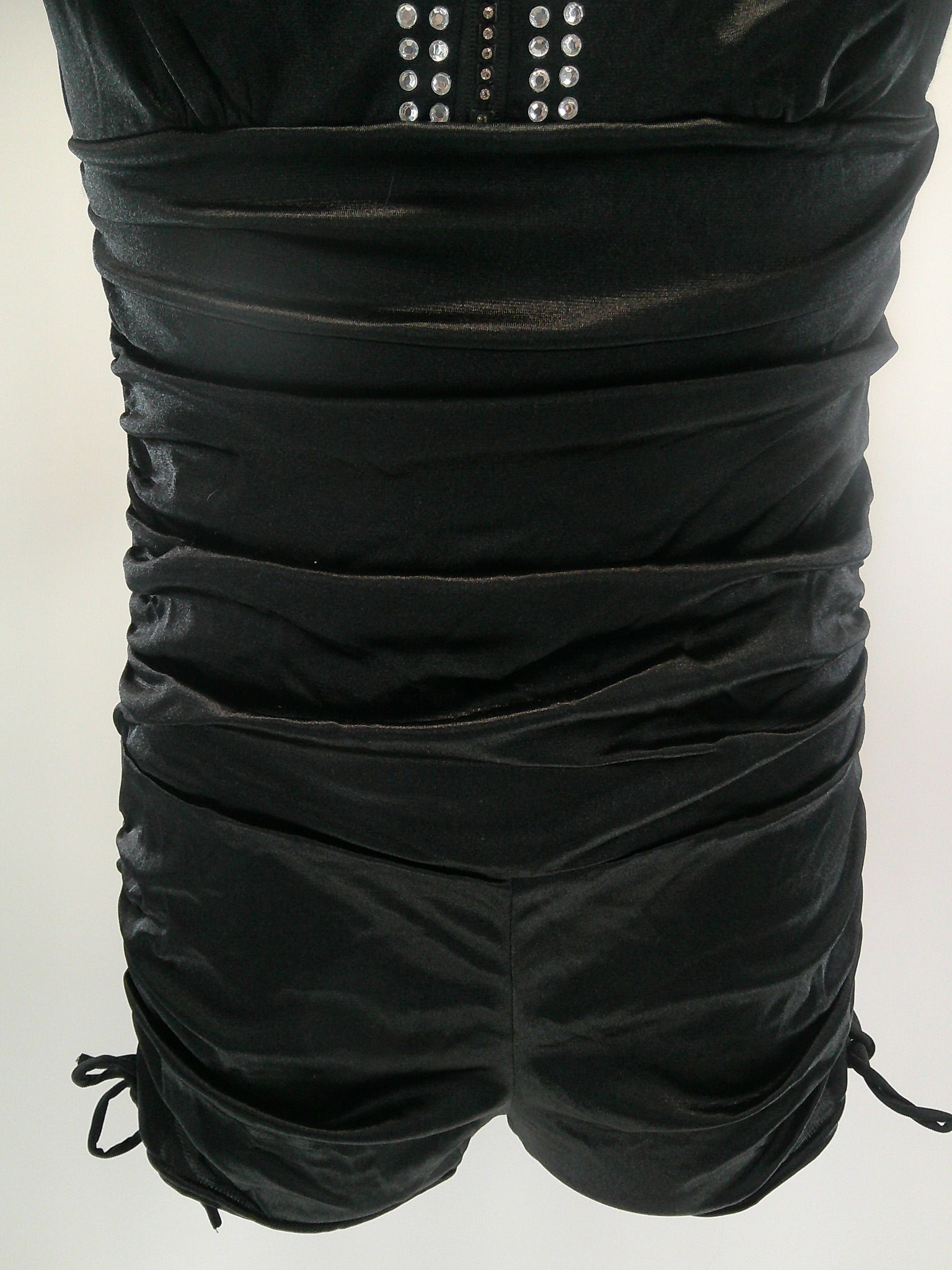 Detailed Description: Short sleeve biketard that tie along the side of the shorts. Rhinestones cover neck, shoulders and down the zipper on the back,