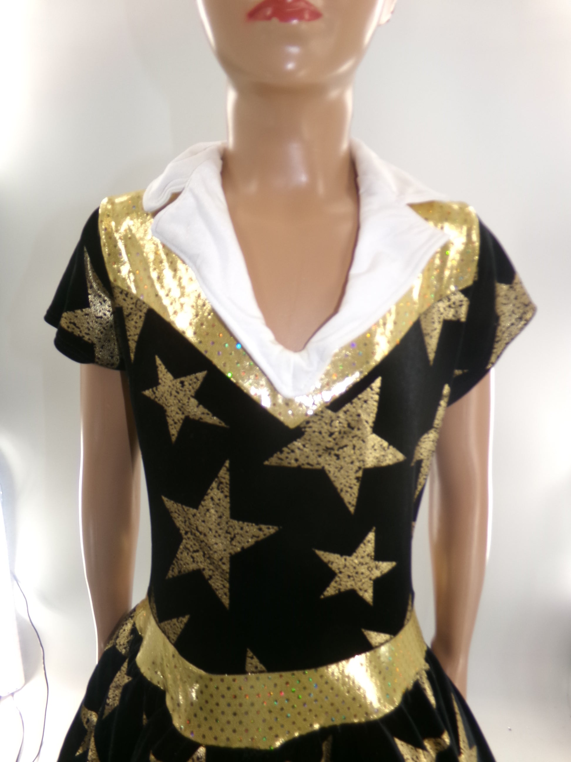 Detailed Description: Velvet leotard with attached crinoline dress. Decorated with gold stars all over. Includes fringe armbands and hair scrunchie.
